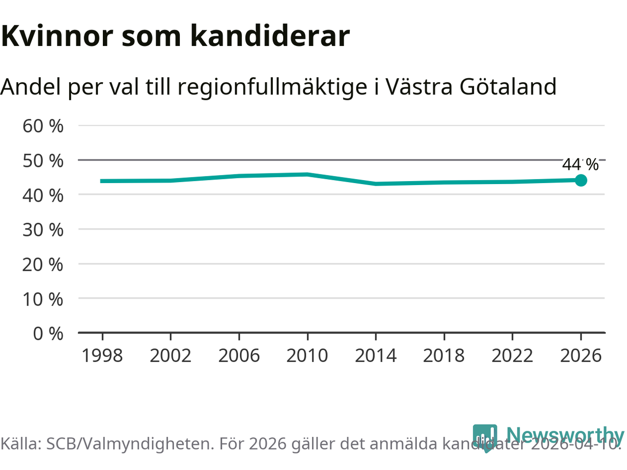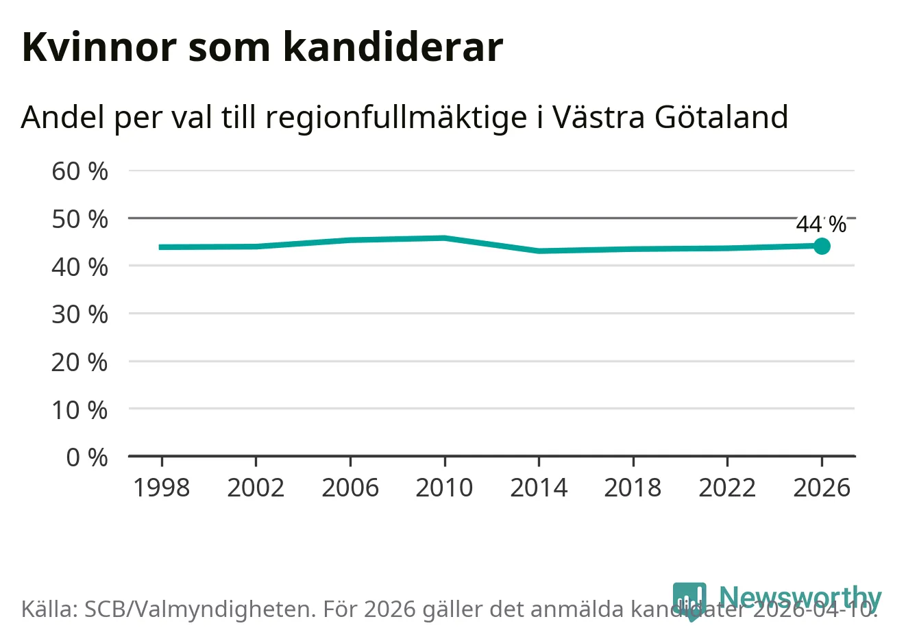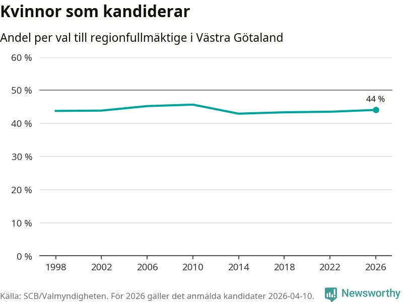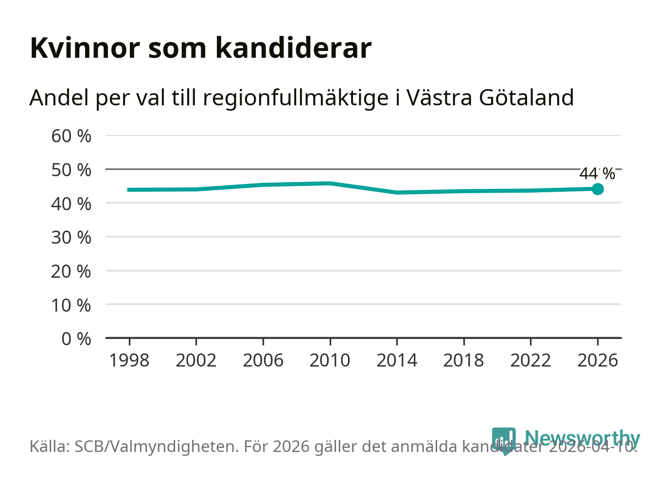 Kvinnorna utgör 44 procent av de hittills anmälda kandidaterna, vilket är den högsta andelen på listorna till regionfullmäktige i Västra Götalandsregionen sedan valet 2010. Andelen kvinnor har ökat i Västra Götalandsregionen under de senaste två valen och ökningen ser alltså ut att fortsätta i år. Västra Götaland är en av 20 regioner i landet där männen utgör en majoritet av kandidaterna på listorna.