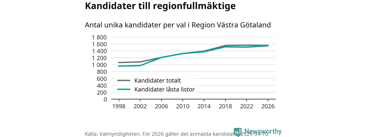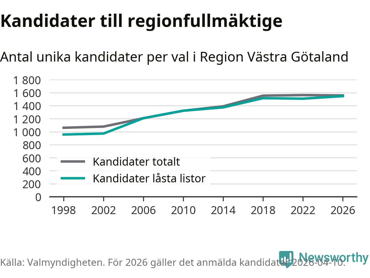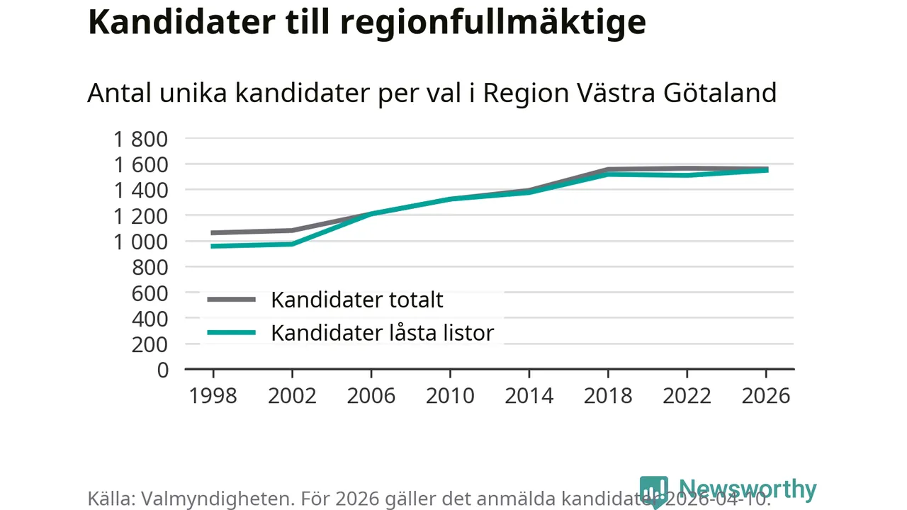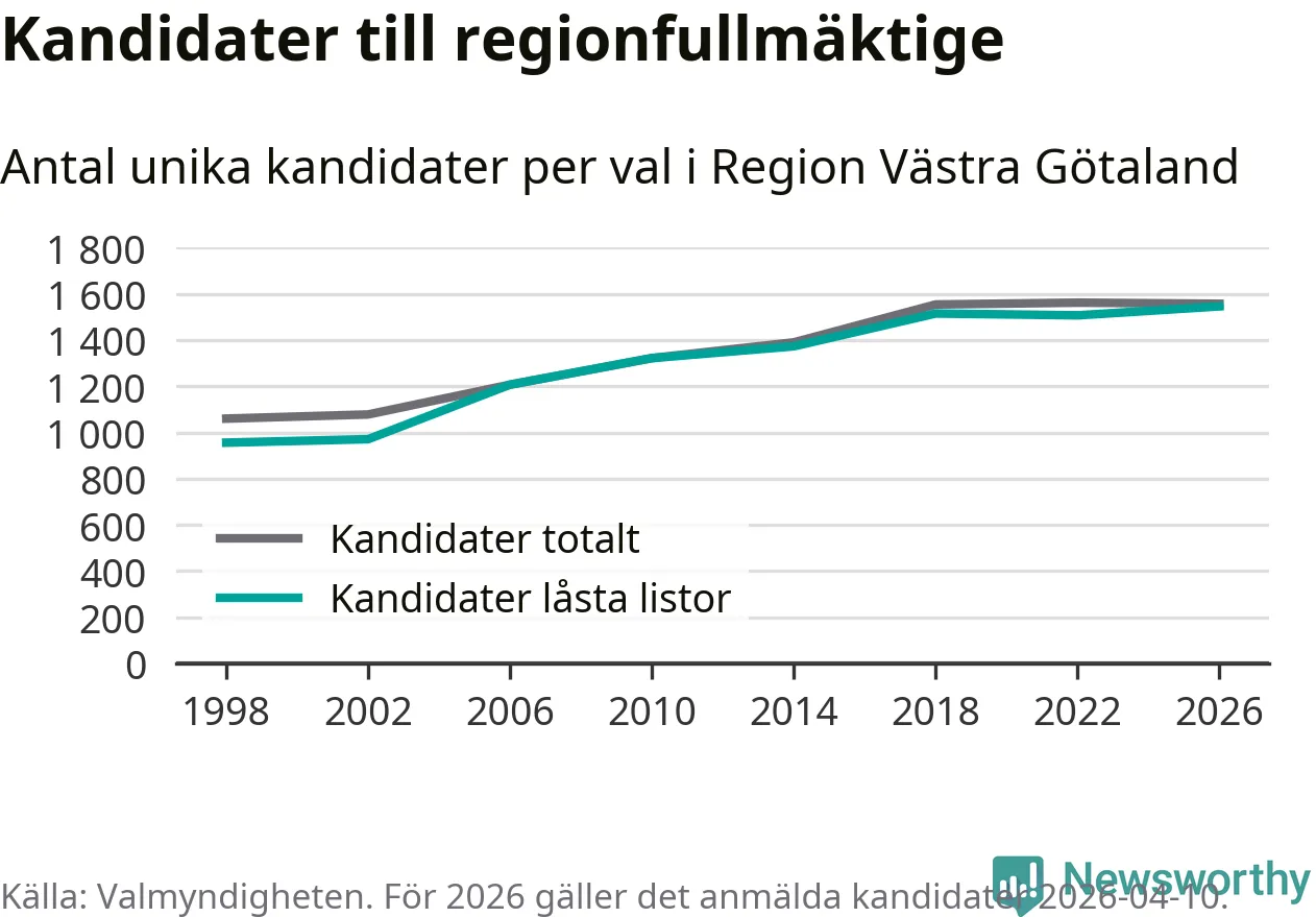 På torsdagen var det deadline för partier med låsta listor att registrera sina kandidater inför höstens val. Till valet till regionfullmäktige i Västra Götalandsregionen är 1 546 kandidater anmälda på sådana listor, vilket är 39 fler än i valet 2022. Det är den högsta siffran sedan åtminstone valet 1998, vilket är så långt tillbaka som vi har statistik för.