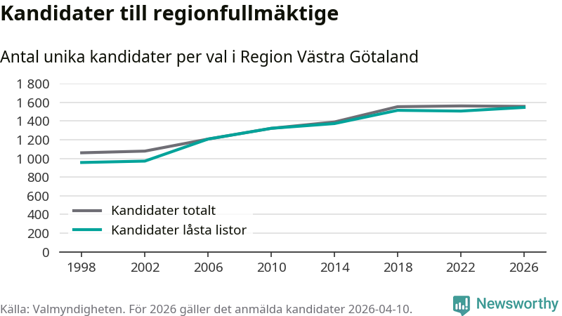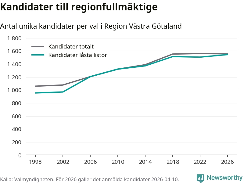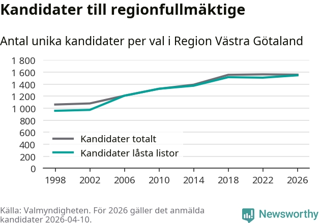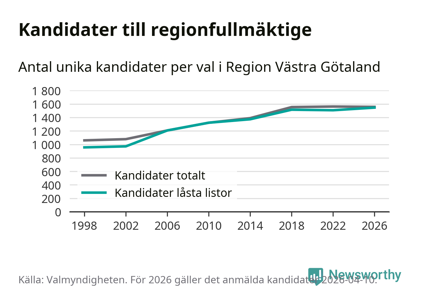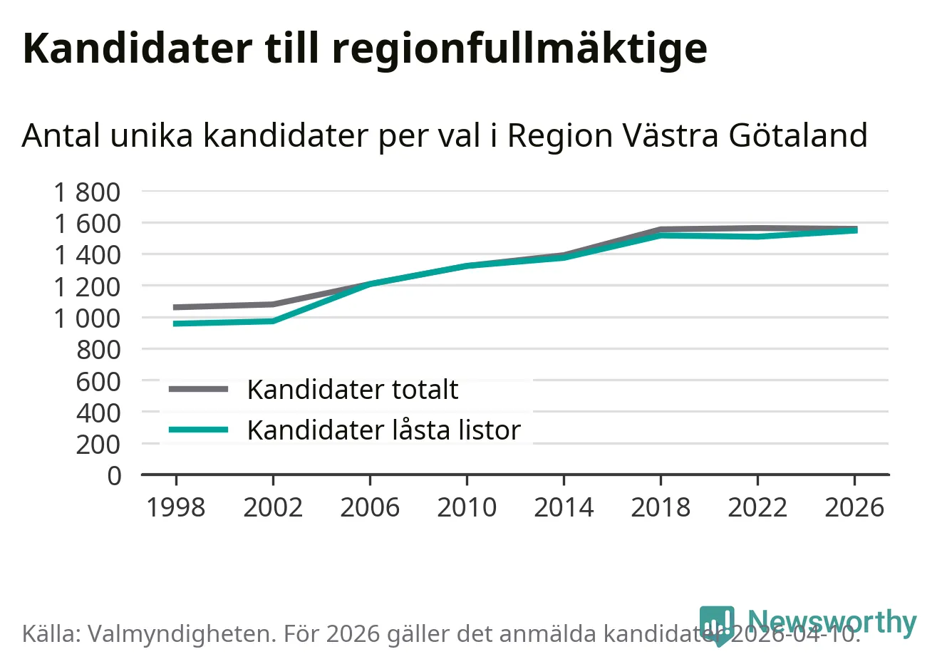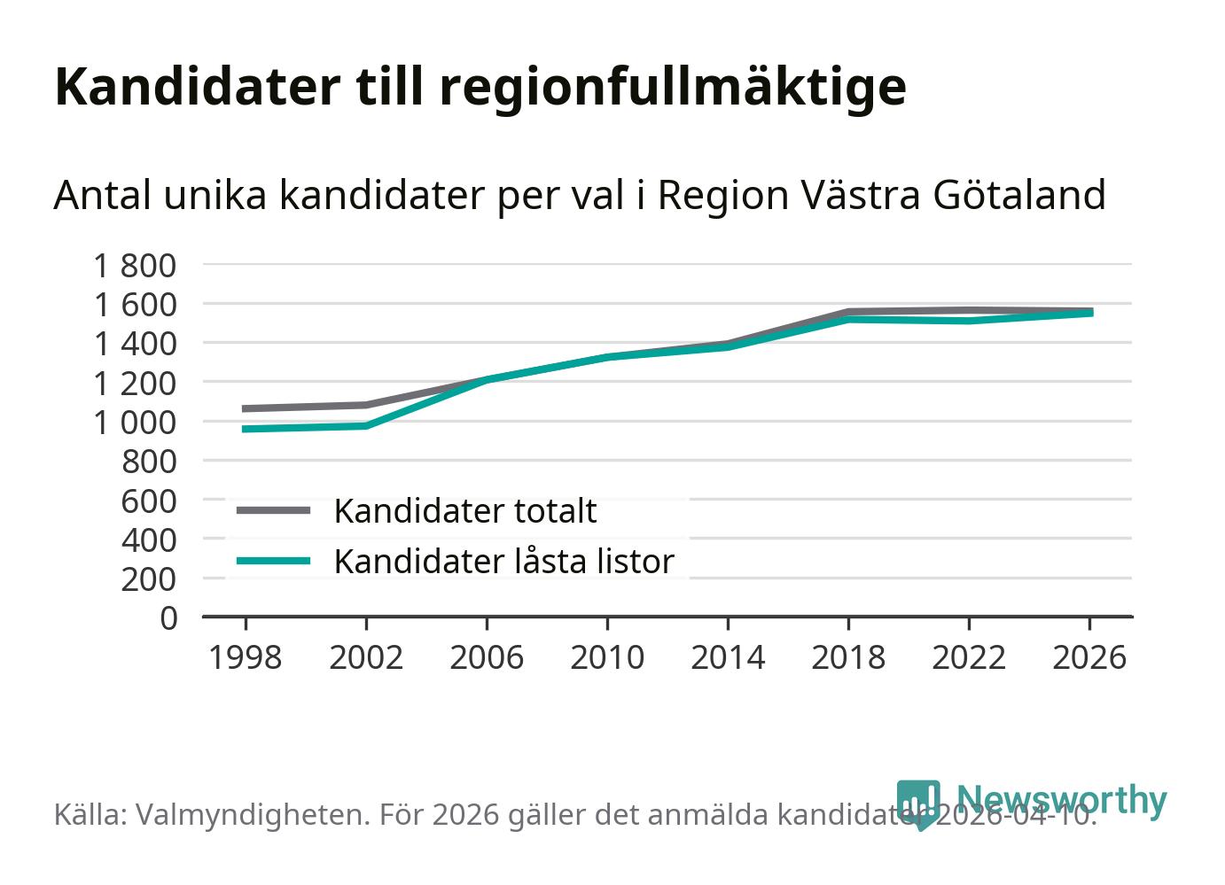 På torsdagen var det deadline för partier med låsta listor att registrera sina kandidater inför höstens val. Till valet till regionfullmäktige i Västra Götalandsregionen är 1 546 kandidater anmälda på sådana listor, vilket är 39 fler än i valet 2022. Det är den högsta siffran sedan åtminstone valet 1998, vilket är så långt tillbaka som vi har statistik för.