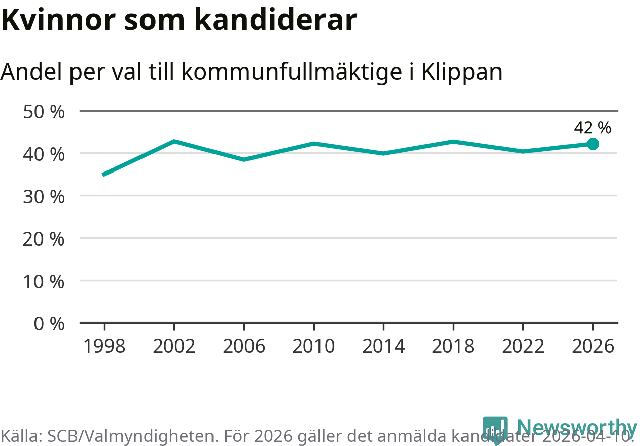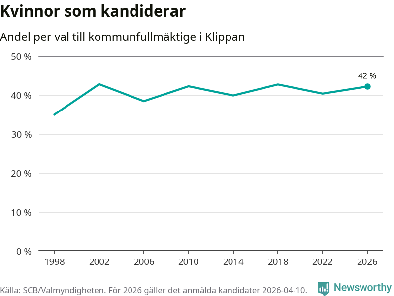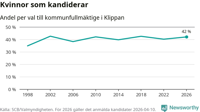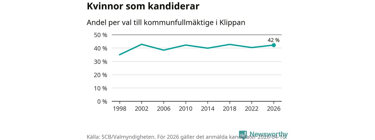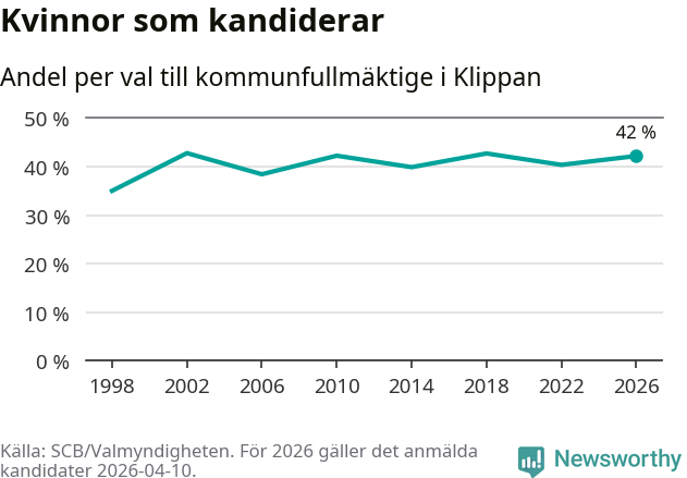Kvinnorna utgör 42 procent av de hittills anmälda kandidaterna. Vid valet 2002 var 43 procent kvinnor, valet 1998 var motsvarande siffra 35 procent. Klippan är en av 264 kommuner i landet där männen utgör en majoritet av kandidaterna på listorna.