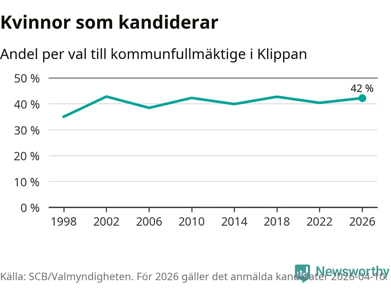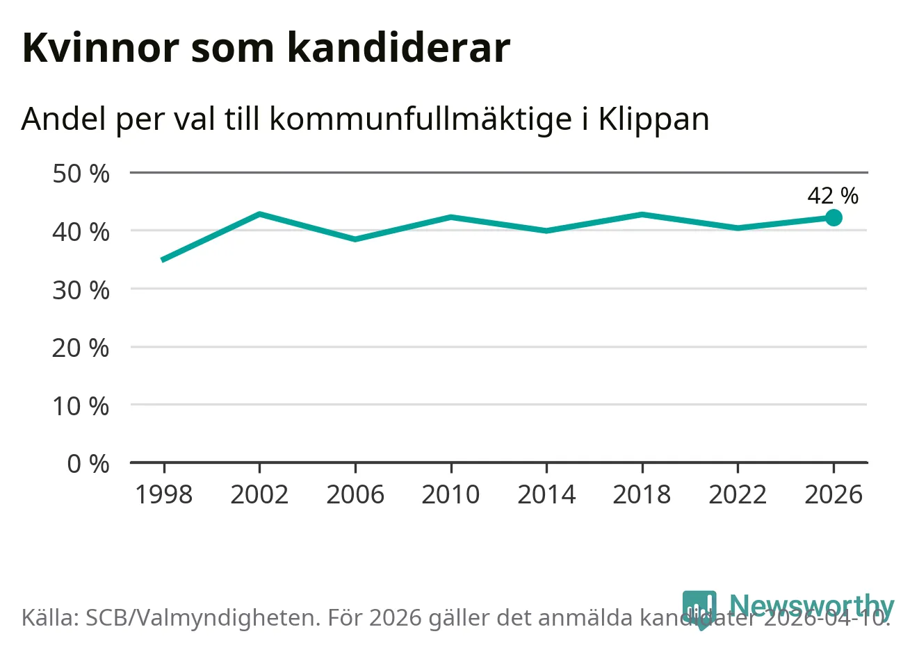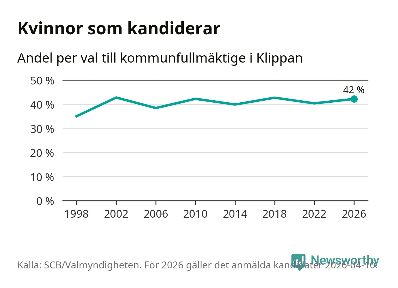 Kvinnorna utgör 42 procent av de hittills anmälda kandidaterna. Vid valet 2002 var 43 procent kvinnor, valet 1998 var motsvarande siffra 35 procent. Klippan är en av 264 kommuner i landet där männen utgör en majoritet av kandidaterna på listorna.