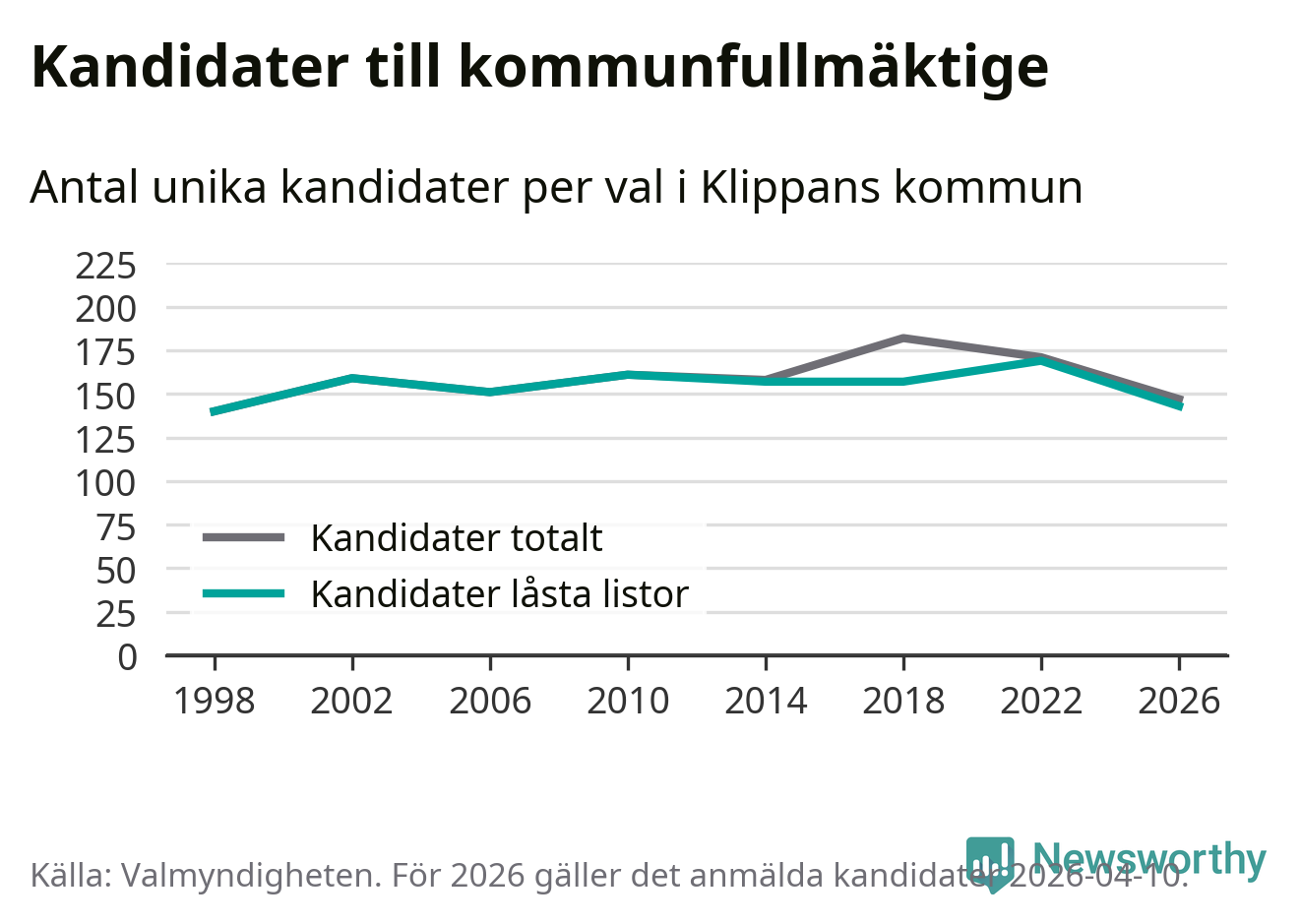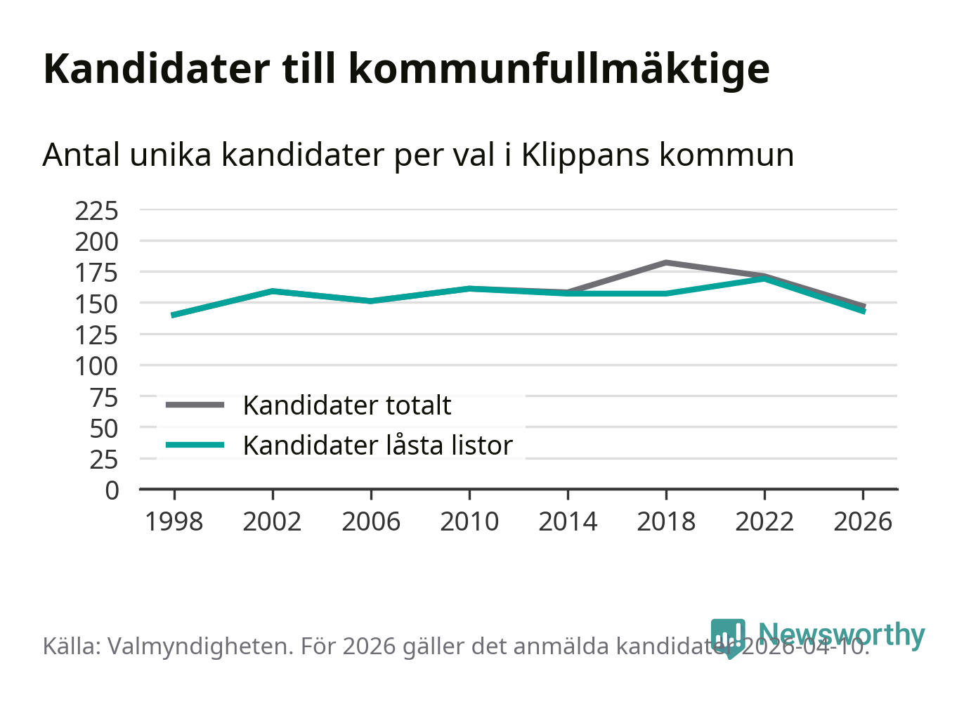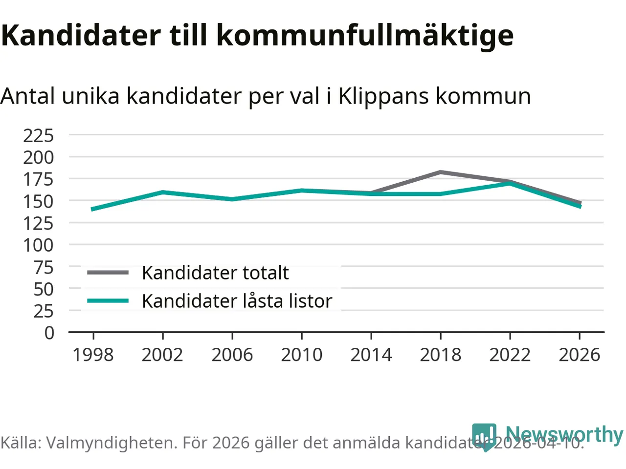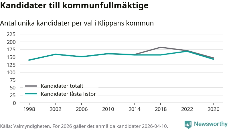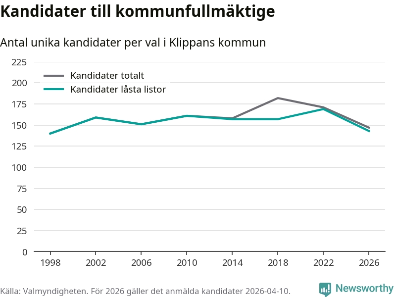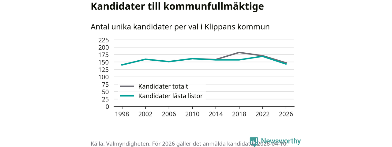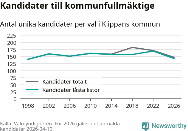 På torsdagen var det deadline för partier med låsta listor att registrera sina kandidater inför höstens val. Till valet till kommunfullmäktige i Klippan är 143 kandidater anmälda på sådana listor, vilket är 26 färre än i valet 2022.