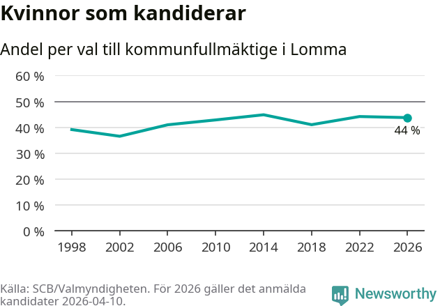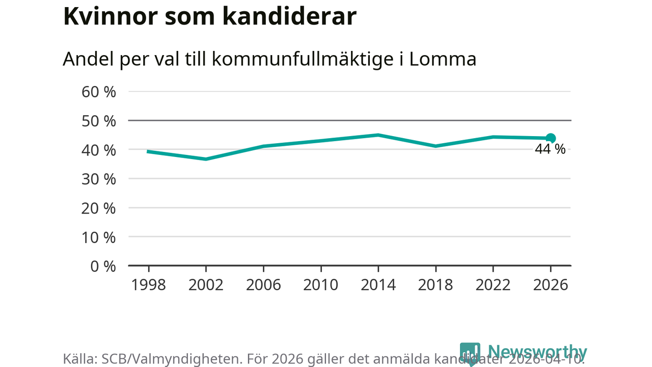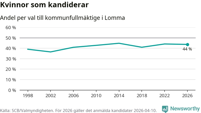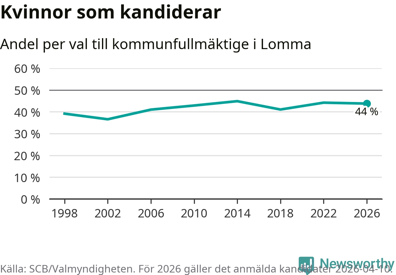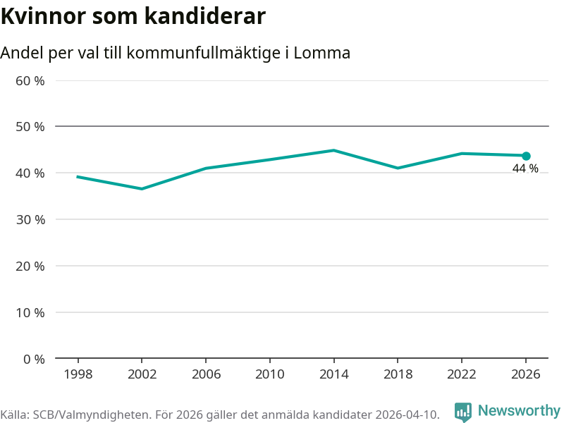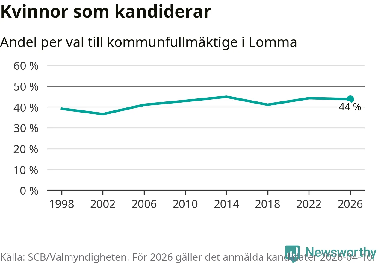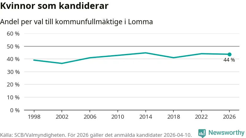 Kvinnorna utgör 44 procent av de hittills anmälda kandidaterna. Vid valet 2014 var 45 procent kvinnor, valet 2002 var motsvarande siffra 37 procent. Lomma är en av 264 kommuner i landet där männen utgör en majoritet av kandidaterna på listorna.
