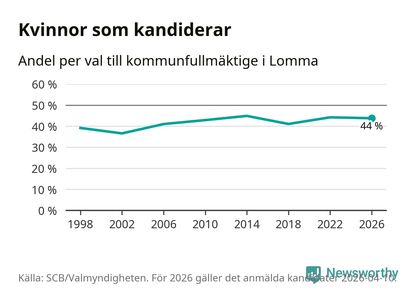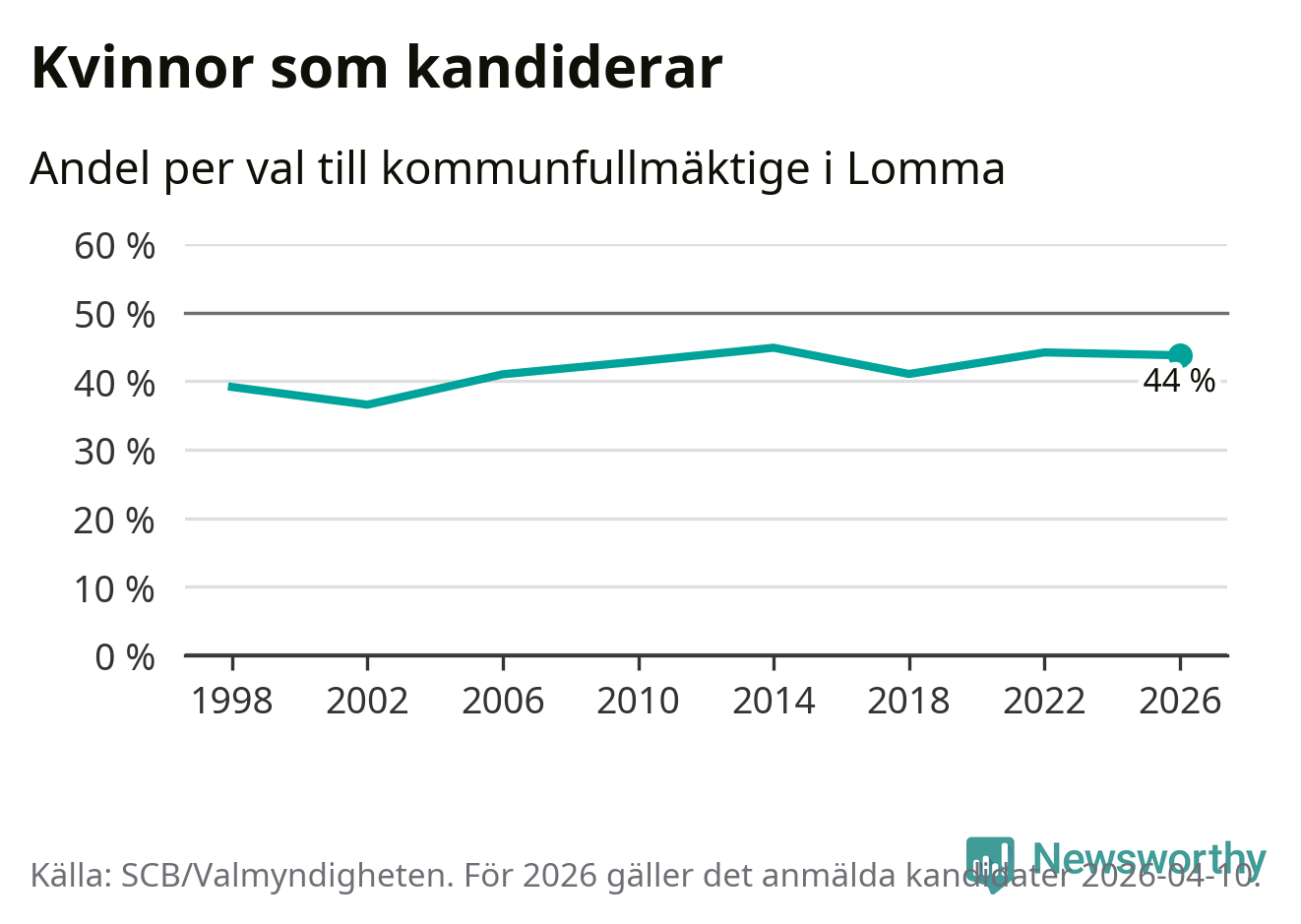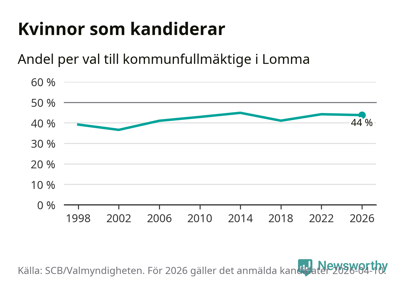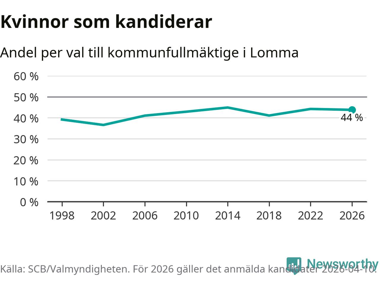 Kvinnorna utgör 44 procent av de hittills anmälda kandidaterna. Vid valet 2014 var 45 procent kvinnor, valet 2002 var motsvarande siffra 37 procent. Lomma är en av 264 kommuner i landet där männen utgör en majoritet av kandidaterna på listorna.