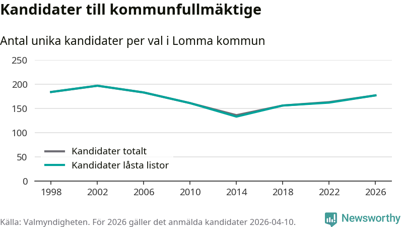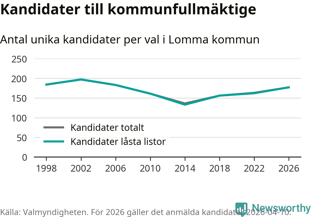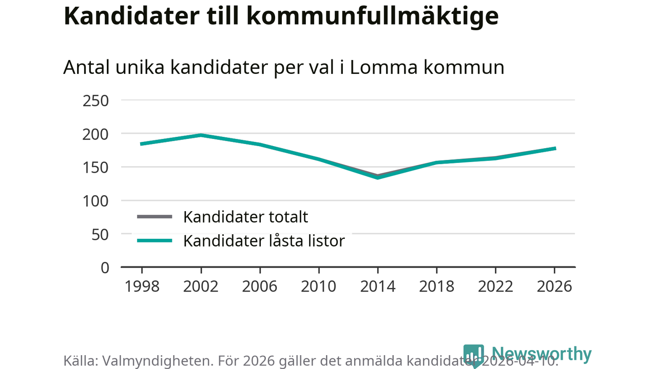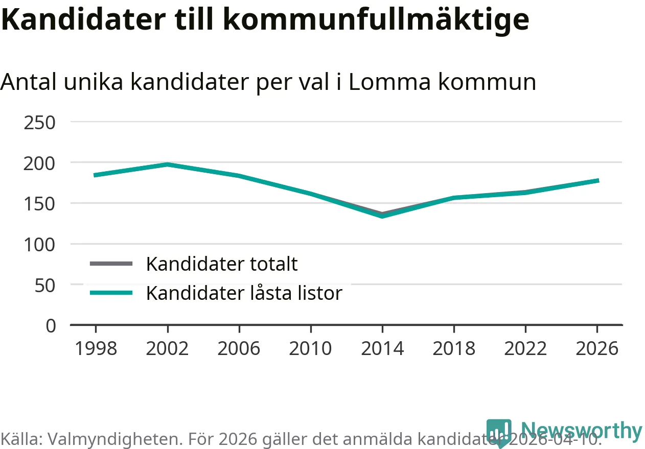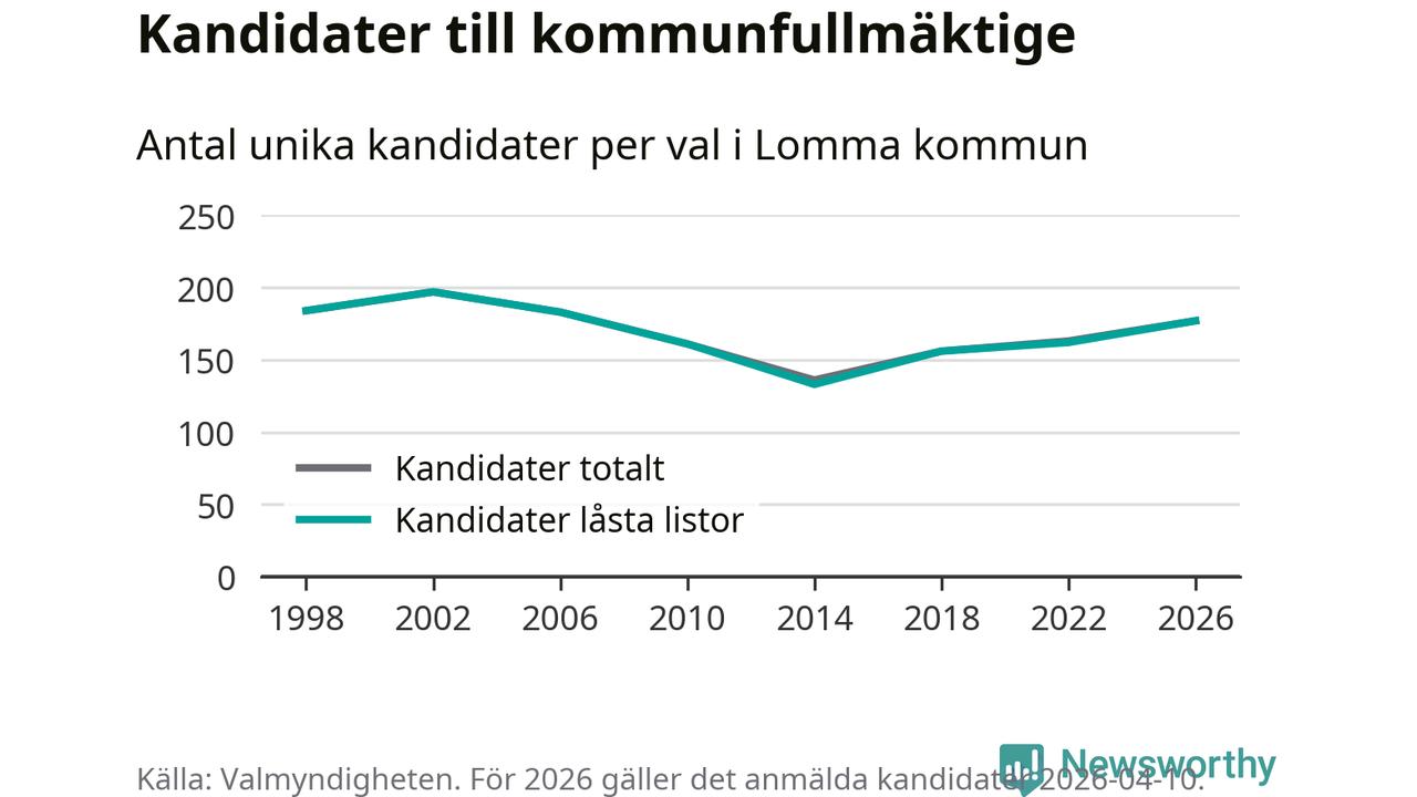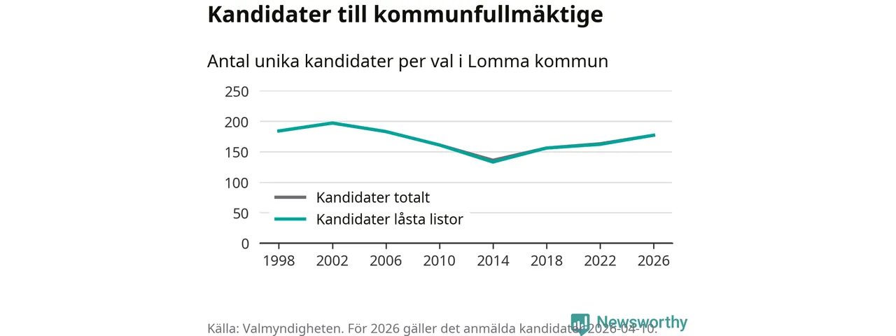 På torsdagen var det deadline för partier med låsta listor att registrera sina kandidater inför höstens val. Till valet till kommunfullmäktige i Lomma är 177 kandidater anmälda på sådana listor, vilket är 15 fler än i valet 2022.