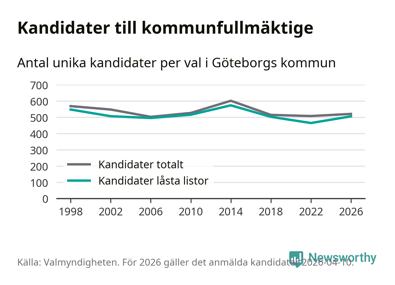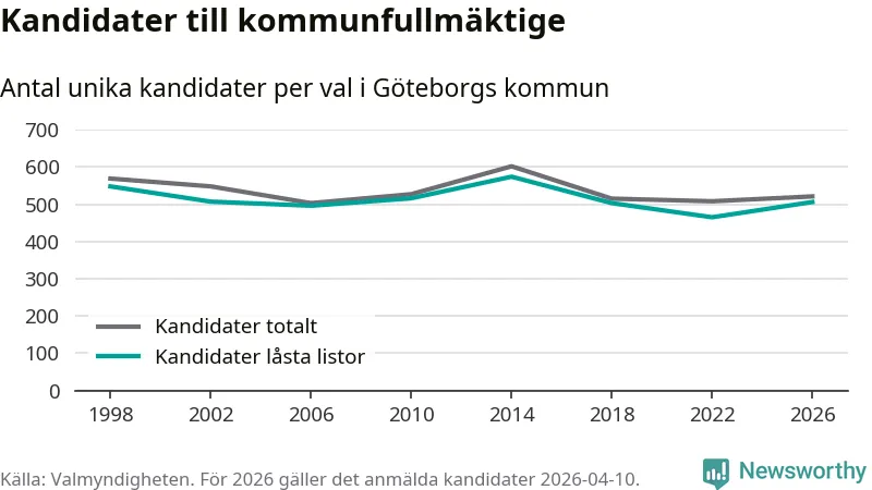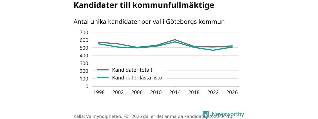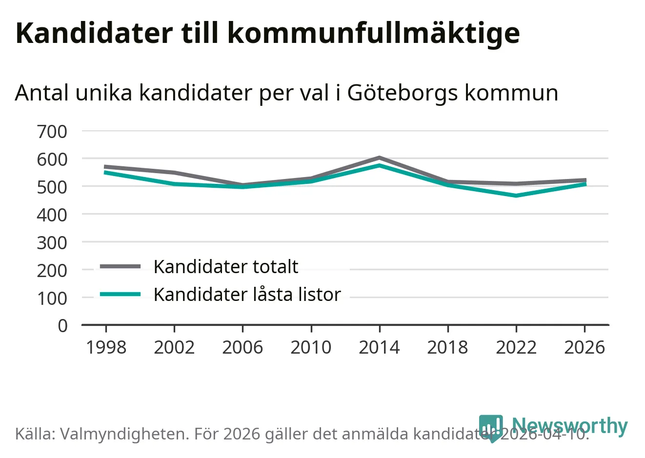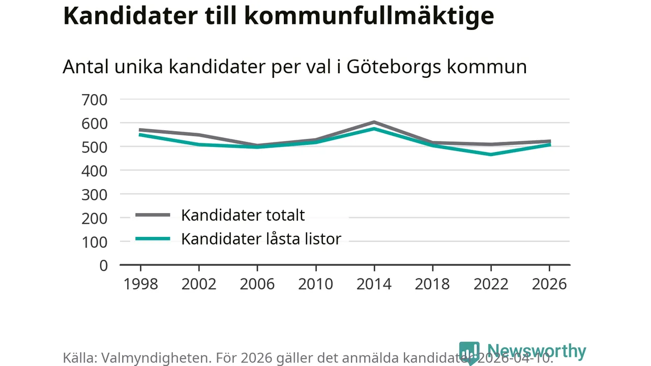 På torsdagen var det deadline för partier med låsta listor att registrera sina kandidater inför höstens val. Till valet till kommunfullmäktige i Göteborg är 506 kandidater anmälda på sådana listor, vilket är 41 fler än i valet 2022.