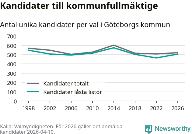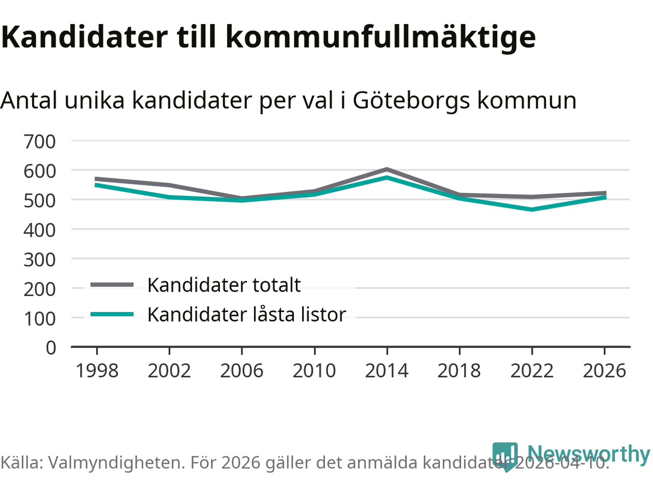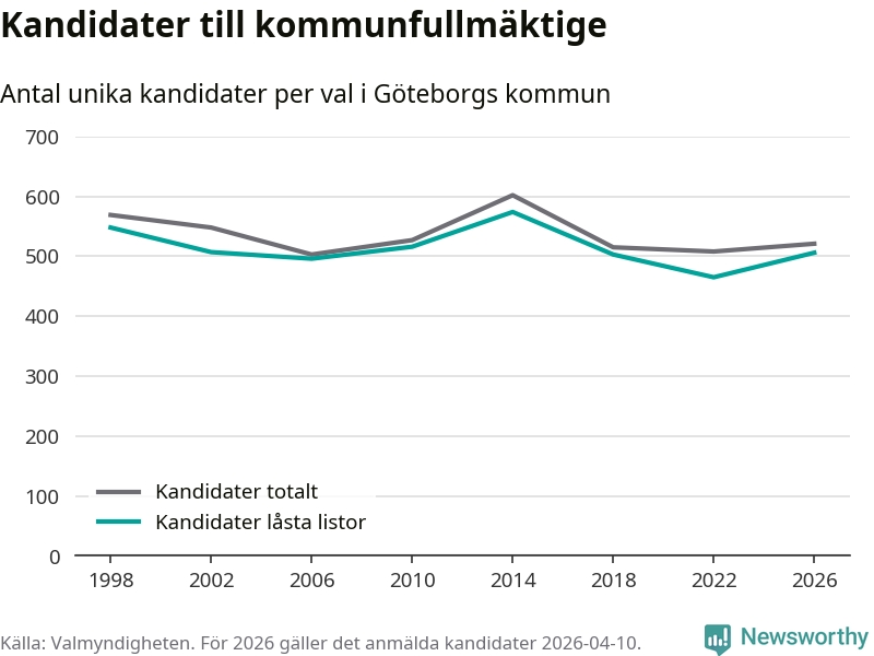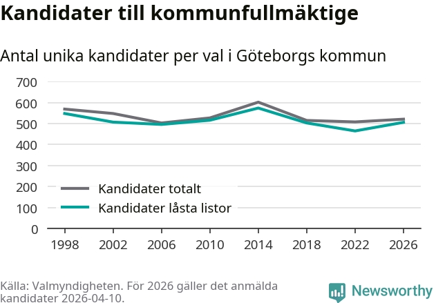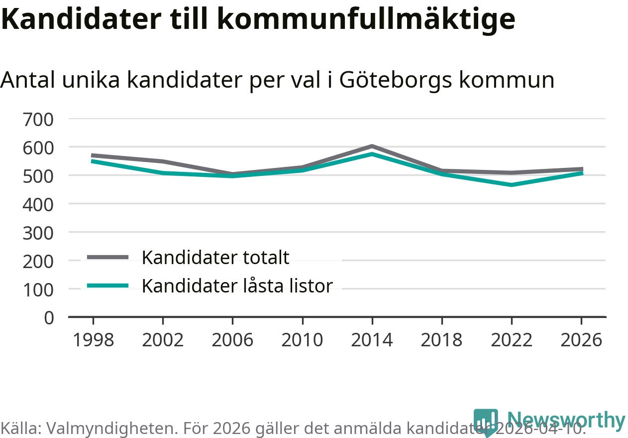På torsdagen var det deadline för partier med låsta listor att registrera sina kandidater inför höstens val. Till valet till kommunfullmäktige i Göteborg är 506 kandidater anmälda på sådana listor, vilket är 41 fler än i valet 2022.