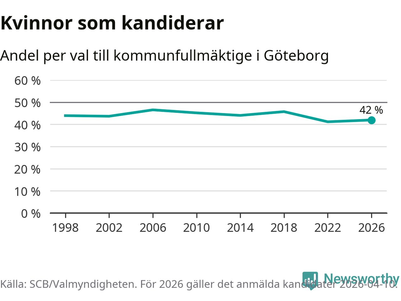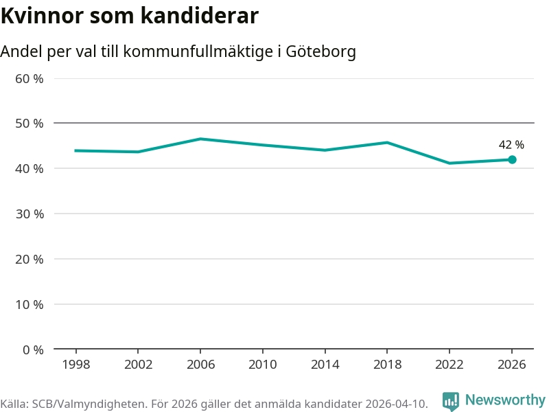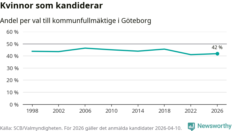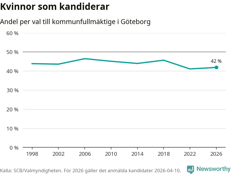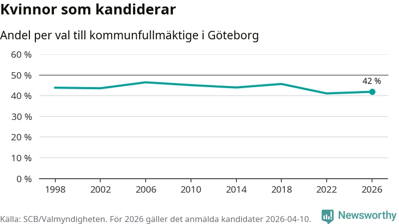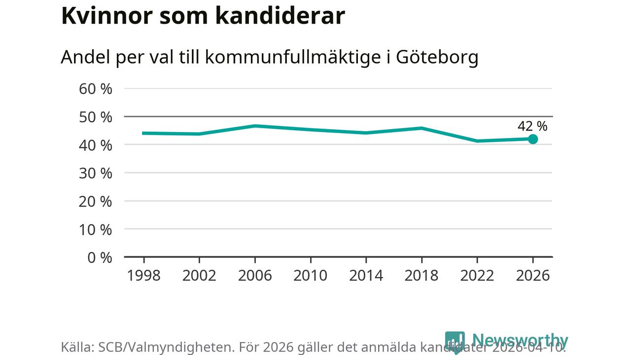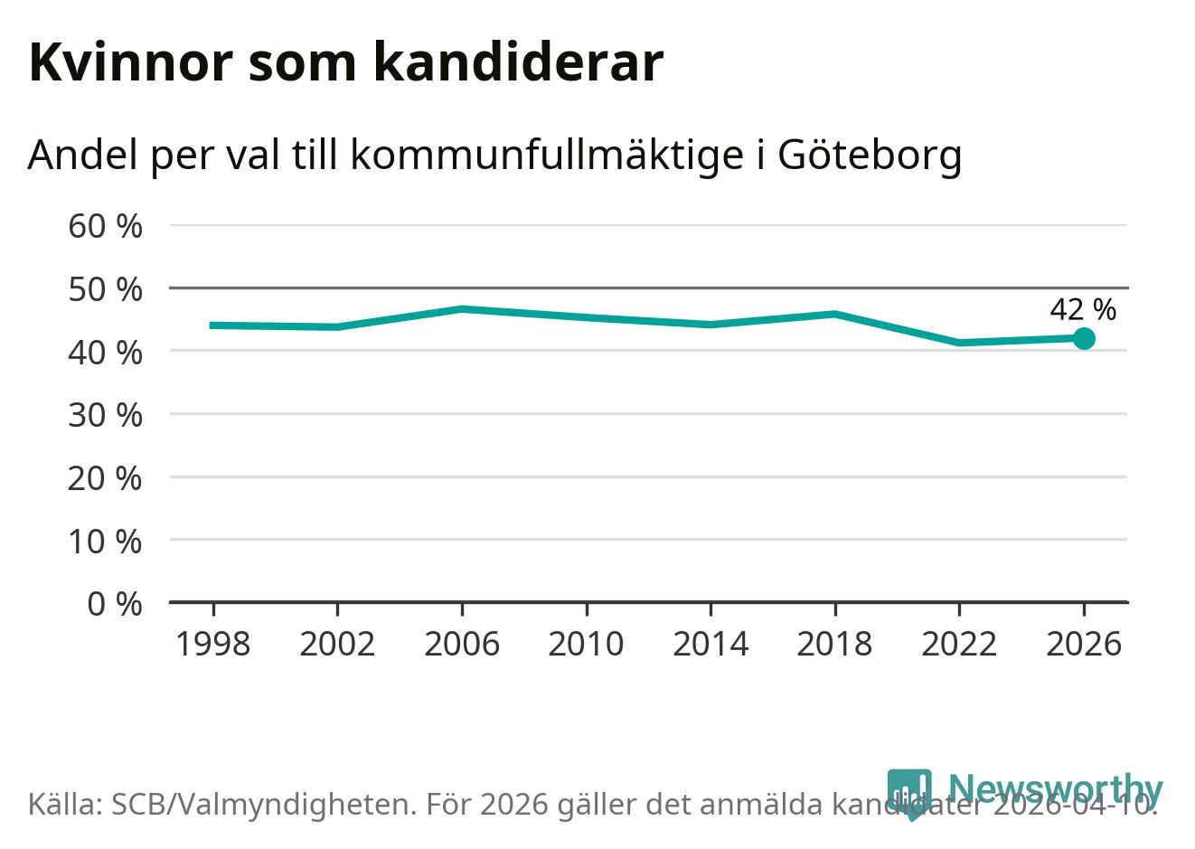 Kvinnorna utgör 42 procent av de hittills anmälda kandidaterna. Vid valet 2006 var 47 procent kvinnor, valet 2022 var motsvarande siffra 41 procent. Göteborg är en av 264 kommuner i landet där männen utgör en majoritet av kandidaterna på listorna.