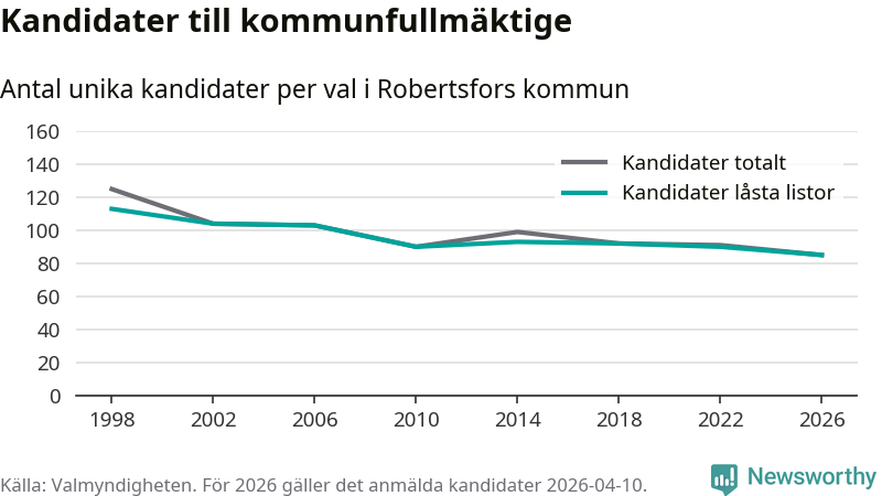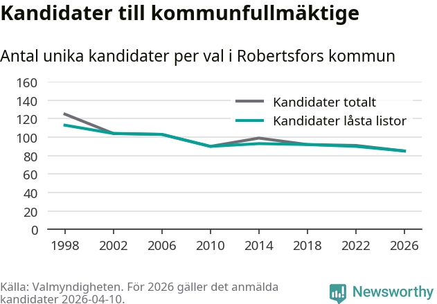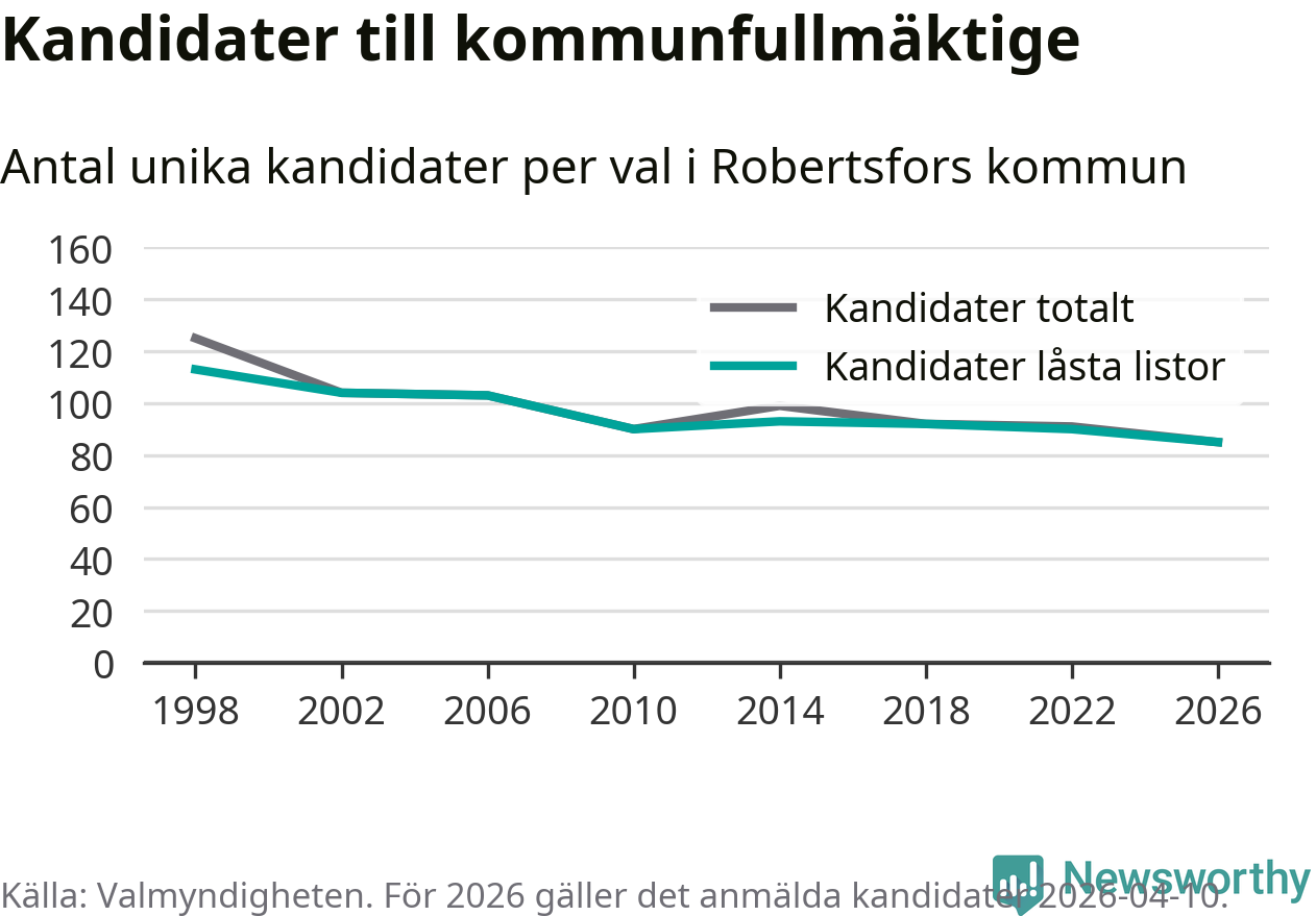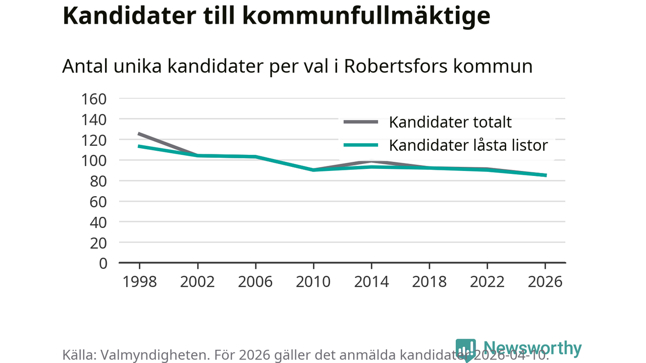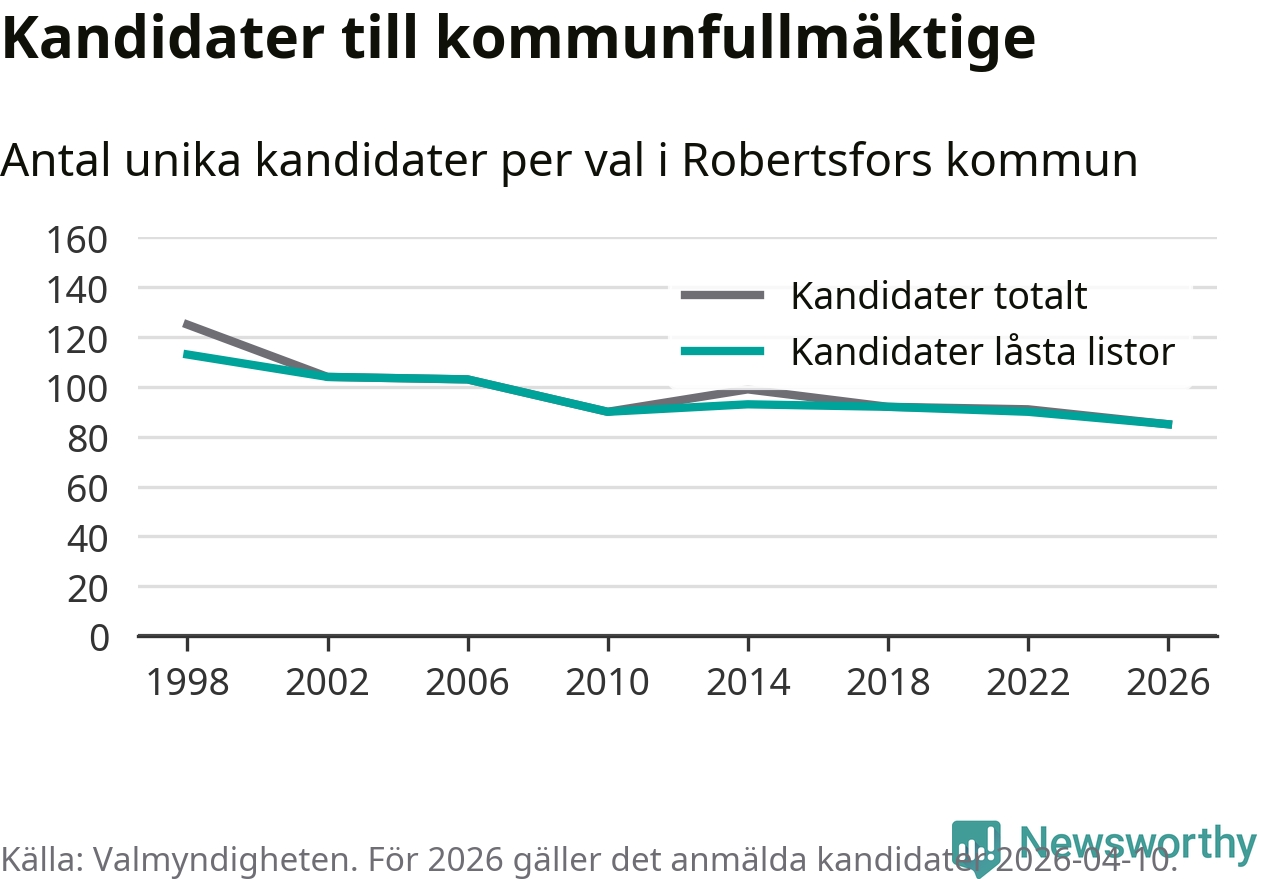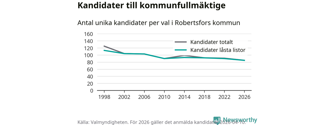 På torsdagen var det deadline för partier med låsta listor att registrera sina kandidater inför höstens val. Till valet till kommunfullmäktige i Robertsfors är 85 kandidater anmälda på sådana listor, vilket är fem färre än i valet 2022. Det är den lägsta siffran sedan åtminstone valet 1998, vilket är så långt tillbaka som vi har statistik för.