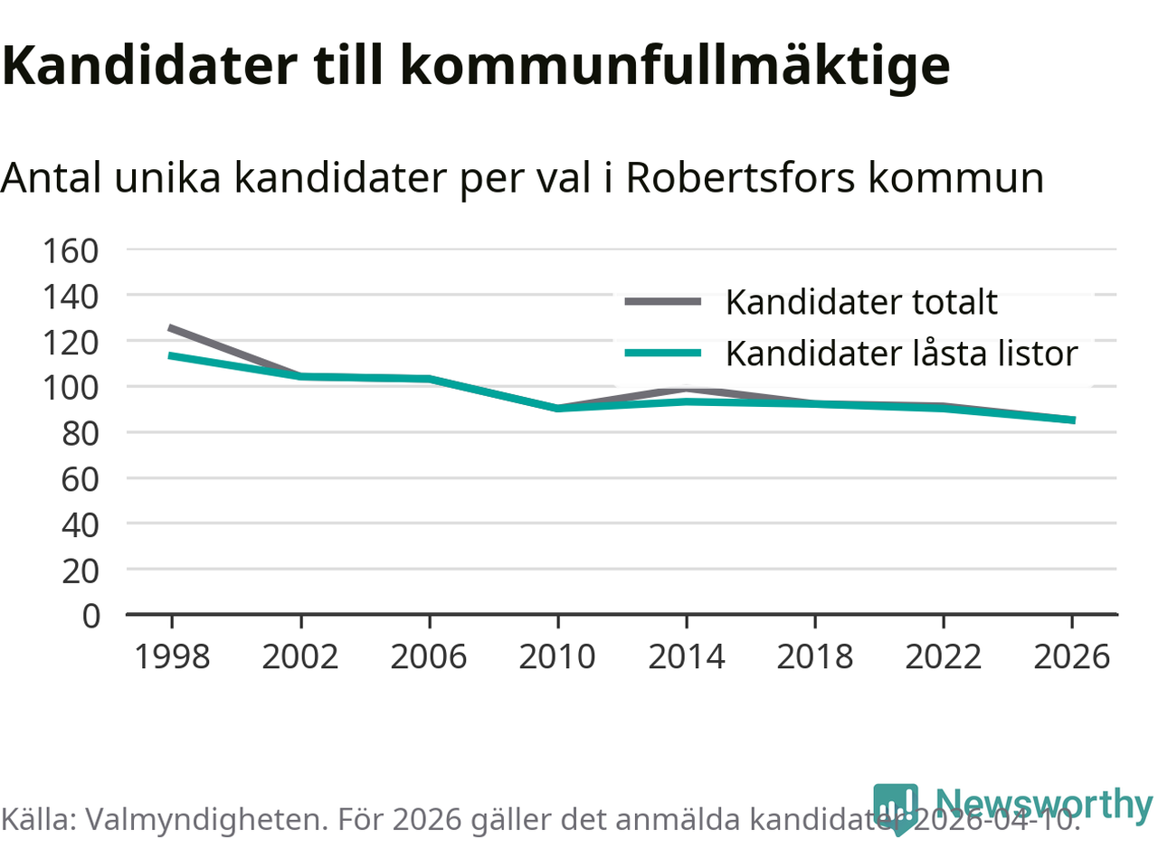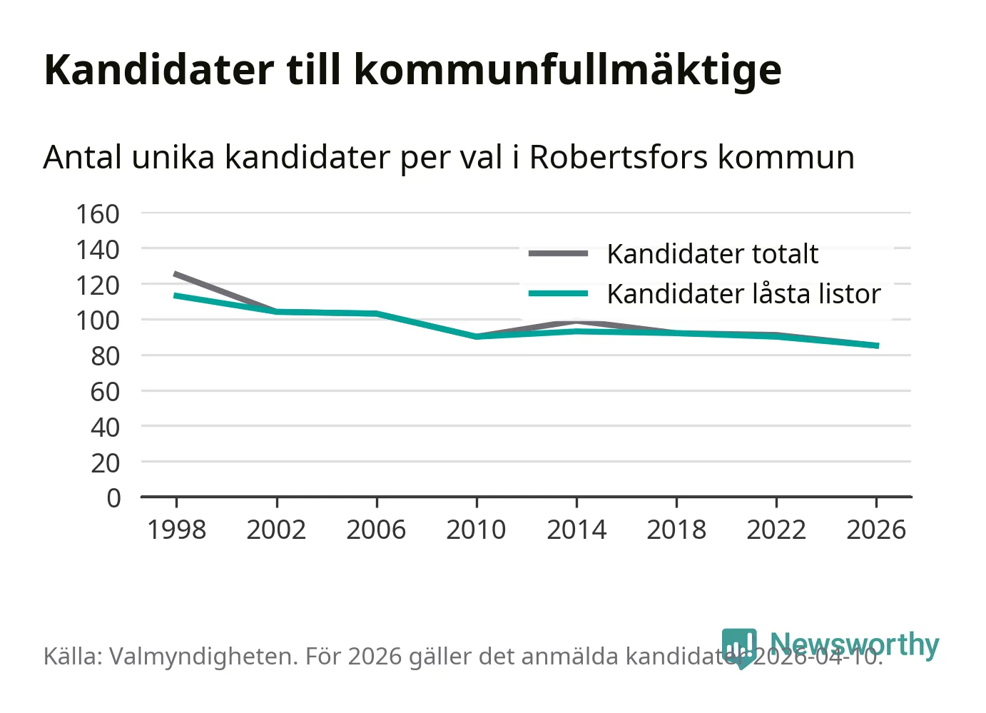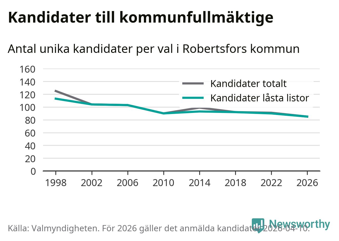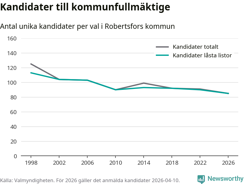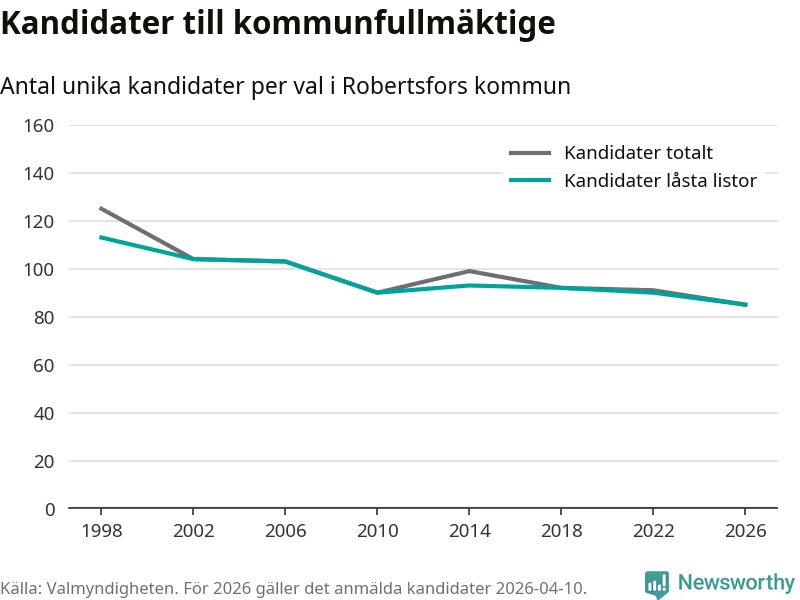 På torsdagen var det deadline för partier med låsta listor att registrera sina kandidater inför höstens val. Till valet till kommunfullmäktige i Robertsfors är 85 kandidater anmälda på sådana listor, vilket är fem färre än i valet 2022. Det är den lägsta siffran sedan åtminstone valet 1998, vilket är så långt tillbaka som vi har statistik för.
