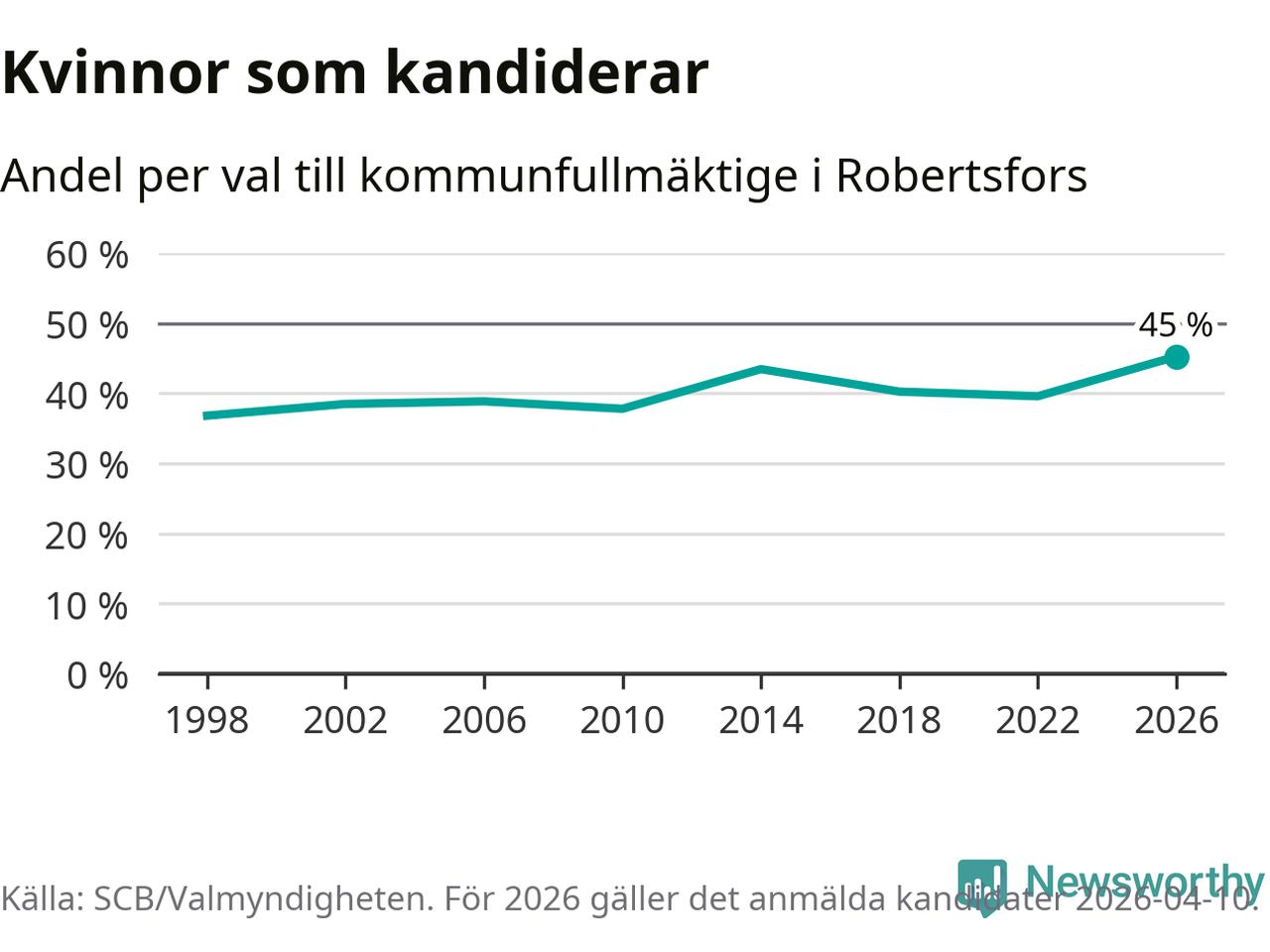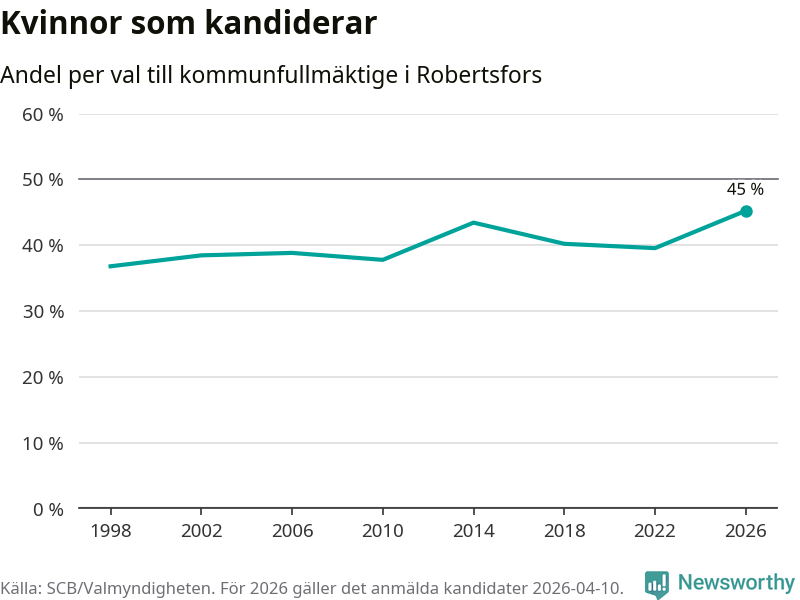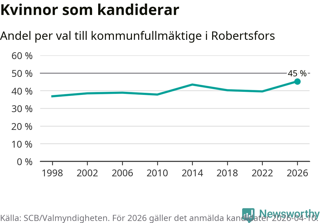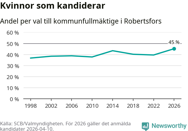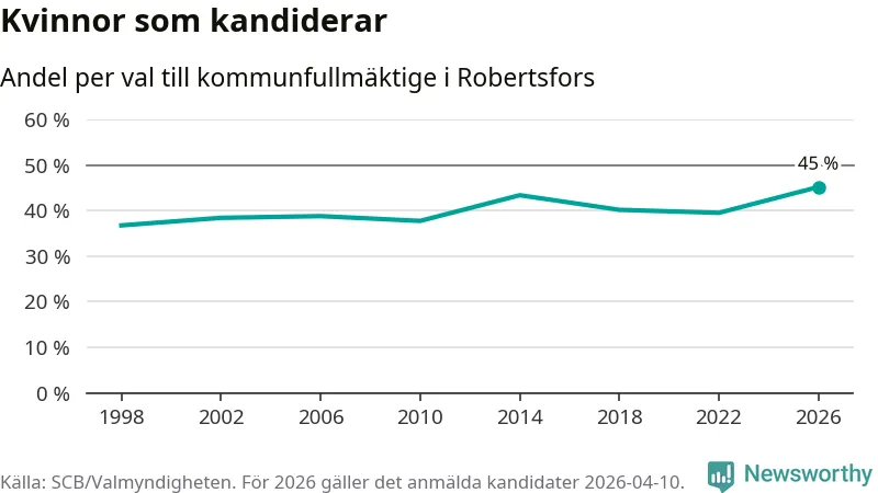 Kvinnorna utgör 45 procent av de hittills anmälda kandidaterna, vilket är den högsta andelen på listorna till kommunfullmäktige i Robertsfors sedan åtminstone valet 1998. Robertsfors är en av 264 kommuner i landet där männen utgör en majoritet av kandidaterna på listorna.