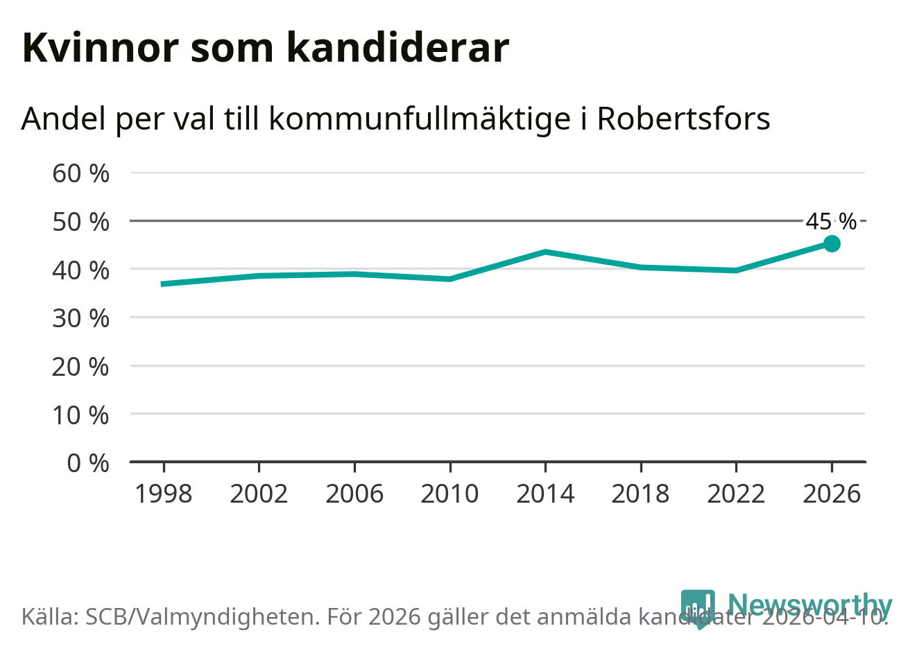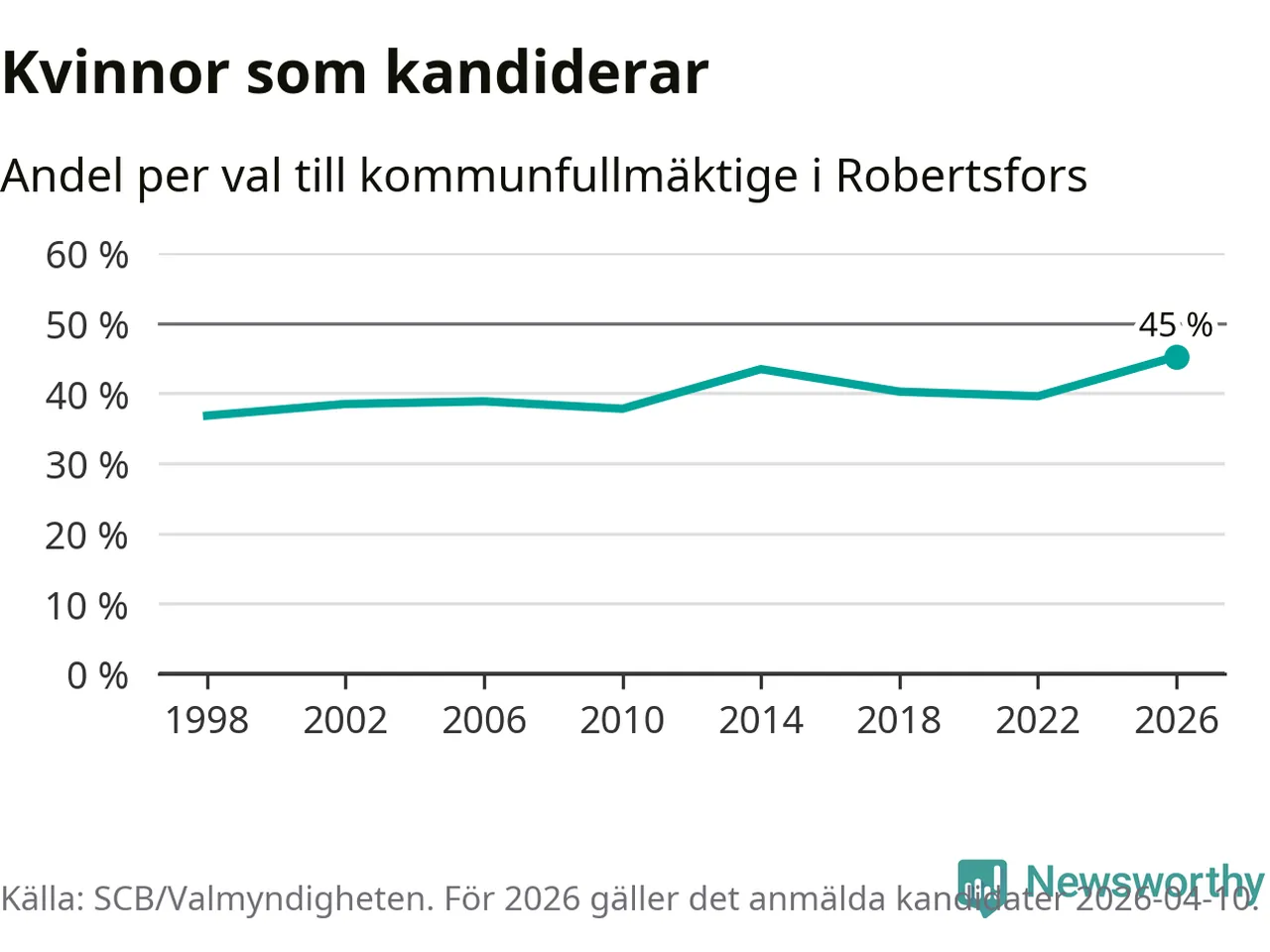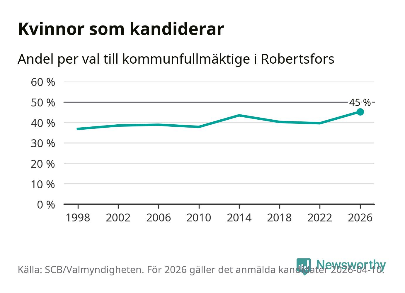 Kvinnorna utgör 45 procent av de hittills anmälda kandidaterna, vilket är den högsta andelen på listorna till kommunfullmäktige i Robertsfors sedan åtminstone valet 1998. Robertsfors är en av 264 kommuner i landet där männen utgör en majoritet av kandidaterna på listorna.