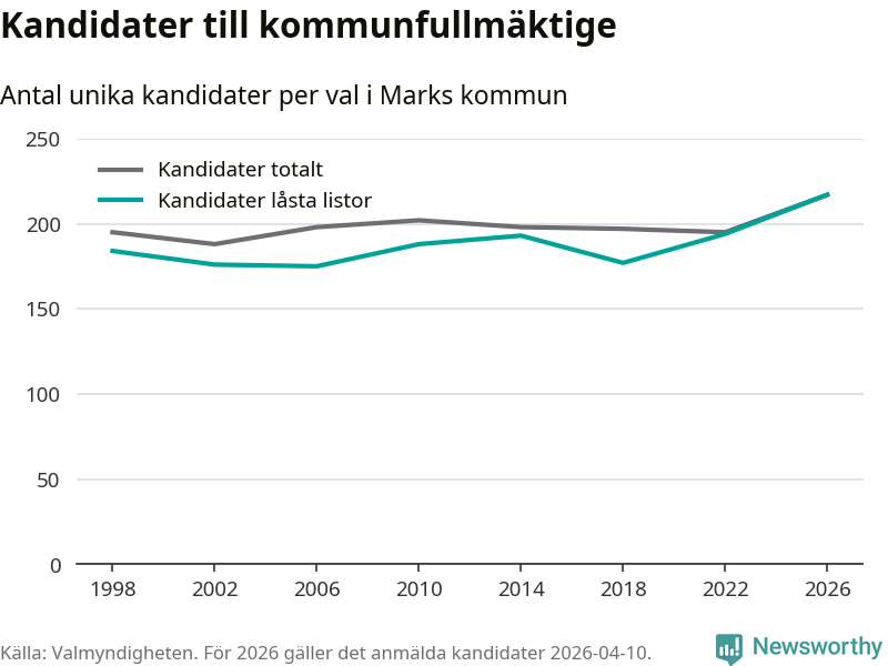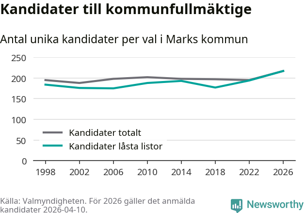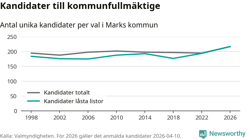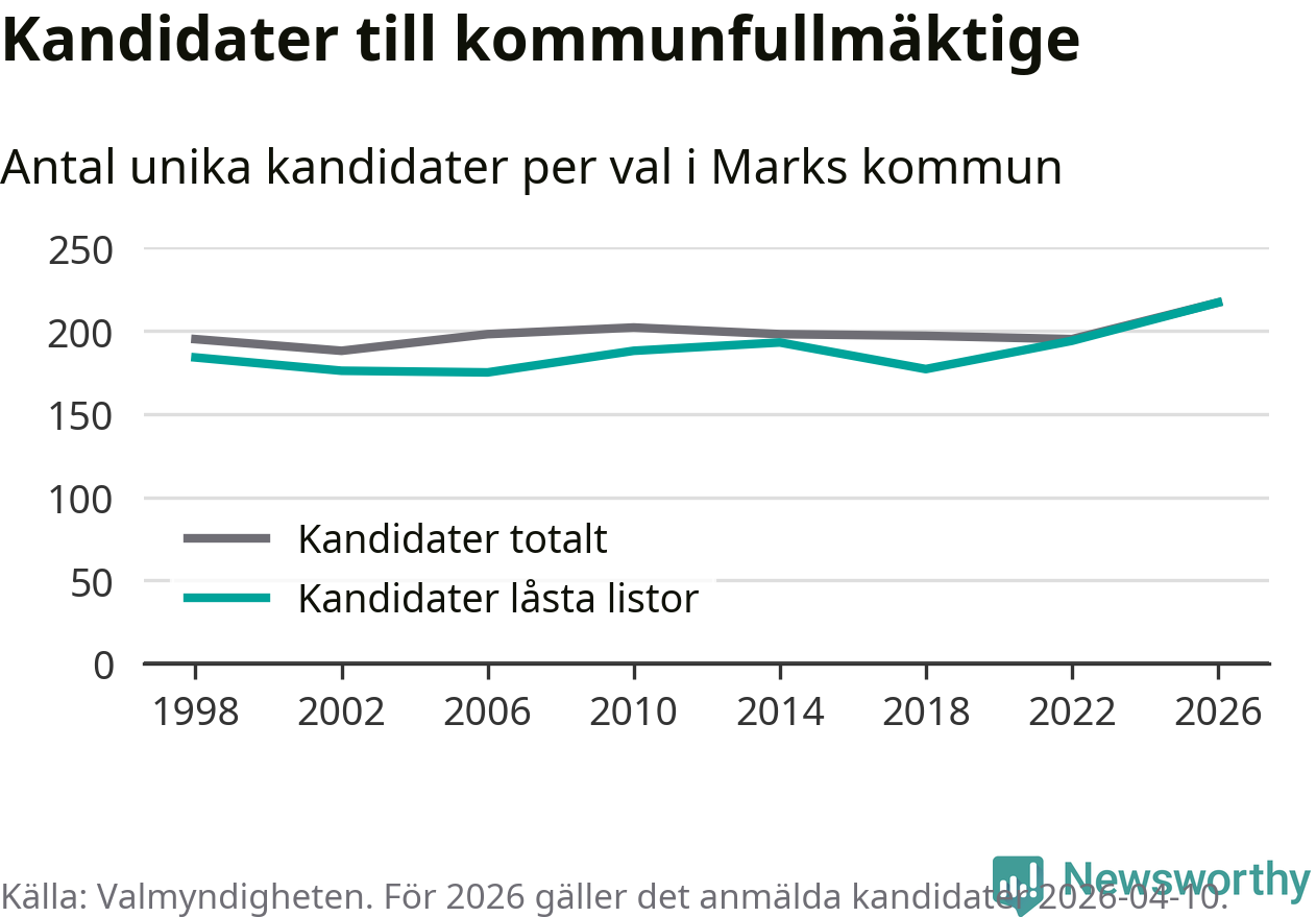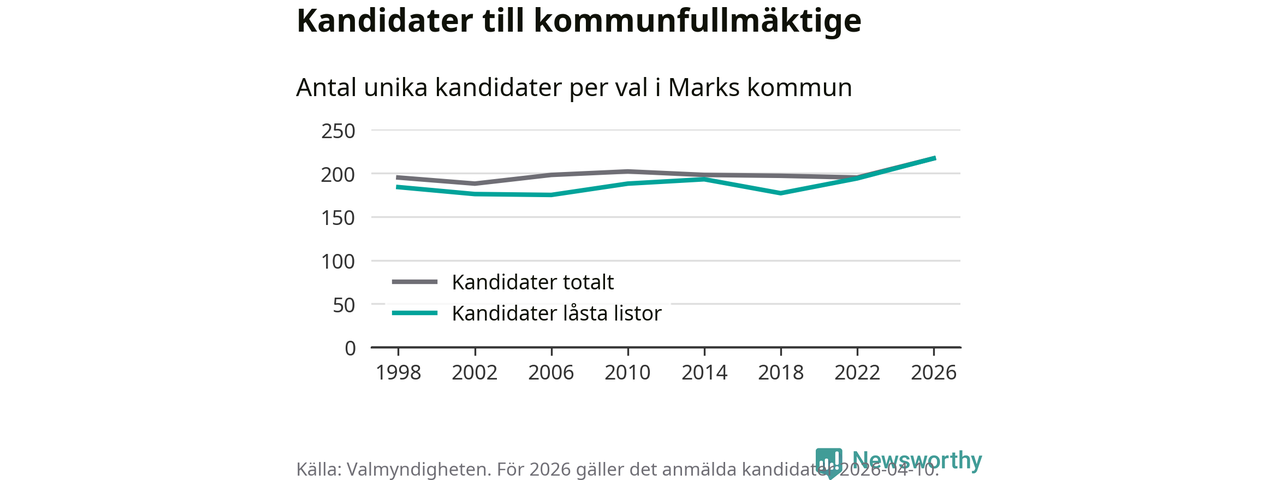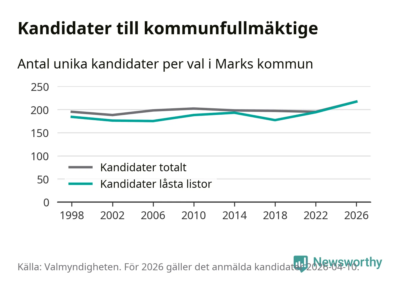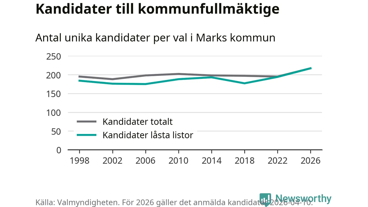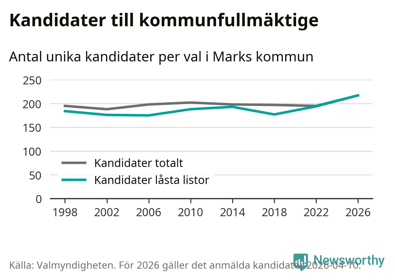 På torsdagen var det deadline för partier med låsta listor att registrera sina kandidater inför höstens val. Till valet till kommunfullmäktige i Mark är 217 kandidater anmälda på sådana listor, vilket är 23 fler än i valet 2022. Det är den högsta siffran sedan åtminstone valet 1998, vilket är så långt tillbaka som vi har statistik för.