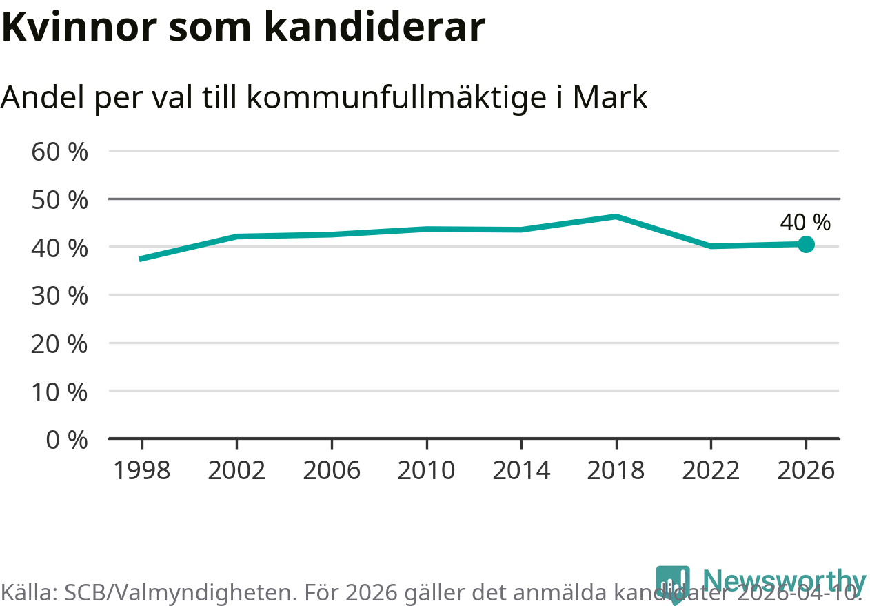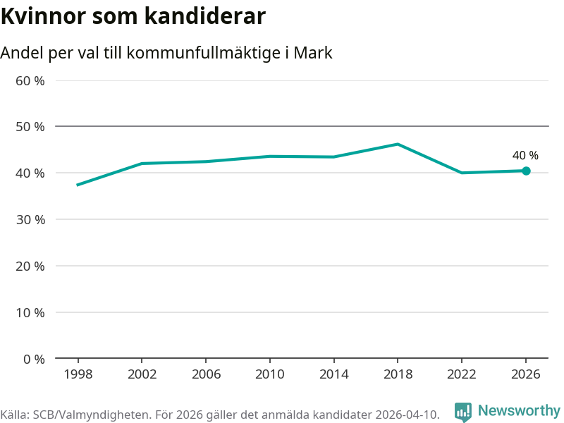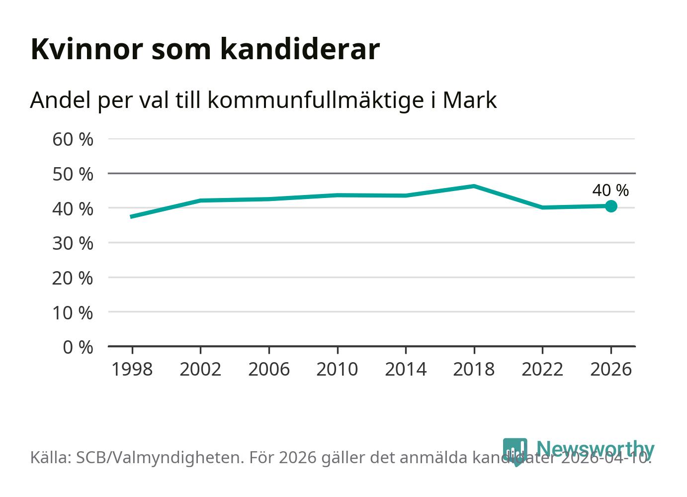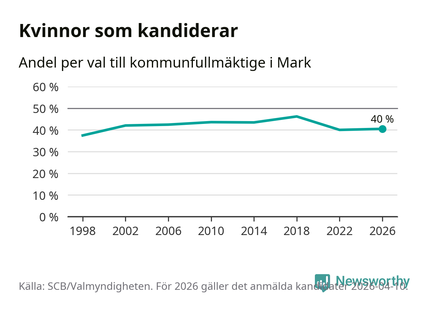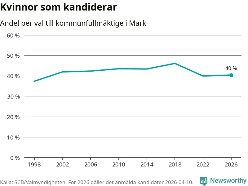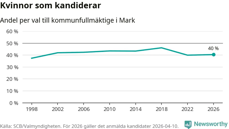 Kvinnorna utgör 40 procent av de hittills anmälda kandidaterna. Vid valet 2018 var 46 procent kvinnor, valet 1998 var motsvarande siffra 37 procent. Mark är en av 264 kommuner i landet där männen utgör en majoritet av kandidaterna på listorna.
