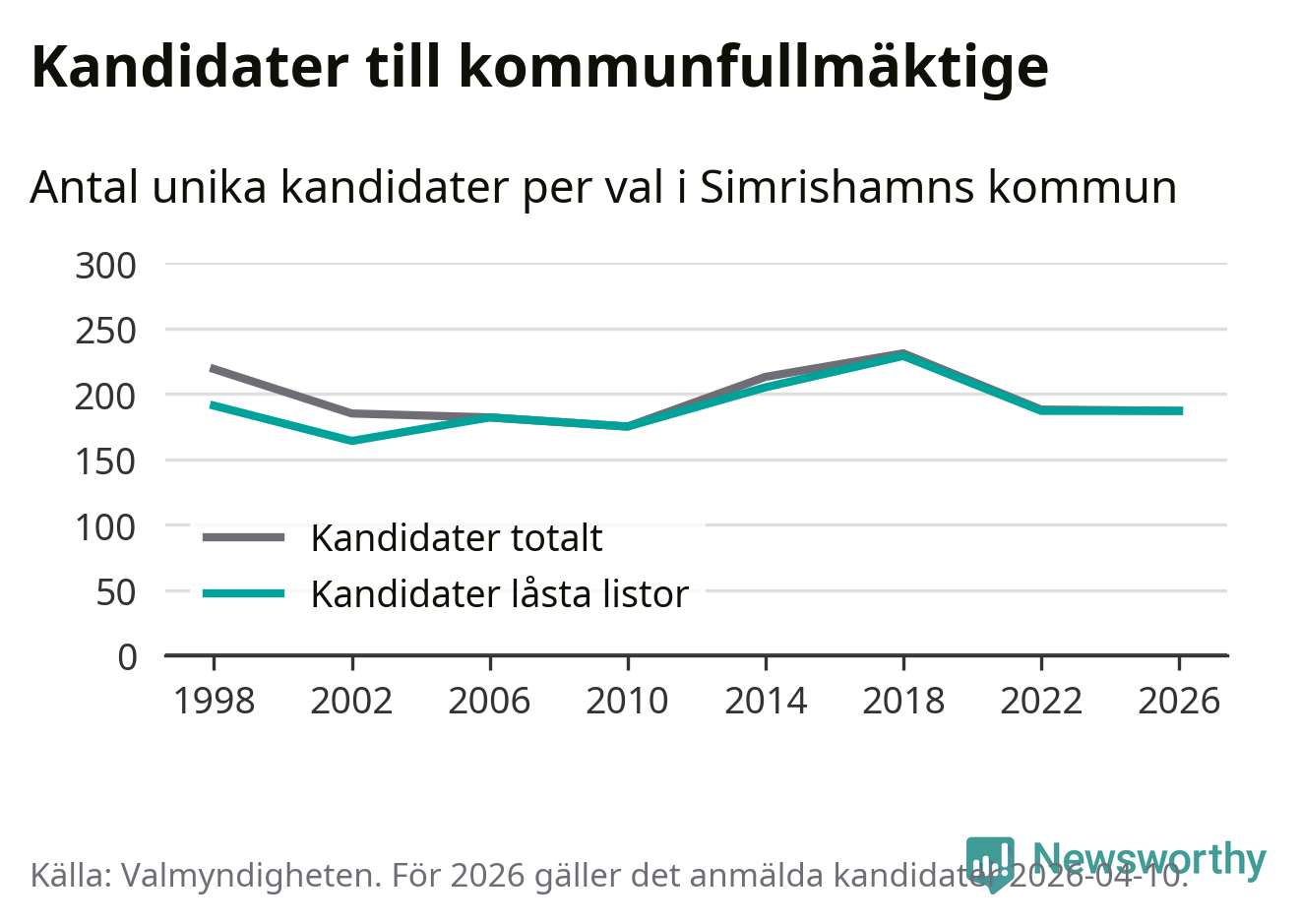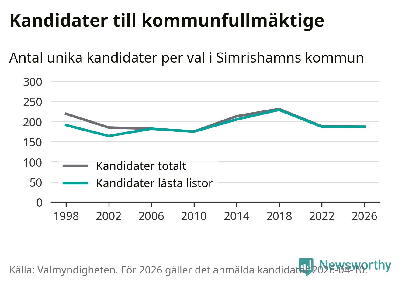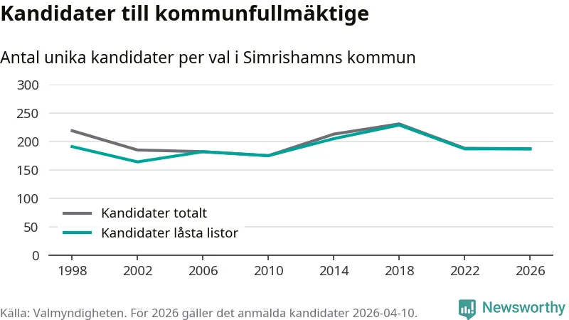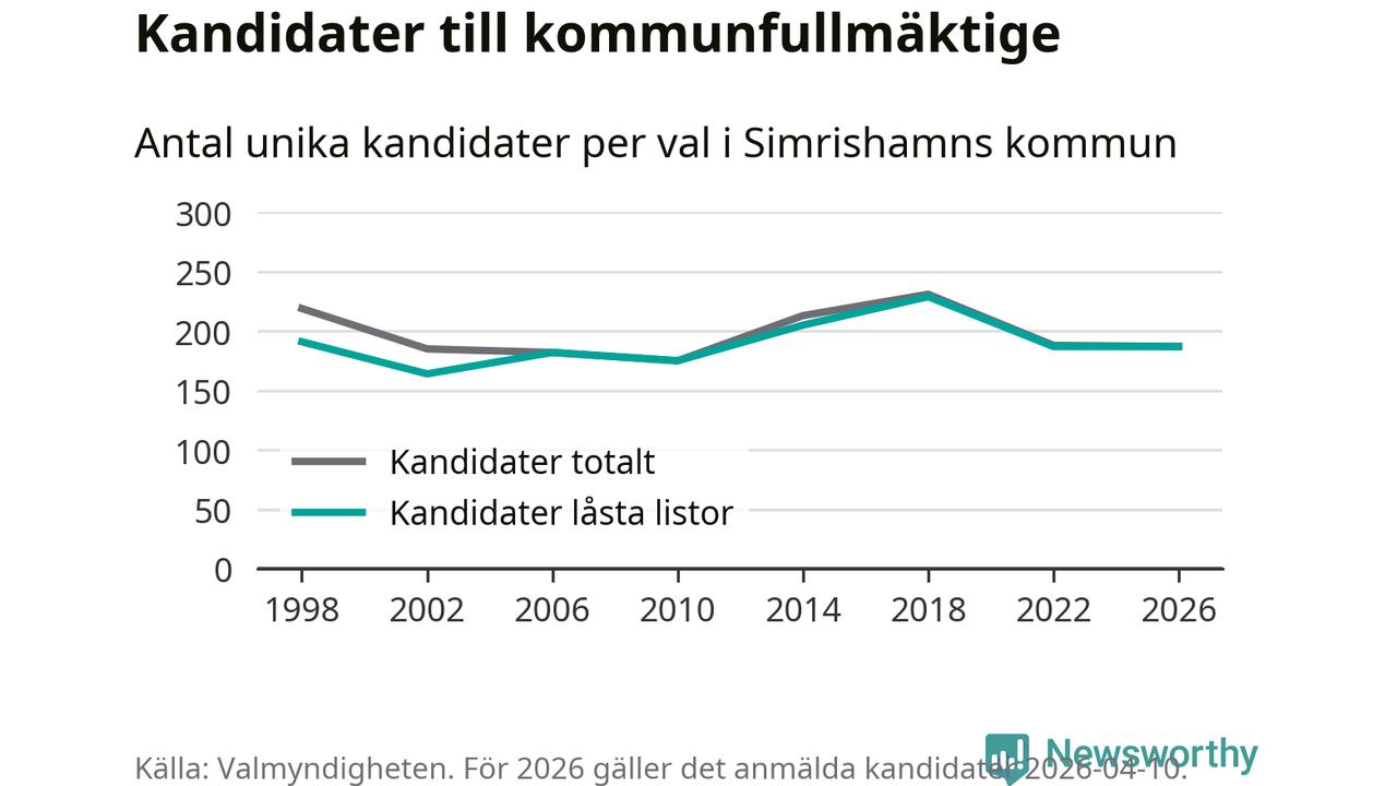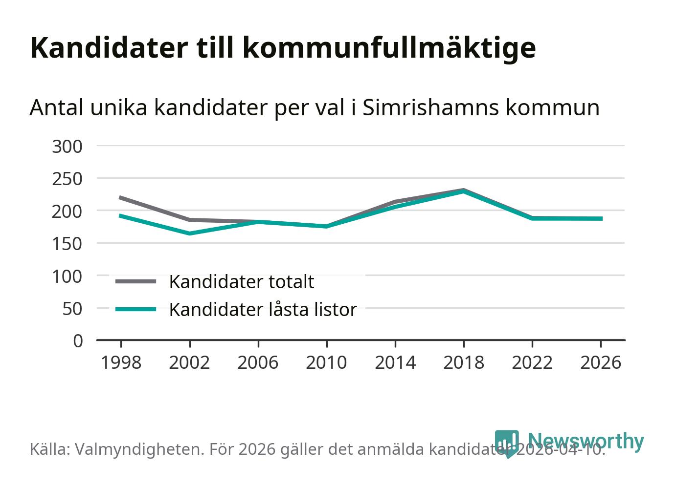 På torsdagen var det deadline för partier med låsta listor att registrera sina kandidater inför höstens val. Till valet till kommunfullmäktige i Simrishamn är 187 kandidater anmälda på sådana listor, vilket är lika många som i valet 2022.