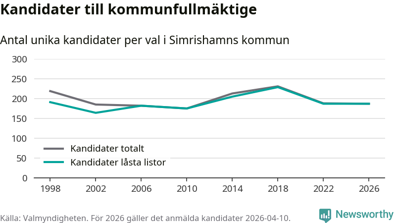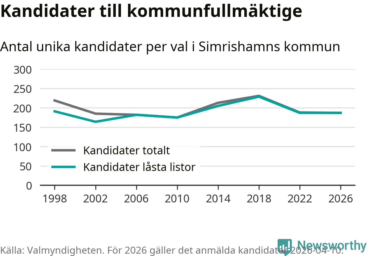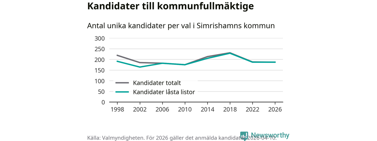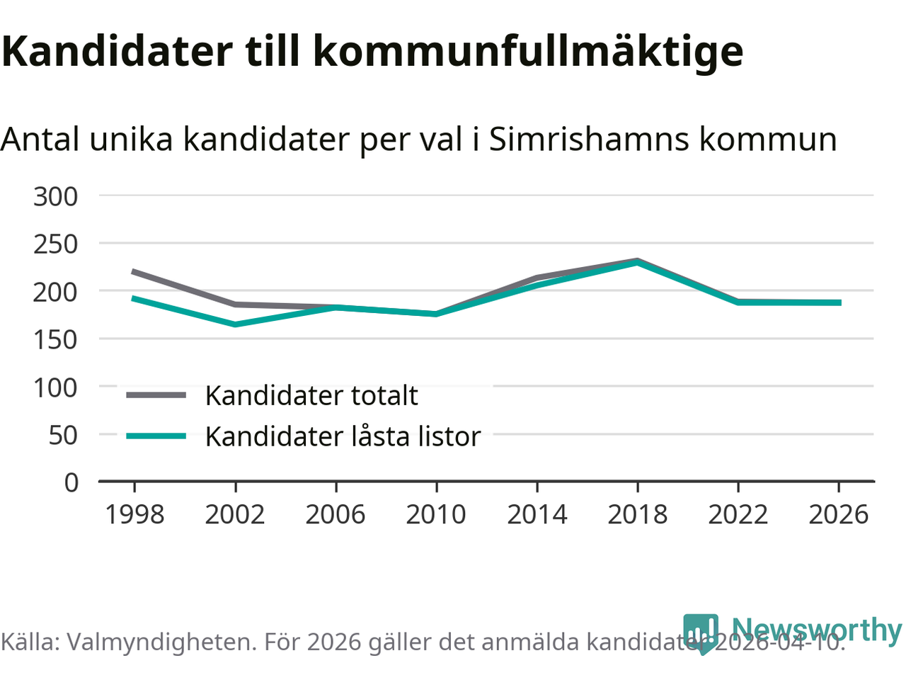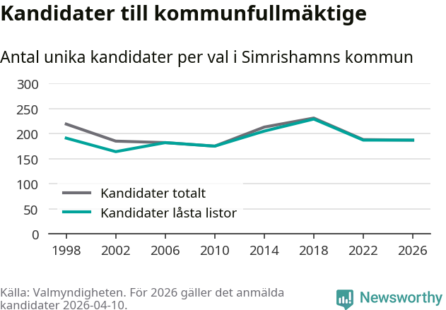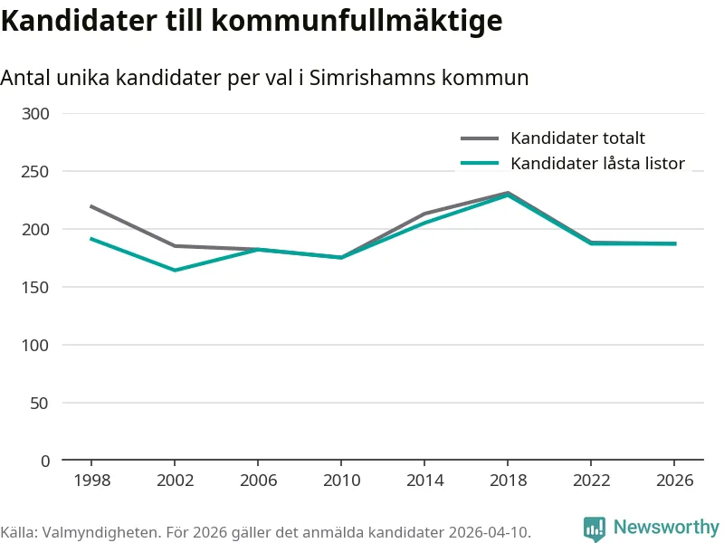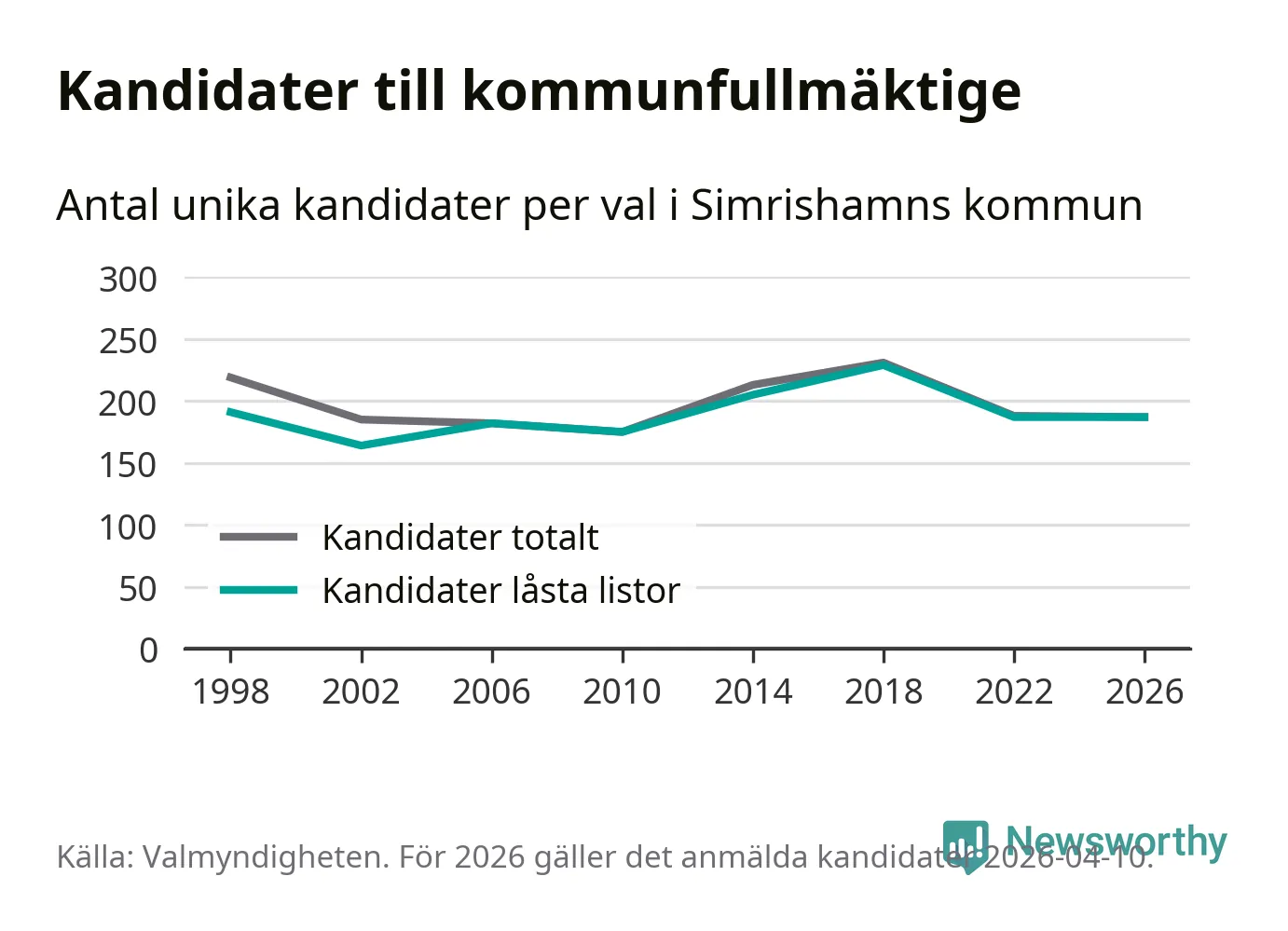 På torsdagen var det deadline för partier med låsta listor att registrera sina kandidater inför höstens val. Till valet till kommunfullmäktige i Simrishamn är 187 kandidater anmälda på sådana listor, vilket är lika många som i valet 2022.