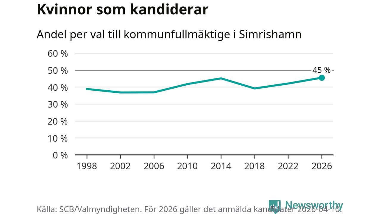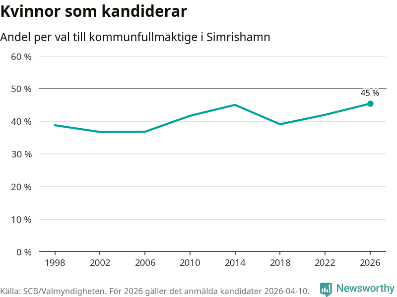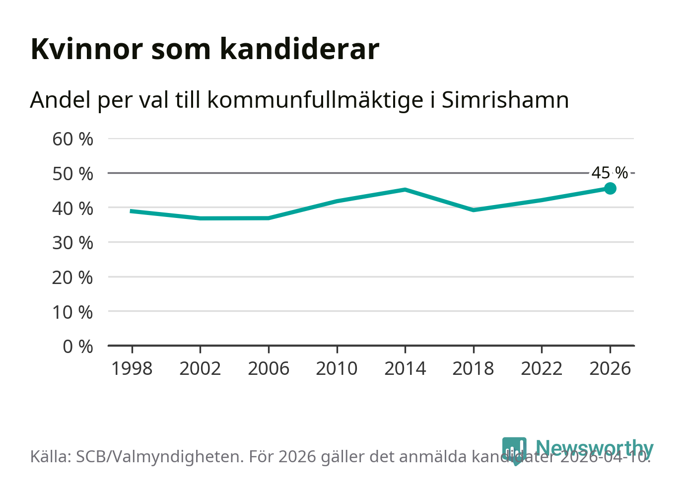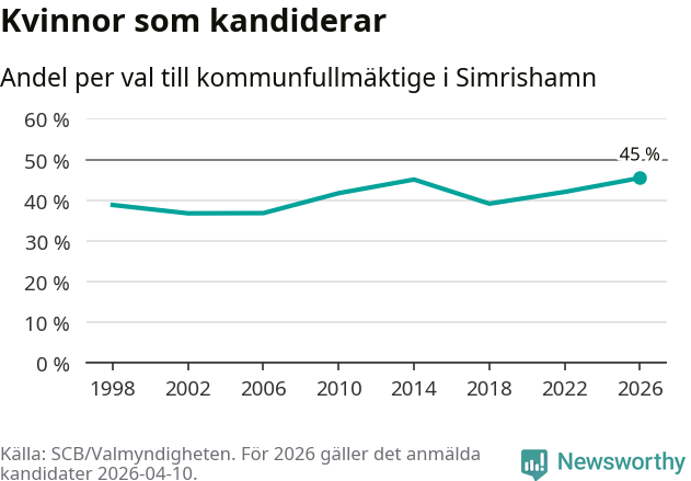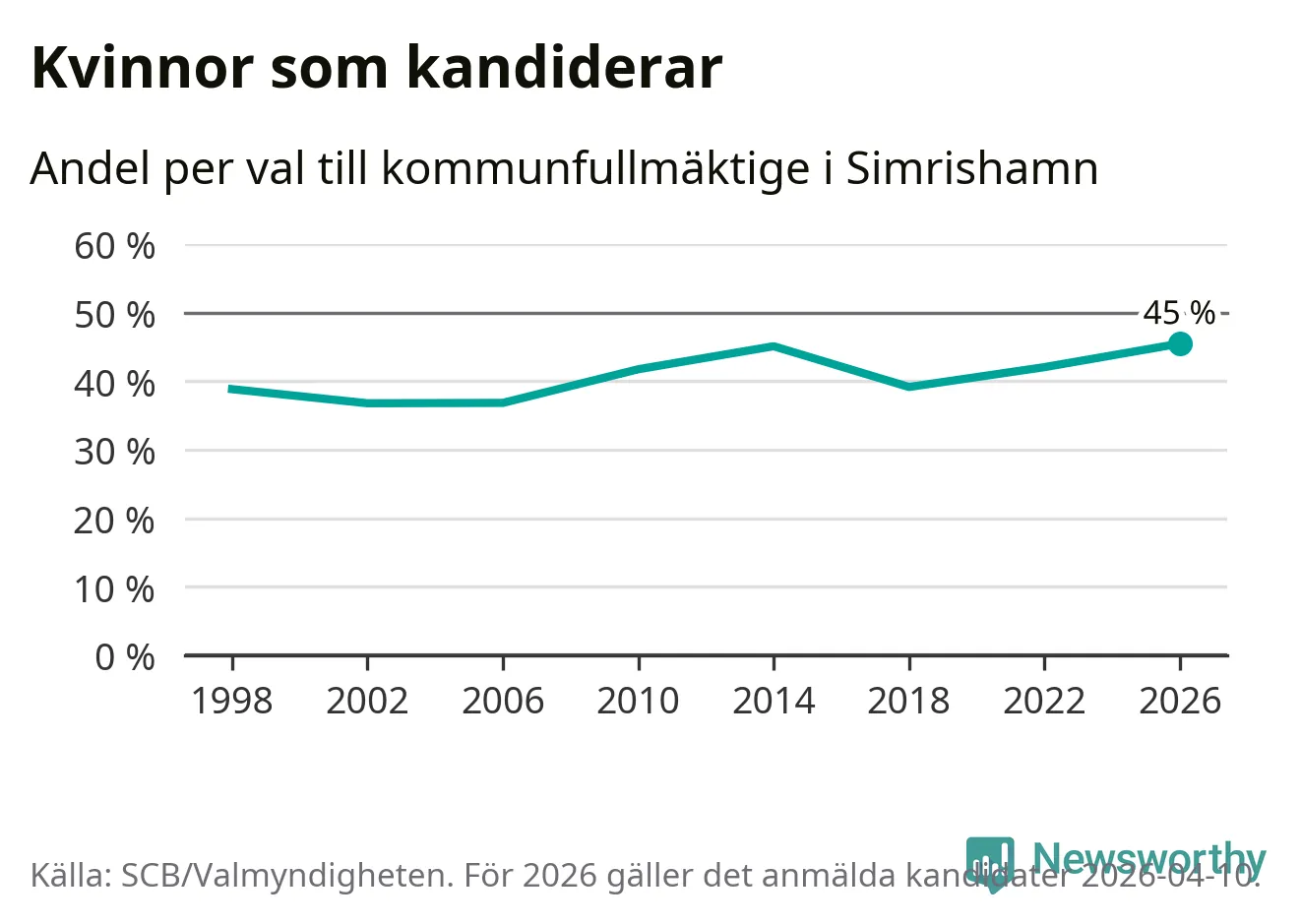 Kvinnorna utgör 45 procent av de hittills anmälda kandidaterna, vilket är den högsta andelen på listorna till kommunfullmäktige i Simrishamn sedan åtminstone valet 1998. Simrishamn är en av 264 kommuner i landet där männen utgör en majoritet av kandidaterna på listorna.