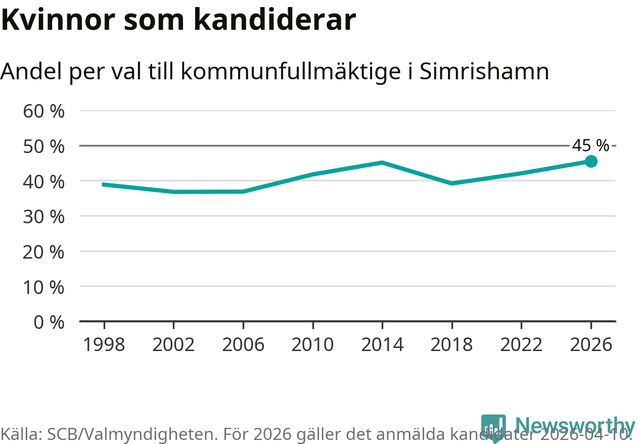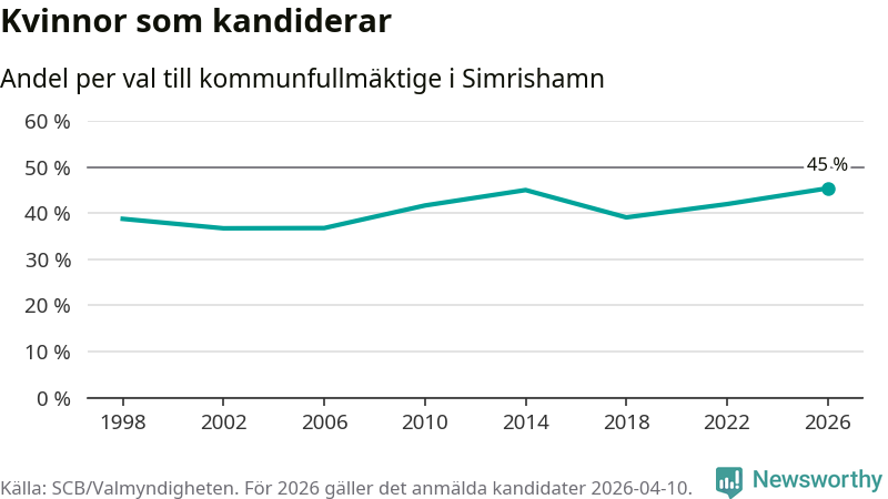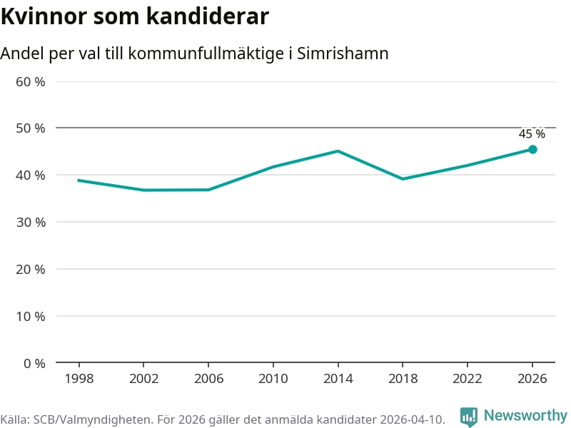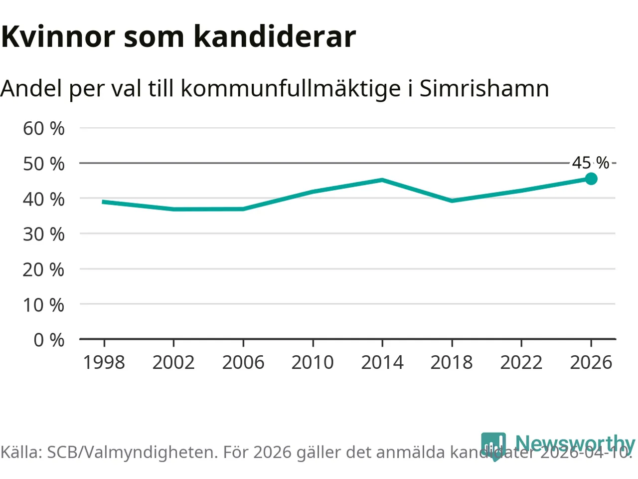 Kvinnorna utgör 45 procent av de hittills anmälda kandidaterna, vilket är den högsta andelen på listorna till kommunfullmäktige i Simrishamn sedan åtminstone valet 1998. Simrishamn är en av 264 kommuner i landet där männen utgör en majoritet av kandidaterna på listorna.