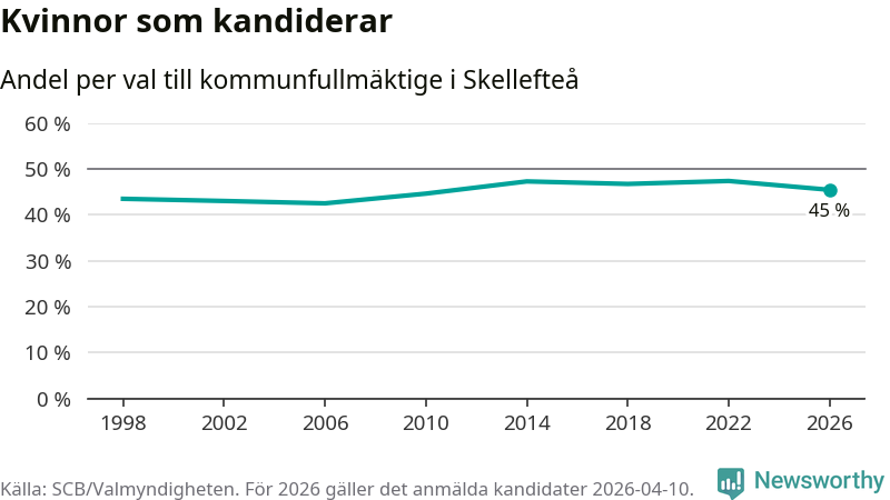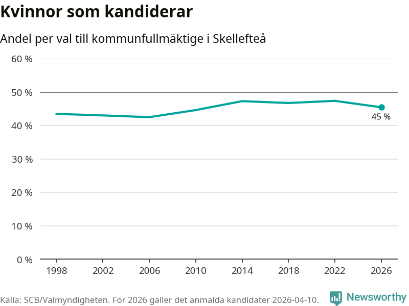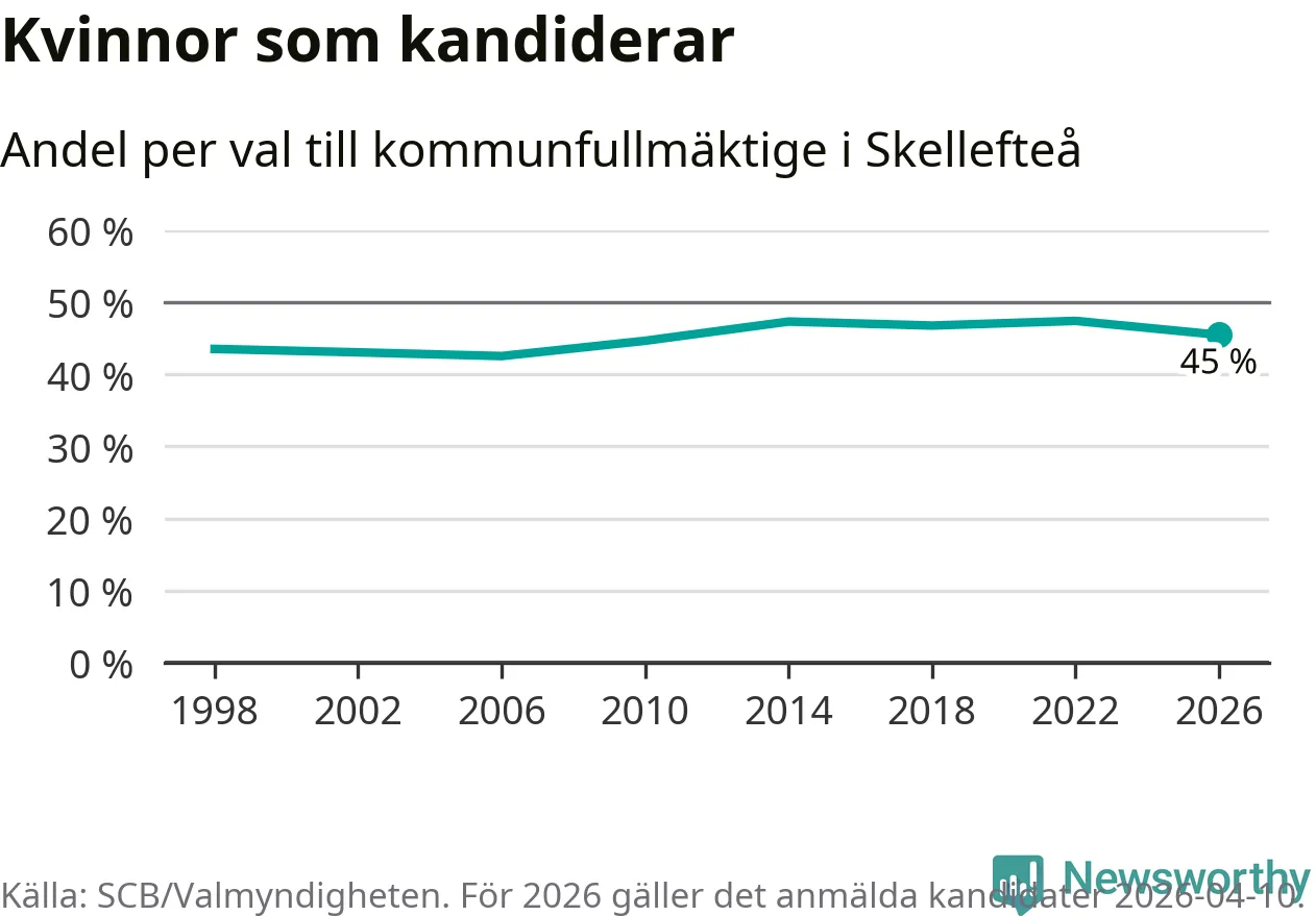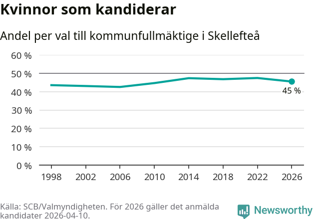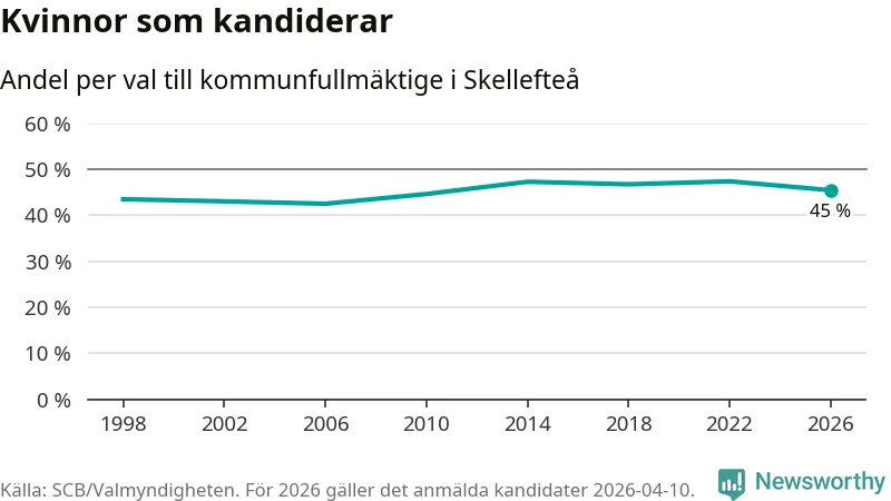 Kvinnorna utgör 45 procent av de hittills anmälda kandidaterna, vilket är den lägsta andelen på listorna till kommunfullmäktige i Skellefteå sedan valet 2010. Vid valet 2022 var 47 procent kvinnor, valet 2006 var motsvarande siffra 43 procent. Skellefteå är en av 264 kommuner i landet där männen utgör en majoritet av kandidaterna på listorna.