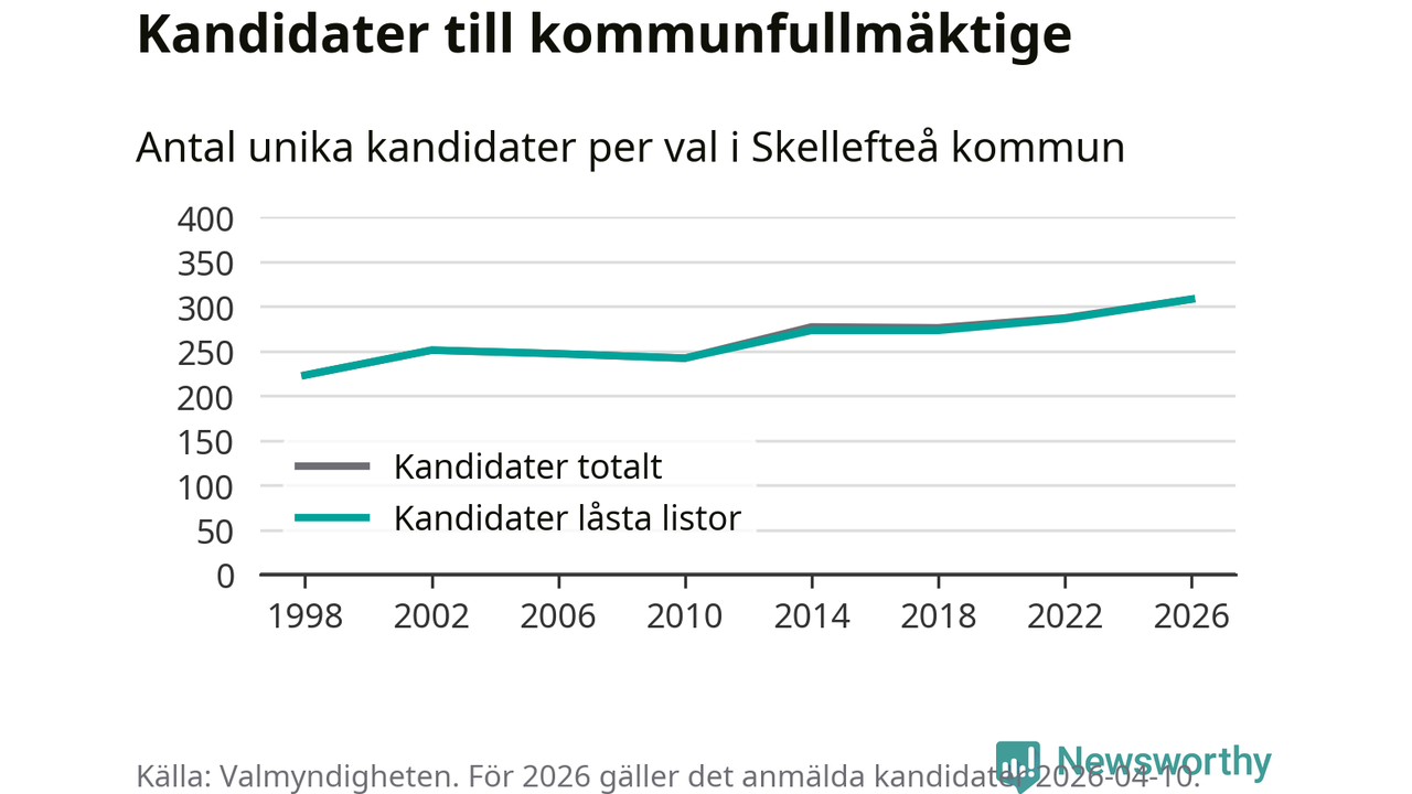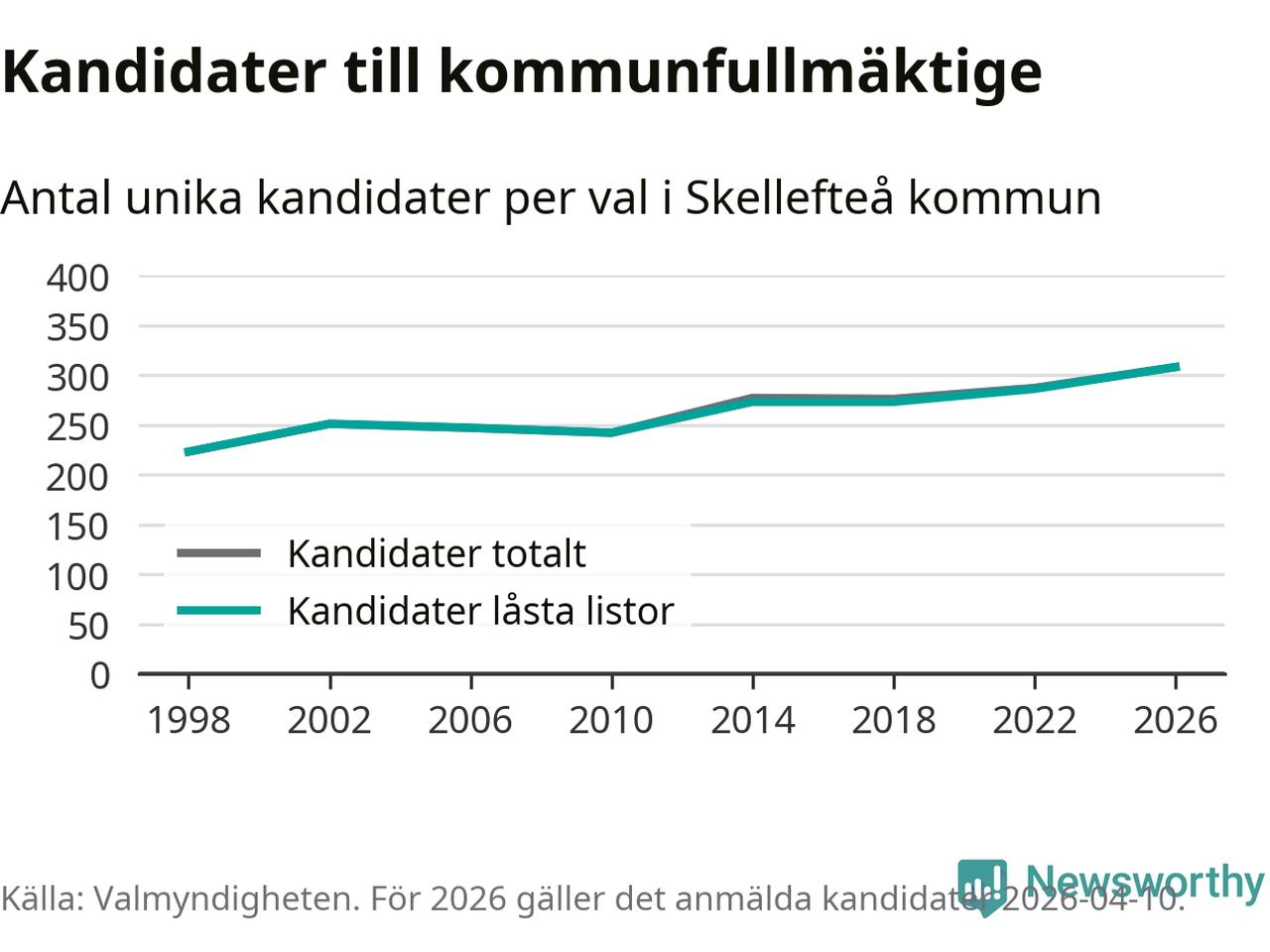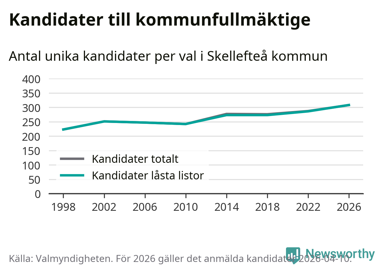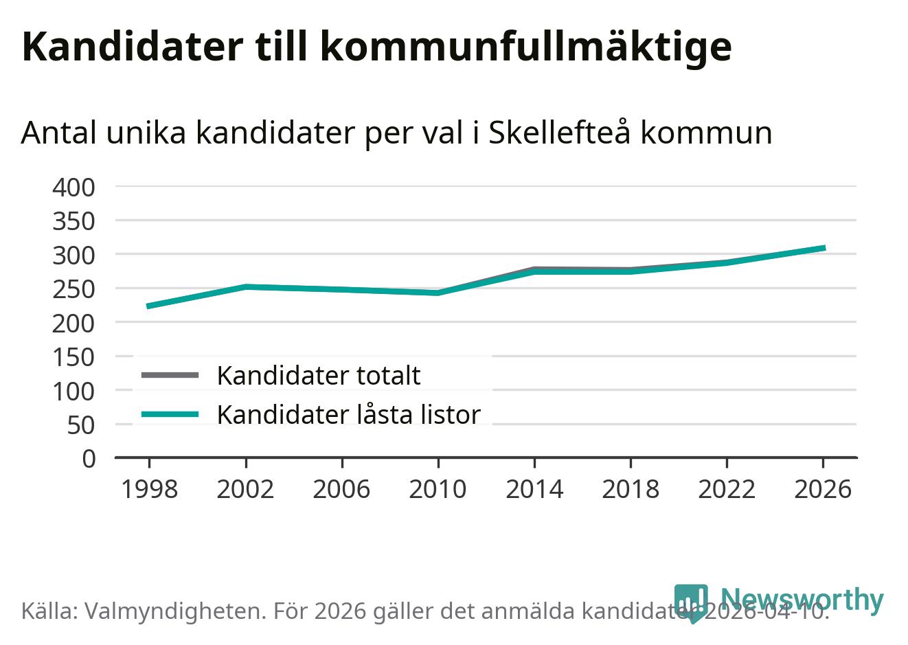 På torsdagen var det deadline för partier med låsta listor att registrera sina kandidater inför höstens val. Till valet till kommunfullmäktige i Skellefteå är 308 kandidater anmälda på sådana listor, vilket är 22 fler än i valet 2022. Det är den högsta siffran sedan åtminstone valet 1998, vilket är så långt tillbaka som vi har statistik för.