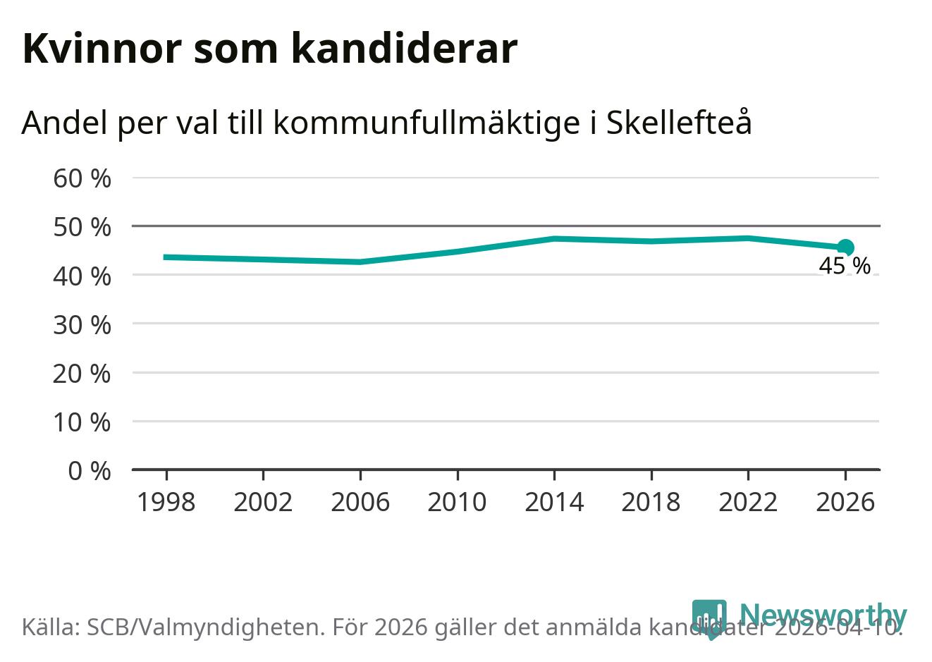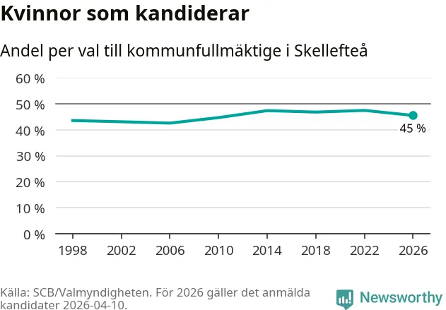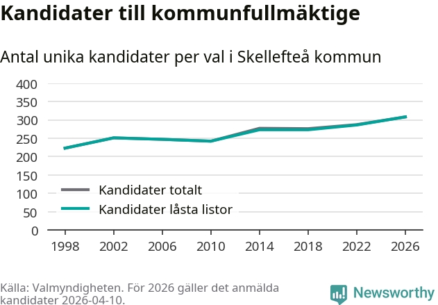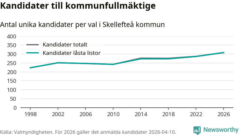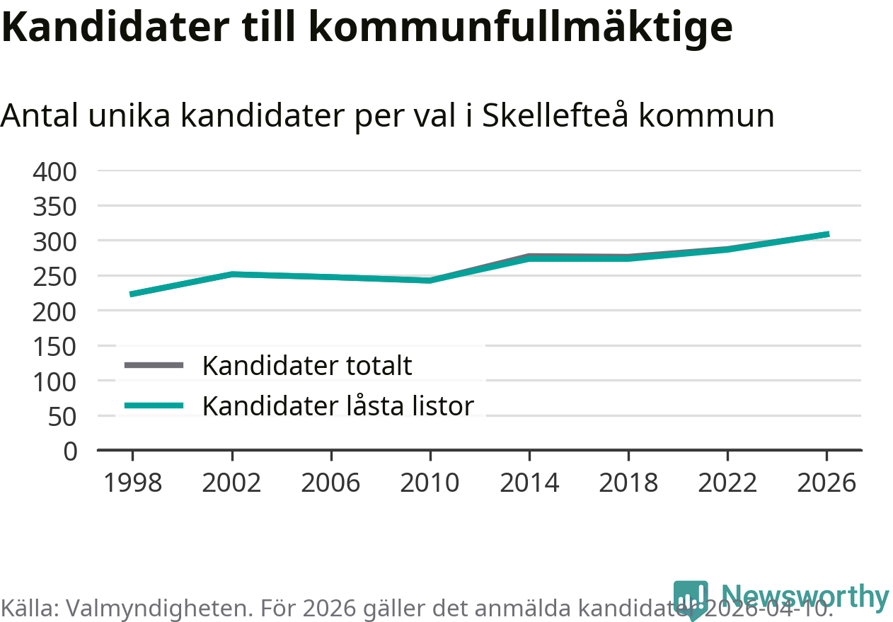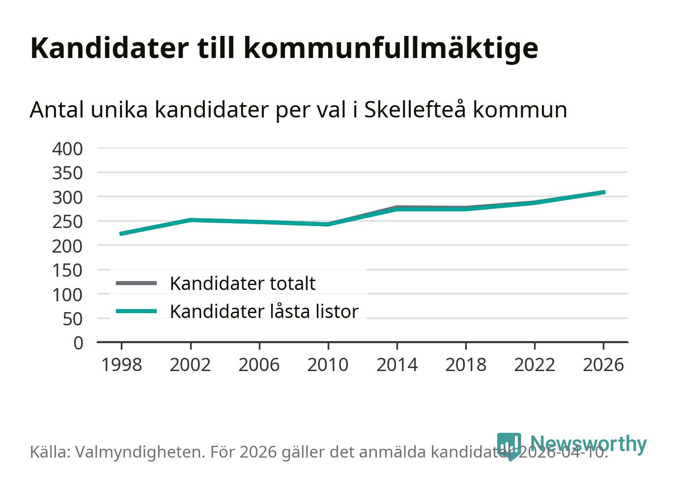 På torsdagen var det deadline för partier med låsta listor att registrera sina kandidater inför höstens val. Till valet till kommunfullmäktige i Skellefteå är 308 kandidater anmälda på sådana listor, vilket är 22 fler än i valet 2022. Det är den högsta siffran sedan åtminstone valet 1998, vilket är så långt tillbaka som vi har statistik för.