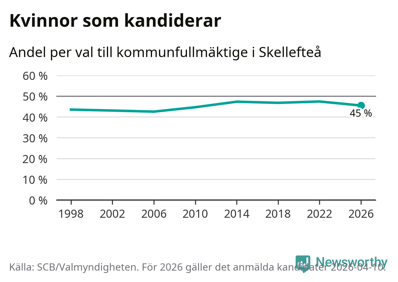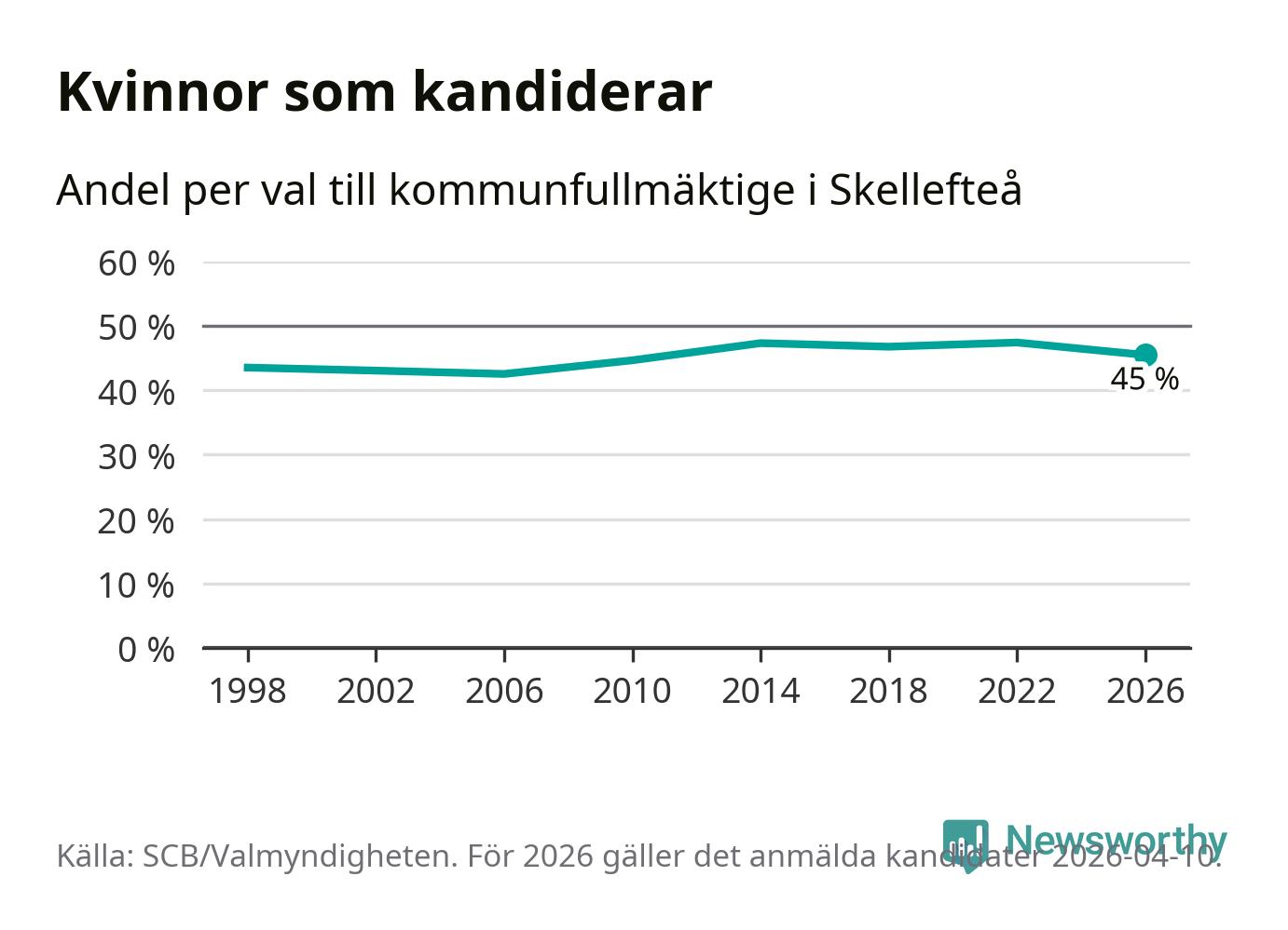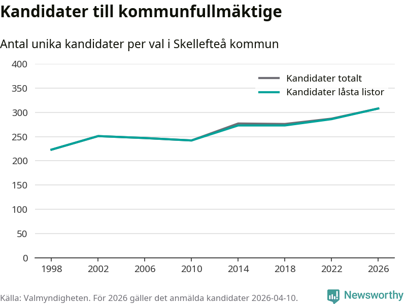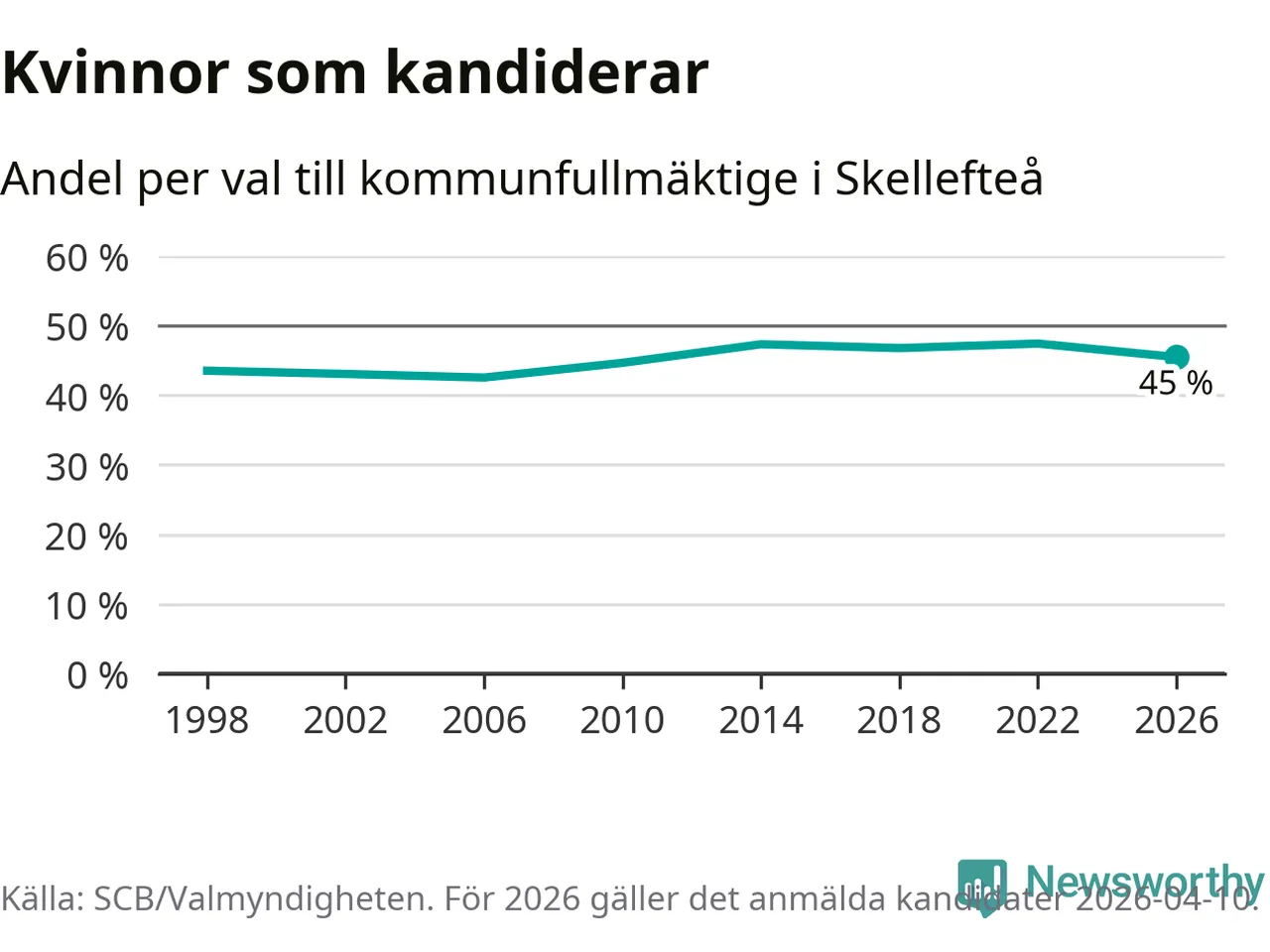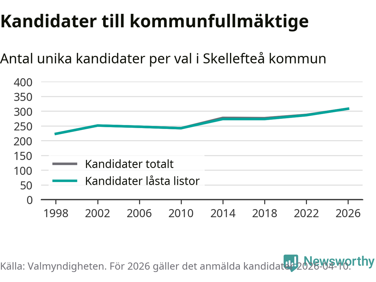 På torsdagen var det deadline för partier med låsta listor att registrera sina kandidater inför höstens val. Till valet till kommunfullmäktige i Skellefteå är 308 kandidater anmälda på sådana listor, vilket är 22 fler än i valet 2022. Det är den högsta siffran sedan åtminstone valet 1998, vilket är så långt tillbaka som vi har statistik för.