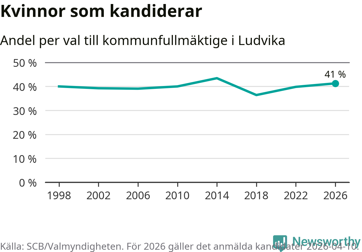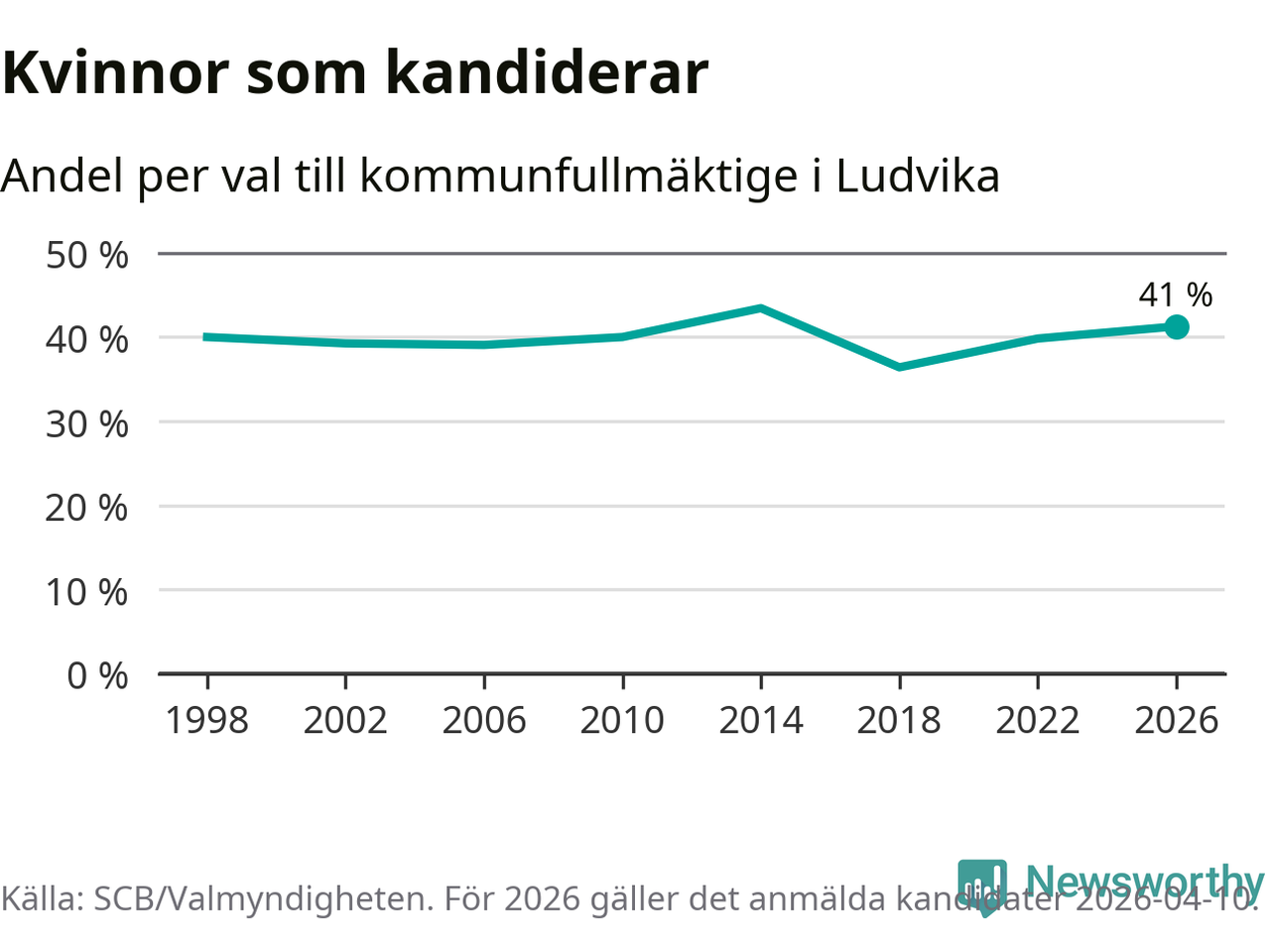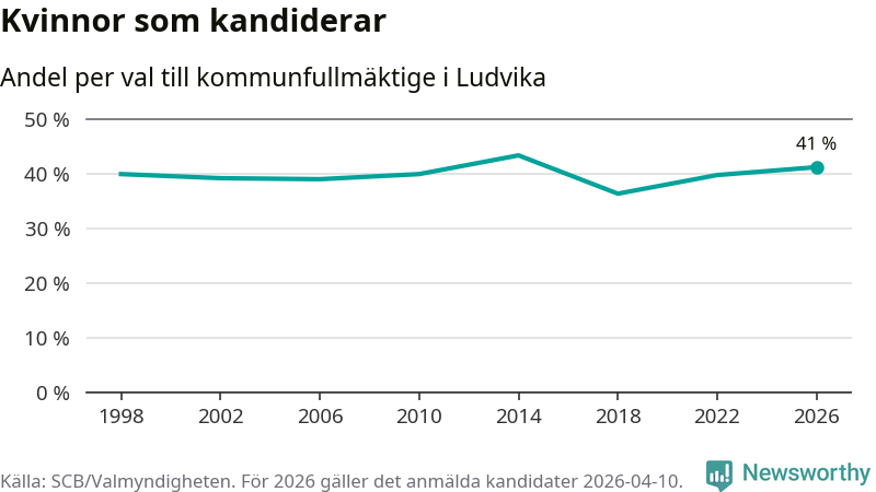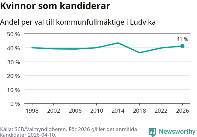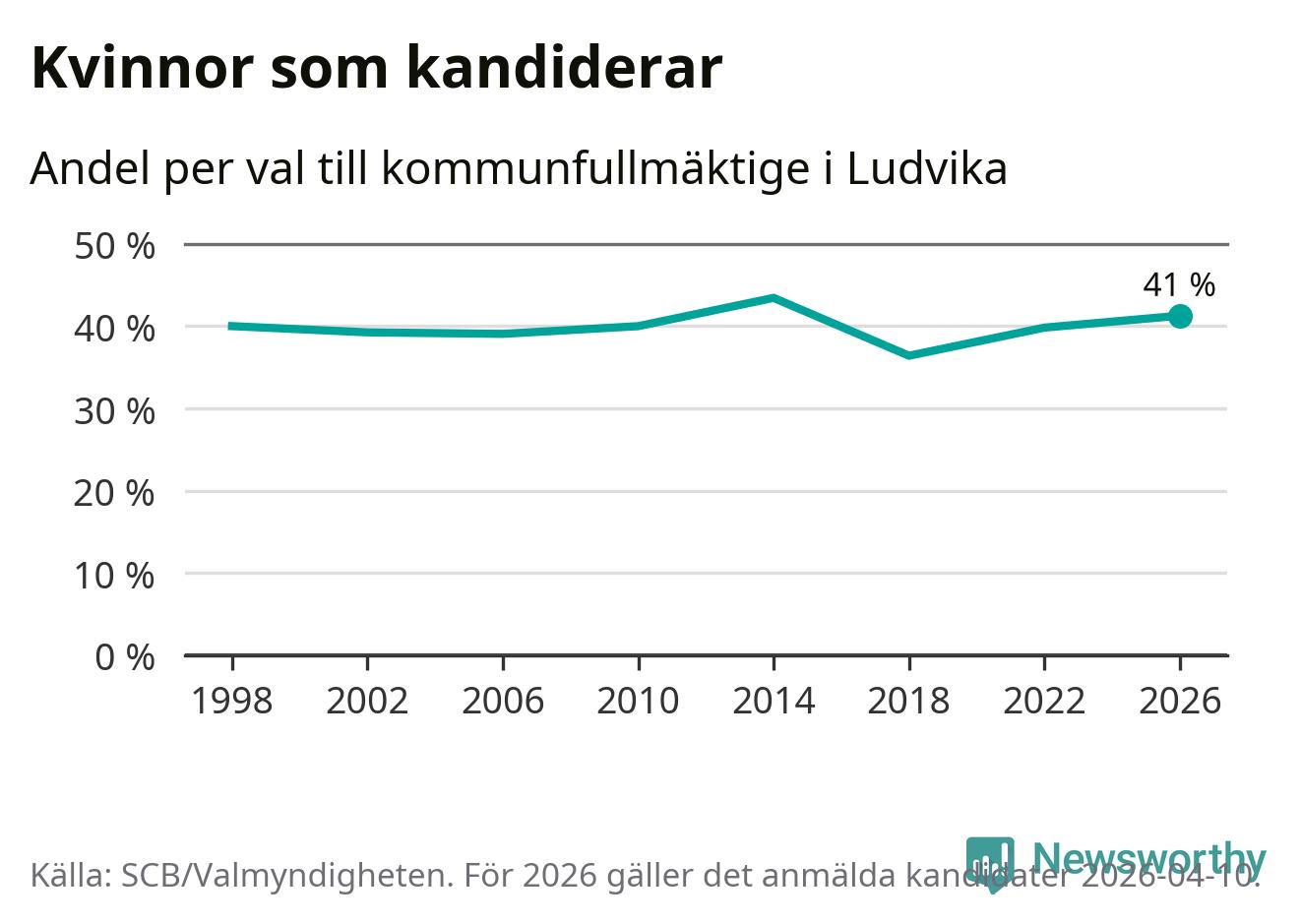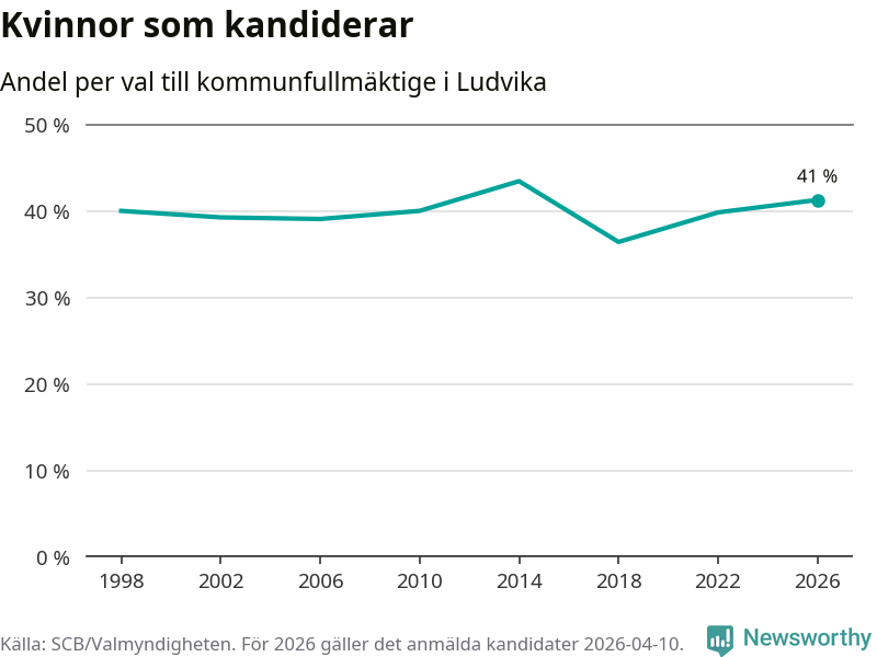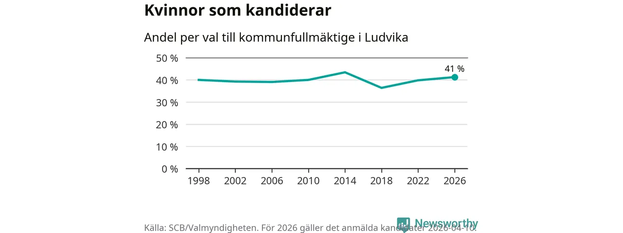 Kvinnorna utgör 41 procent av de hittills anmälda kandidaterna, vilket är den högsta andelen på listorna till kommunfullmäktige i Ludvika sedan valet 2014. Vid valet 2014 var 43 procent kvinnor, valet 2018 var motsvarande siffra 36 procent. Ludvika är en av 264 kommuner i landet där männen utgör en majoritet av kandidaterna på listorna.