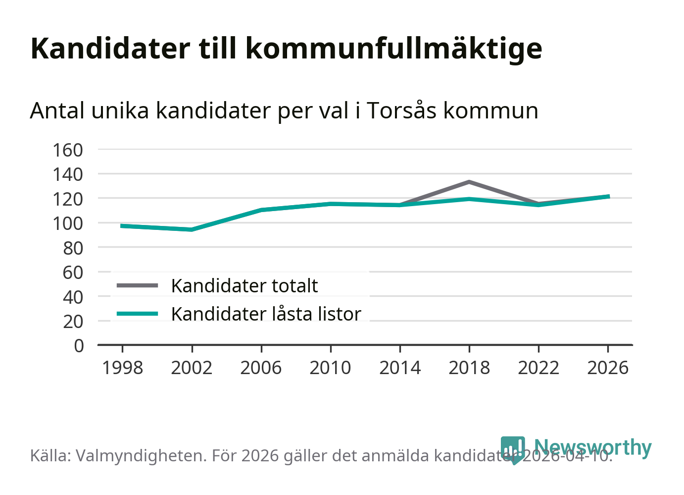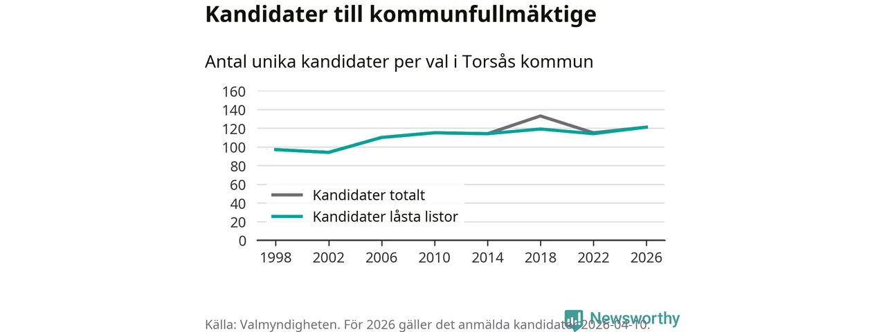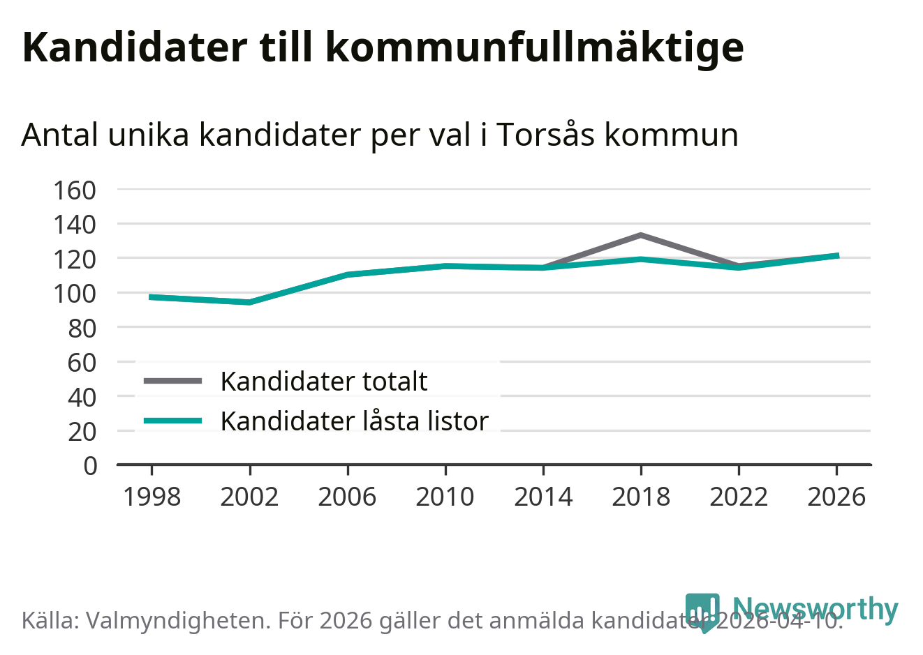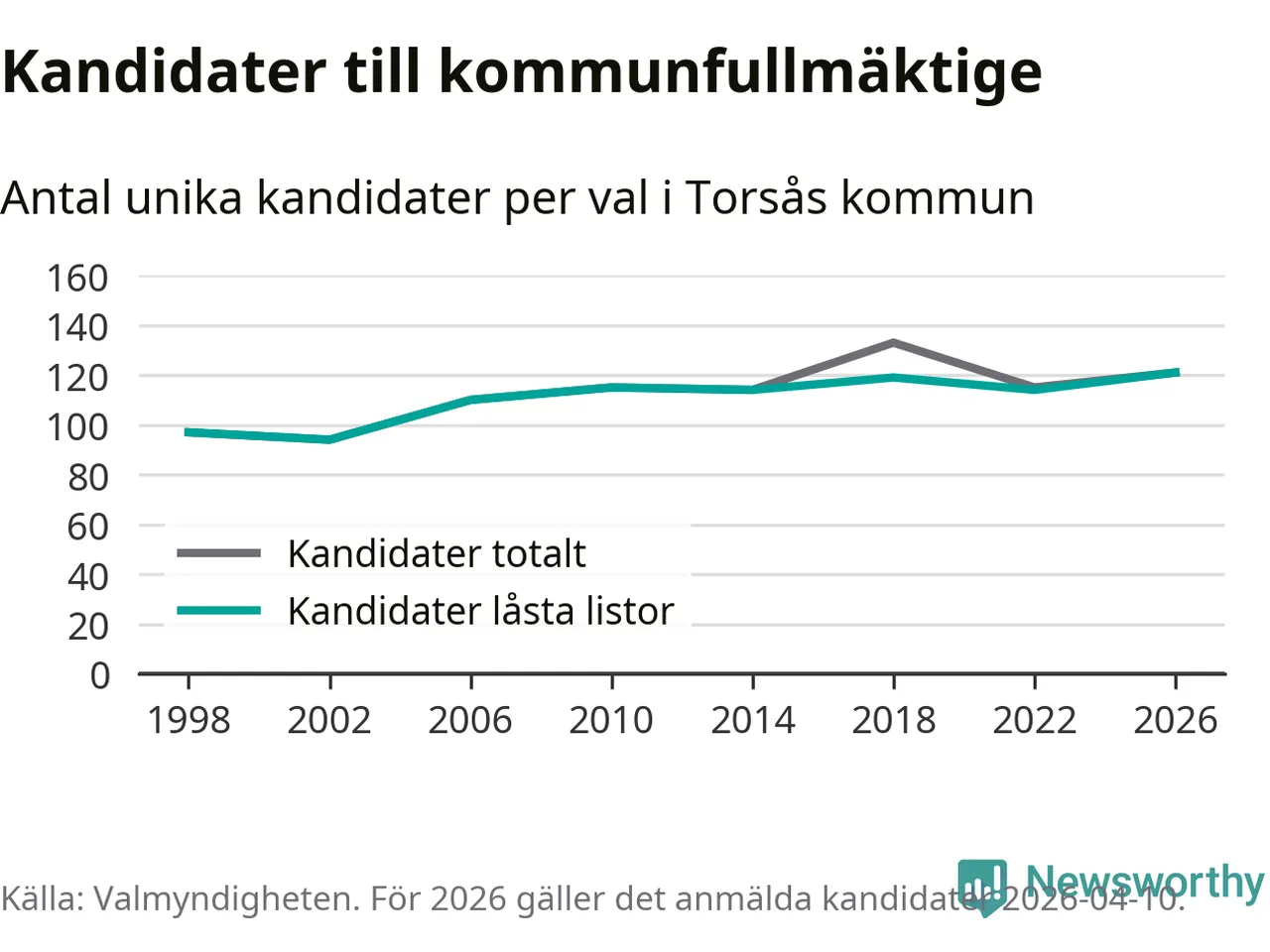På torsdagen var det deadline för partier med låsta listor att registrera sina kandidater inför höstens val. Till valet till kommunfullmäktige i Torsås är 121 kandidater anmälda på sådana listor, vilket är sju fler än i valet 2022. Det är den högsta siffran sedan åtminstone valet 1998, vilket är så långt tillbaka som vi har statistik för.