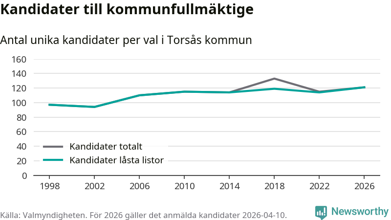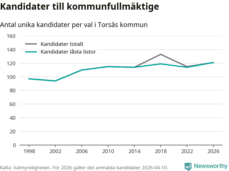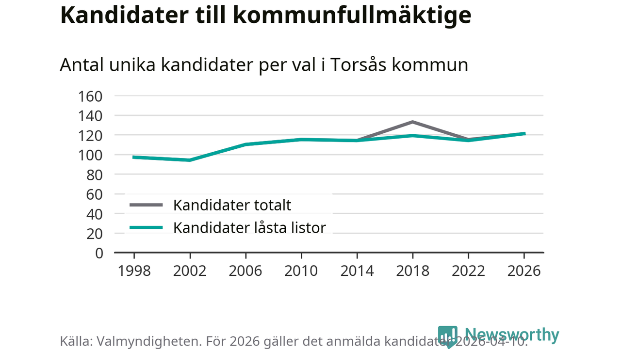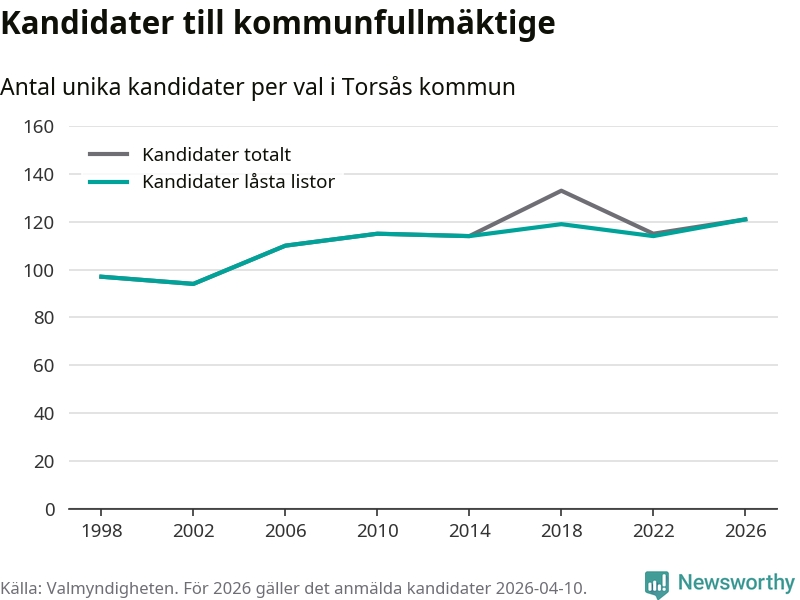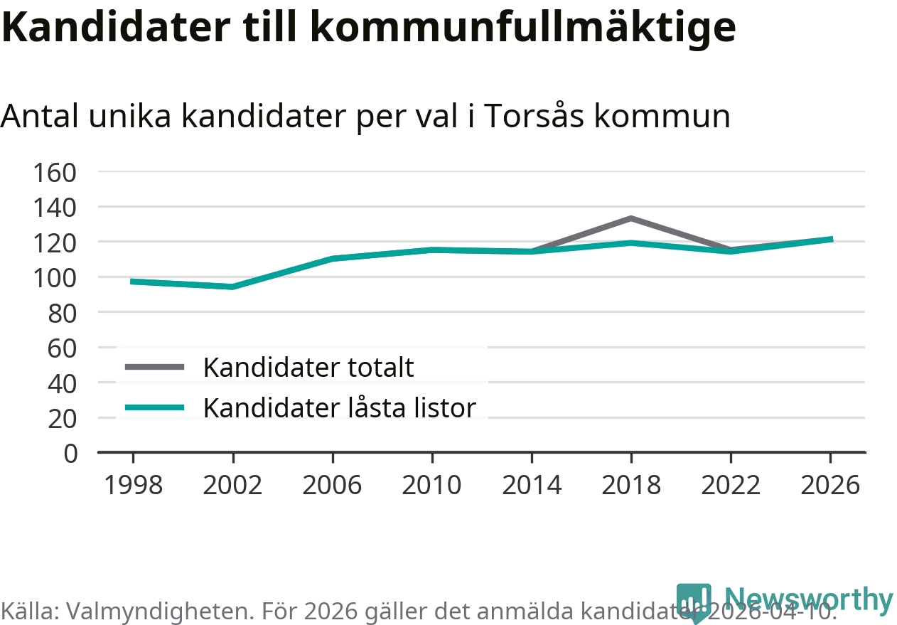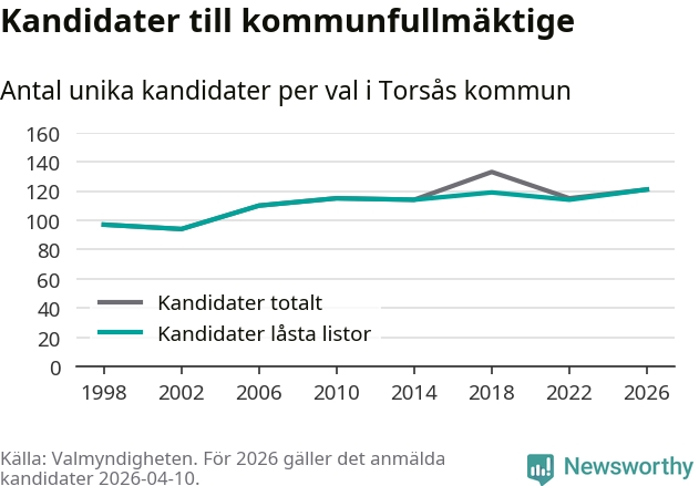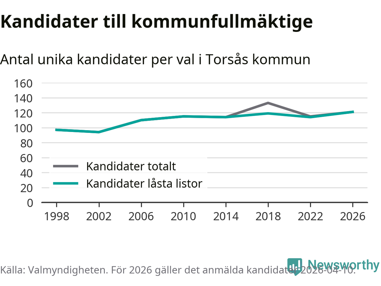 På torsdagen var det deadline för partier med låsta listor att registrera sina kandidater inför höstens val. Till valet till kommunfullmäktige i Torsås är 121 kandidater anmälda på sådana listor, vilket är sju fler än i valet 2022. Det är den högsta siffran sedan åtminstone valet 1998, vilket är så långt tillbaka som vi har statistik för.