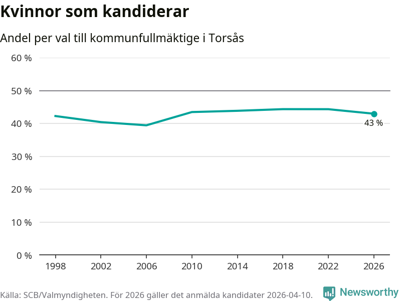 Kvinnorna utgör 43 procent av de hittills anmälda kandidaterna, vilket är den lägsta andelen på listorna till kommunfullmäktige i Torsås sedan valet 2006. Vid valet 2018 var 44 procent kvinnor, valet 2006 var motsvarande siffra 39 procent. Torsås är en av 264 kommuner i landet där männen utgör en majoritet av kandidaterna på listorna.
