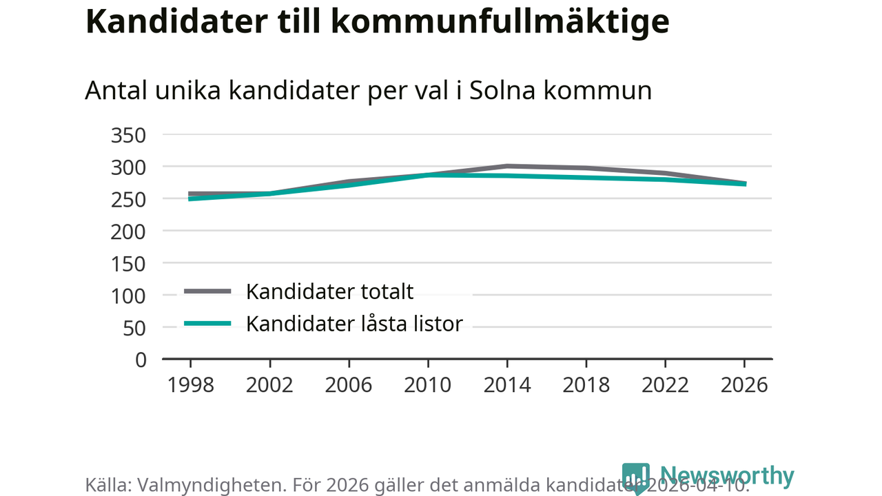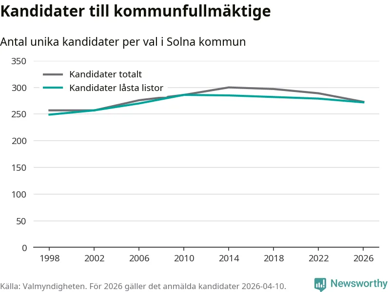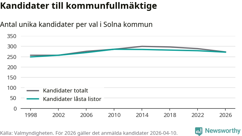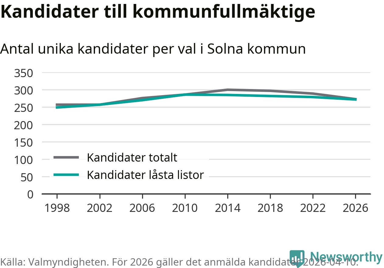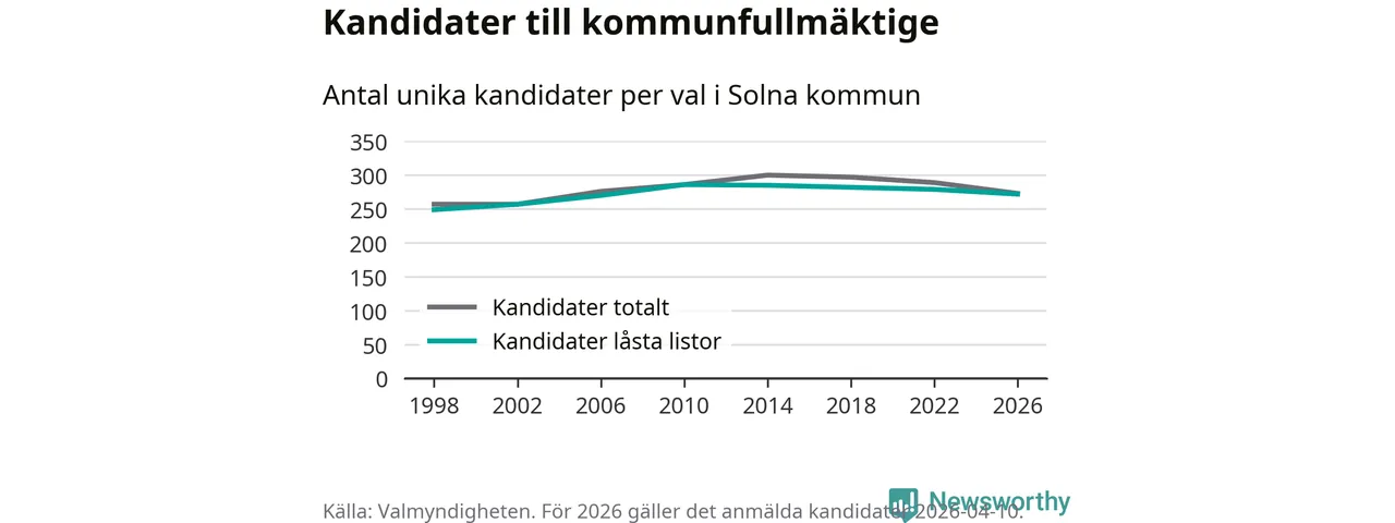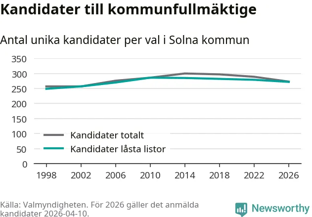 På torsdagen var det deadline för partier med låsta listor att registrera sina kandidater inför höstens val. Till valet till kommunfullmäktige i Solna är 272 kandidater anmälda på sådana listor, vilket är sju färre än i valet 2022.