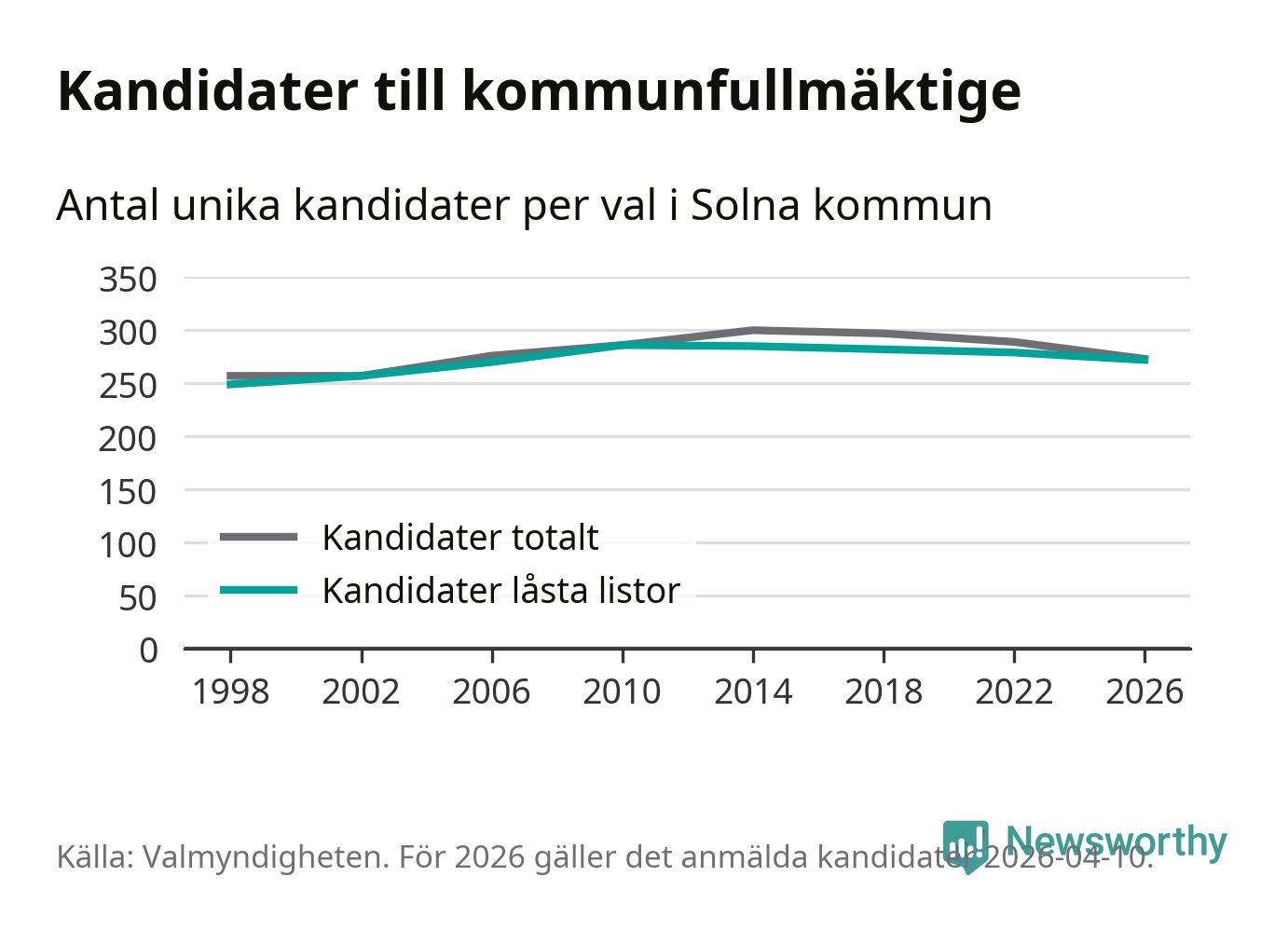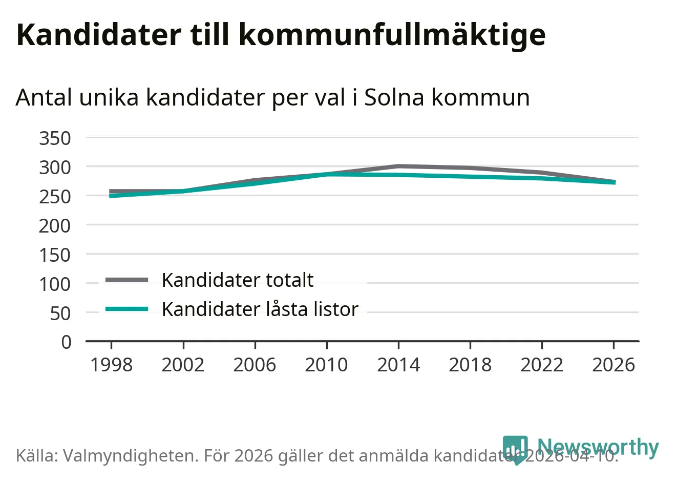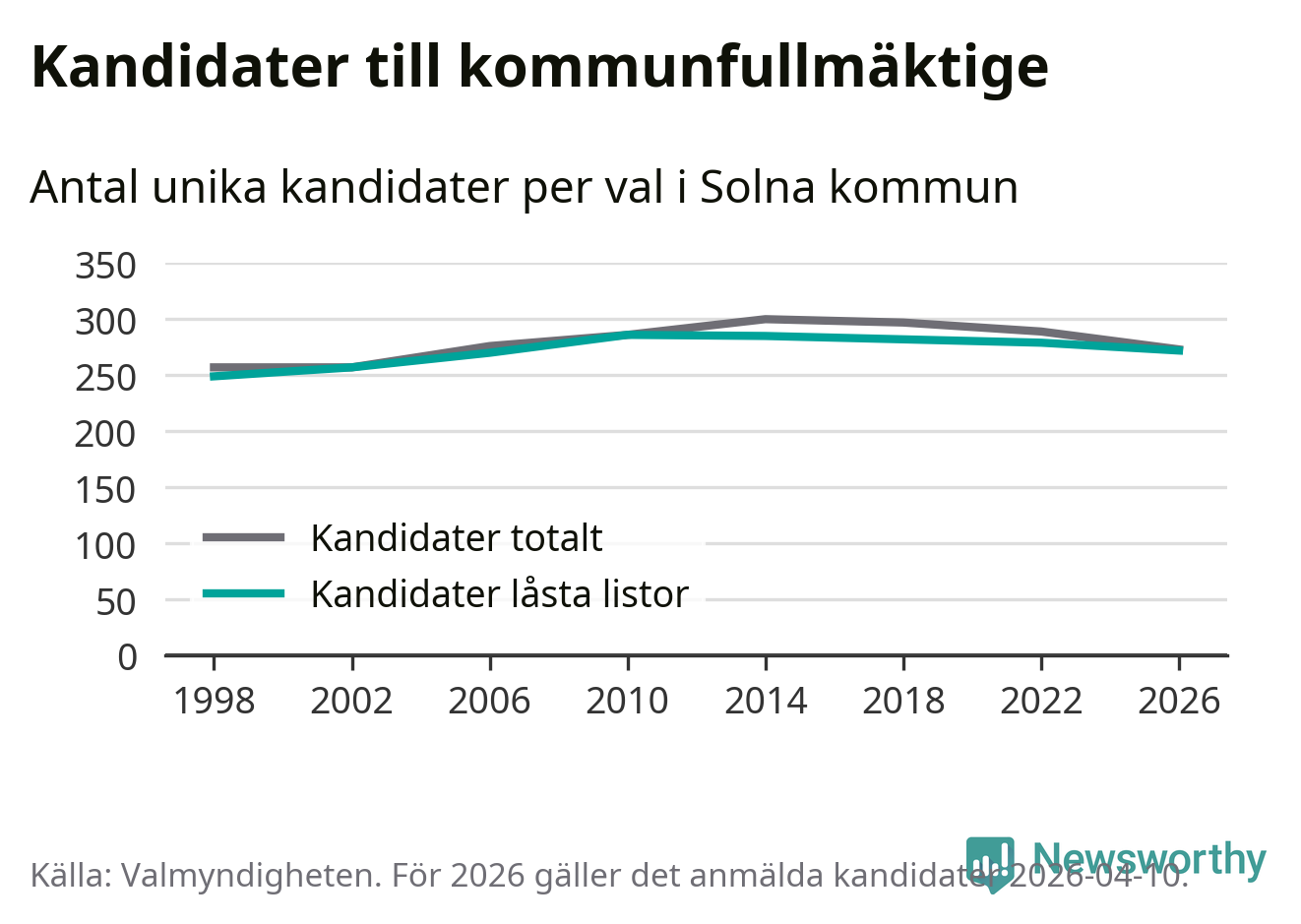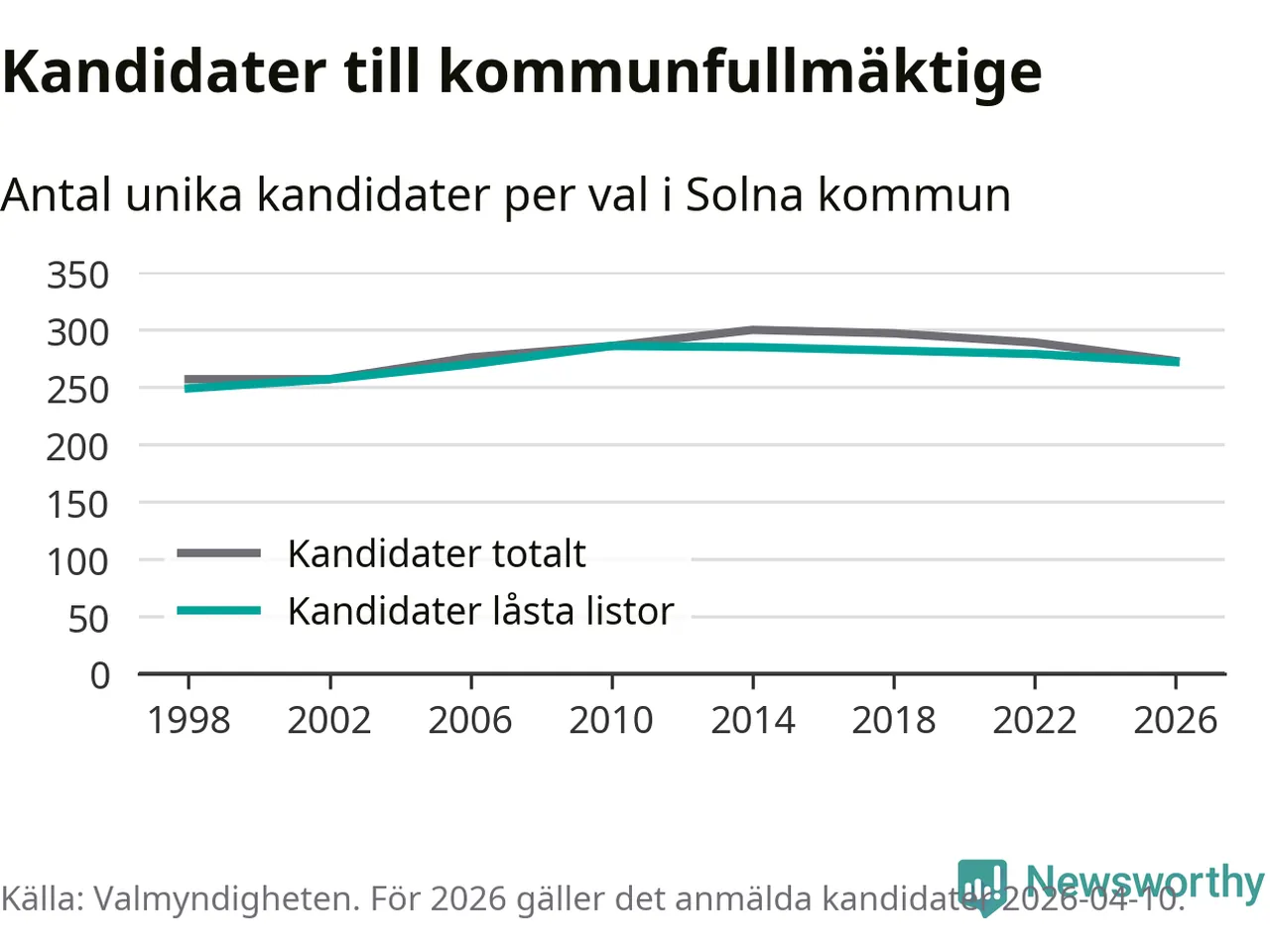 På torsdagen var det deadline för partier med låsta listor att registrera sina kandidater inför höstens val. Till valet till kommunfullmäktige i Solna är 272 kandidater anmälda på sådana listor, vilket är sju färre än i valet 2022.