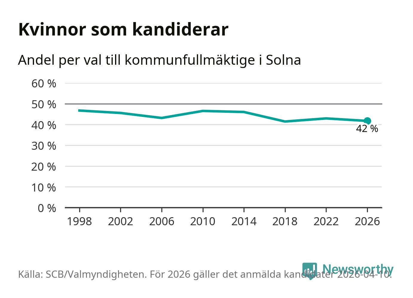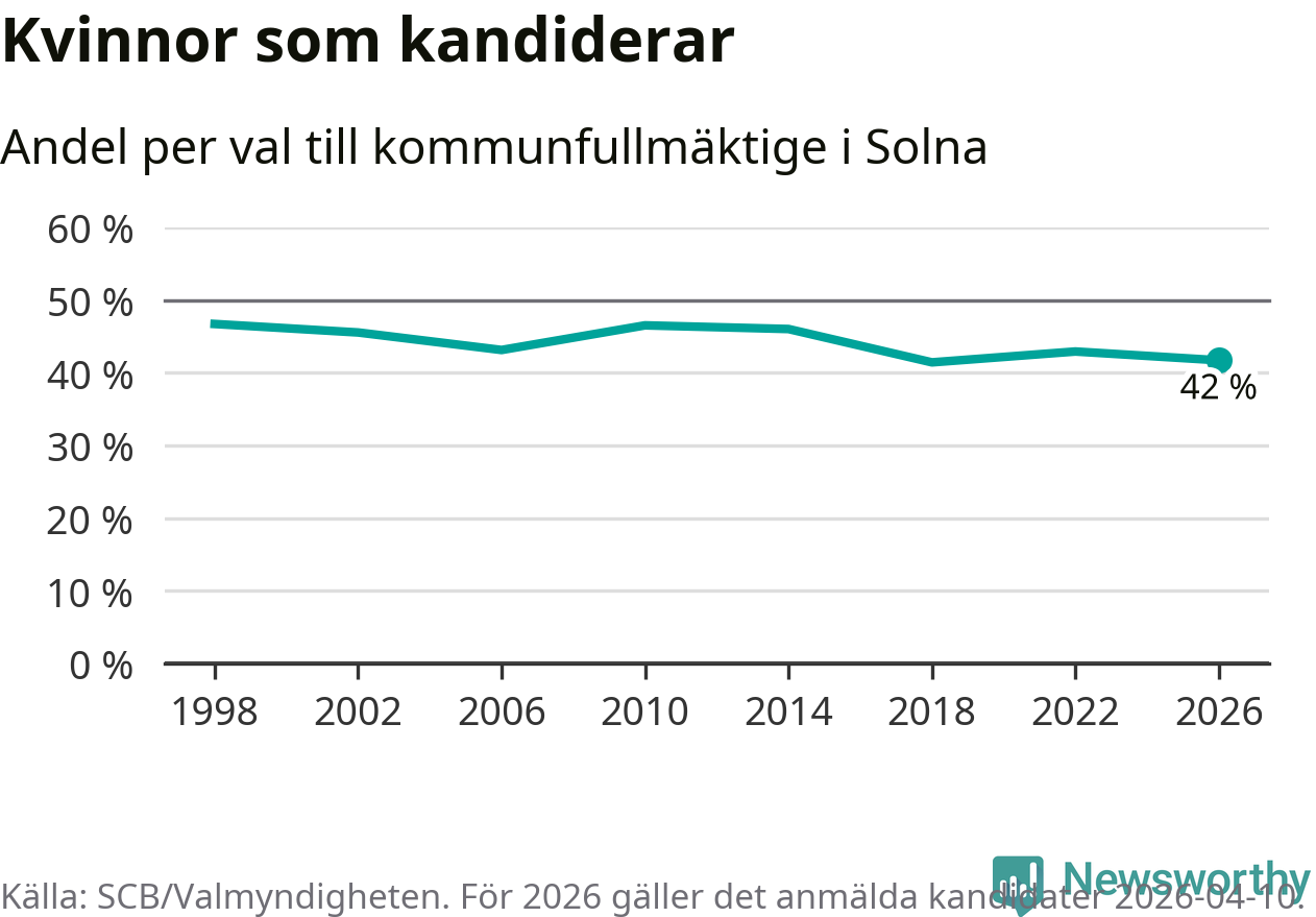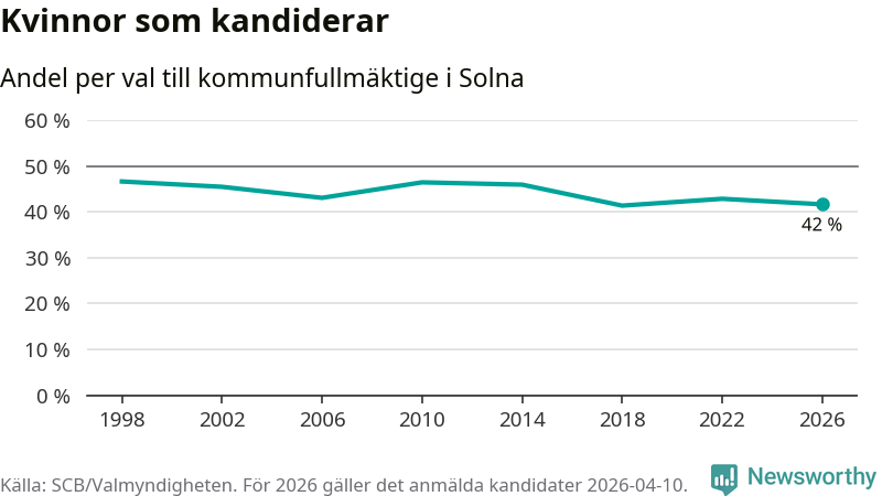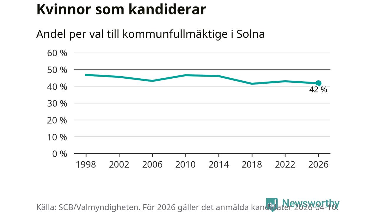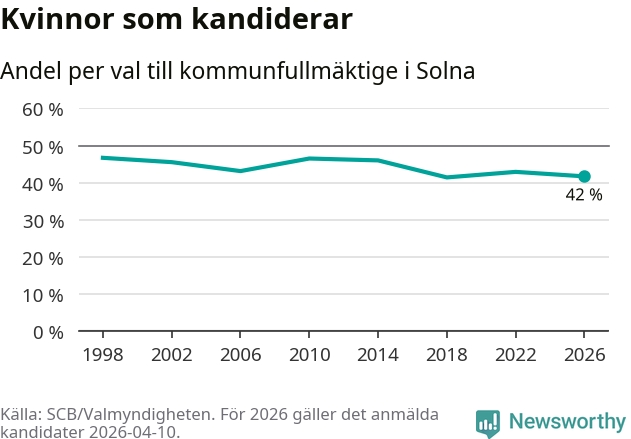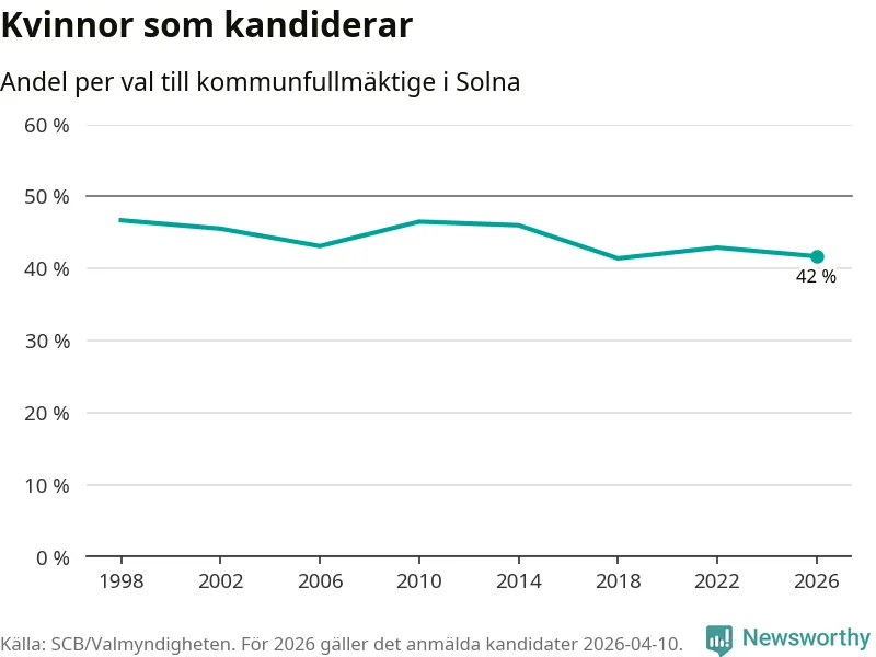 Kvinnorna utgör 42 procent av de hittills anmälda kandidaterna. Vid valet 1998 var 47 procent kvinnor, valet 2018 var motsvarande siffra 41 procent. Solna är en av 264 kommuner i landet där männen utgör en majoritet av kandidaterna på listorna.