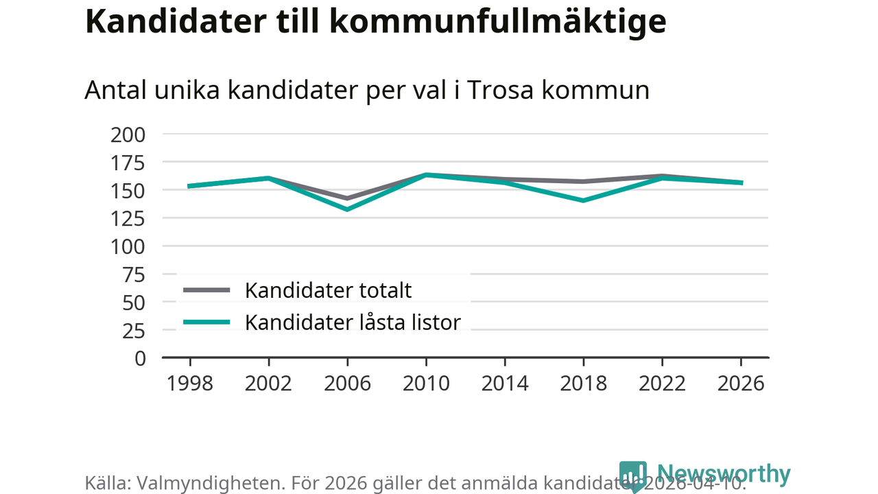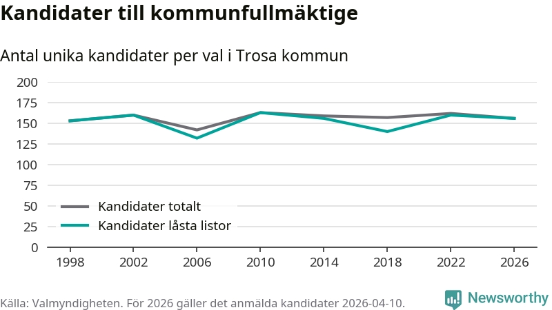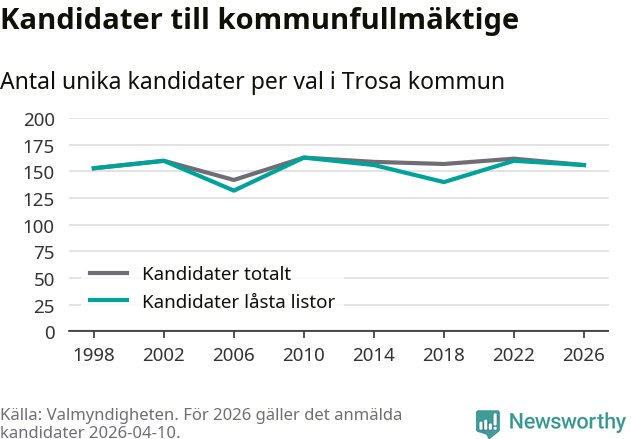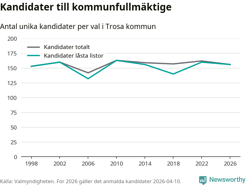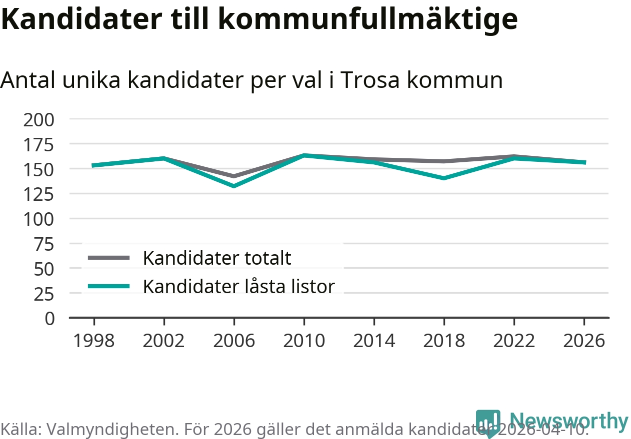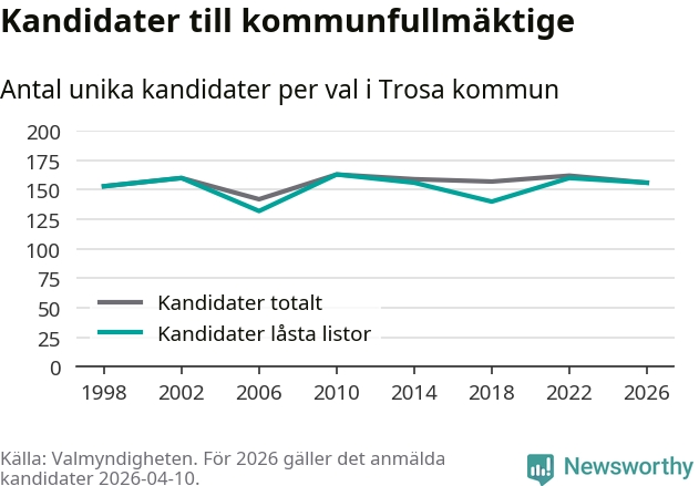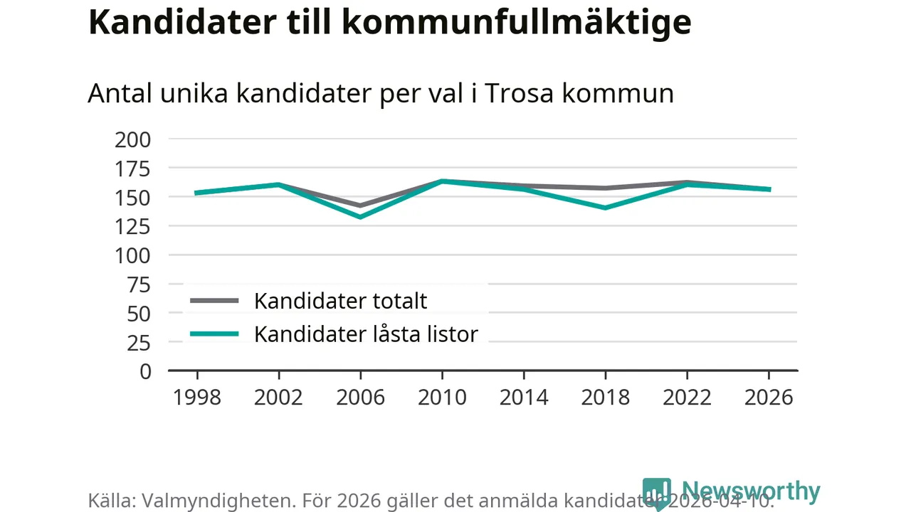 På torsdagen var det deadline för partier med låsta listor att registrera sina kandidater inför höstens val. Till valet till kommunfullmäktige i Trosa är 156 kandidater anmälda på sådana listor, vilket är fyra färre än i valet 2022.