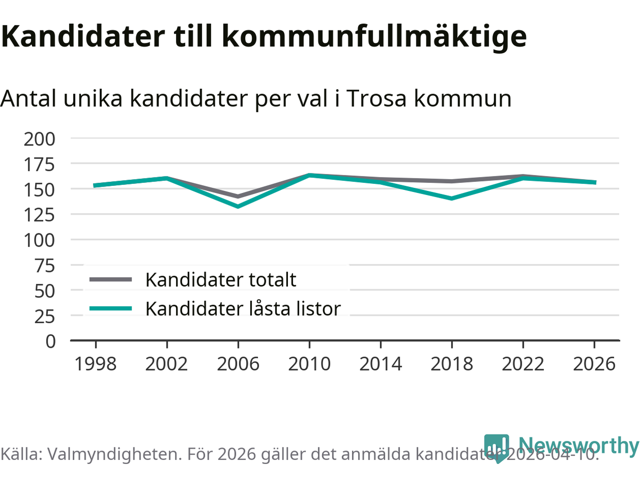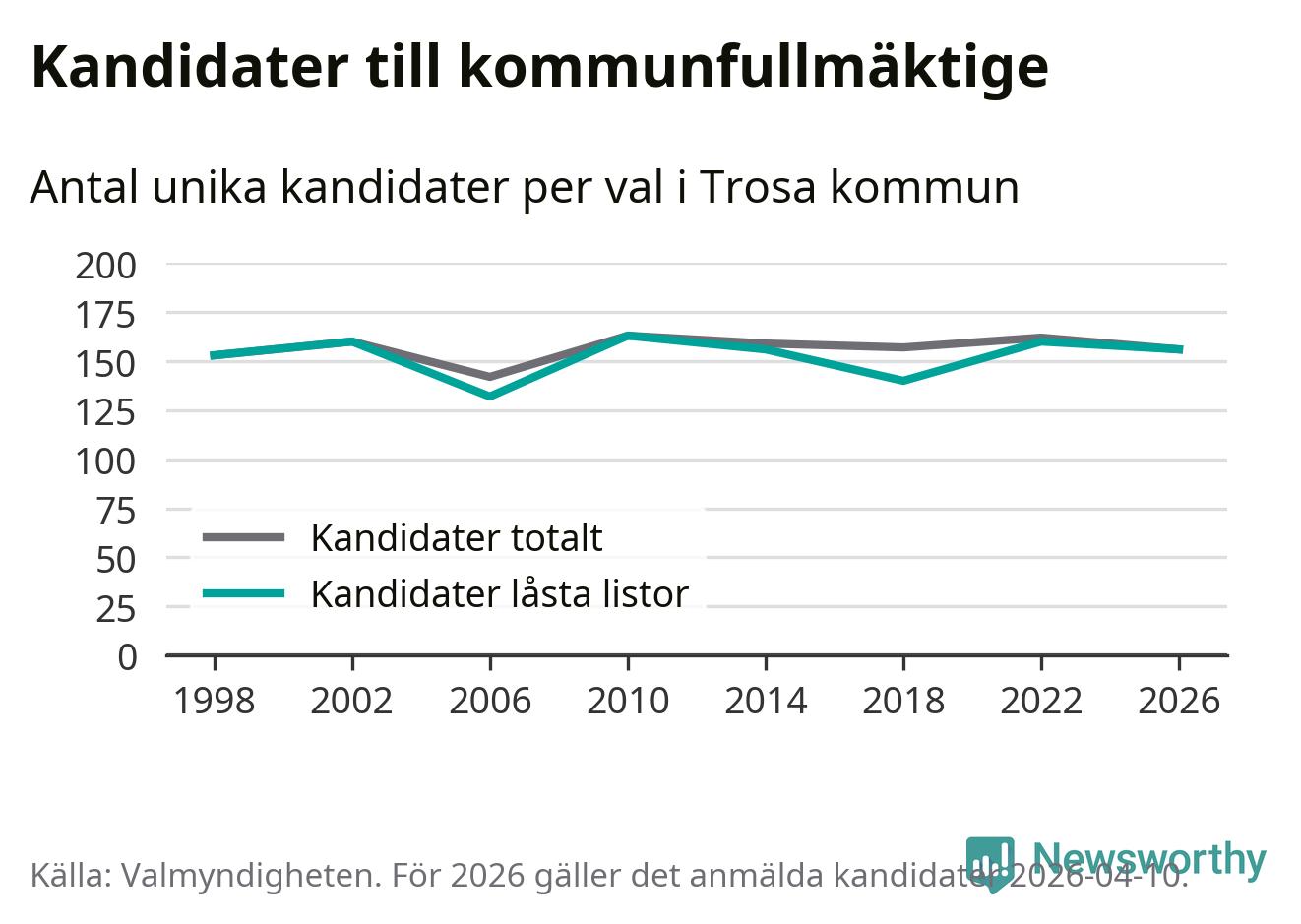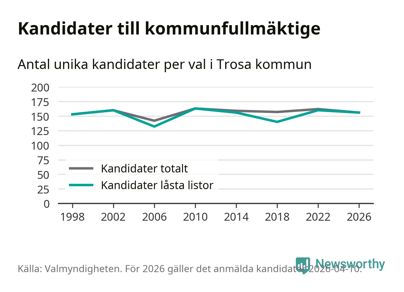 På torsdagen var det deadline för partier med låsta listor att registrera sina kandidater inför höstens val. Till valet till kommunfullmäktige i Trosa är 156 kandidater anmälda på sådana listor, vilket är fyra färre än i valet 2022.