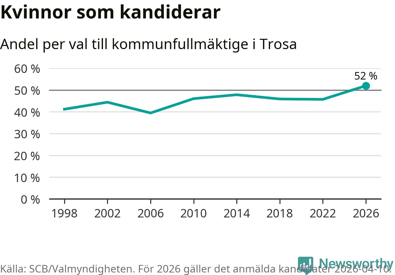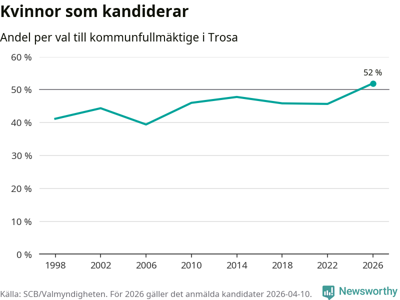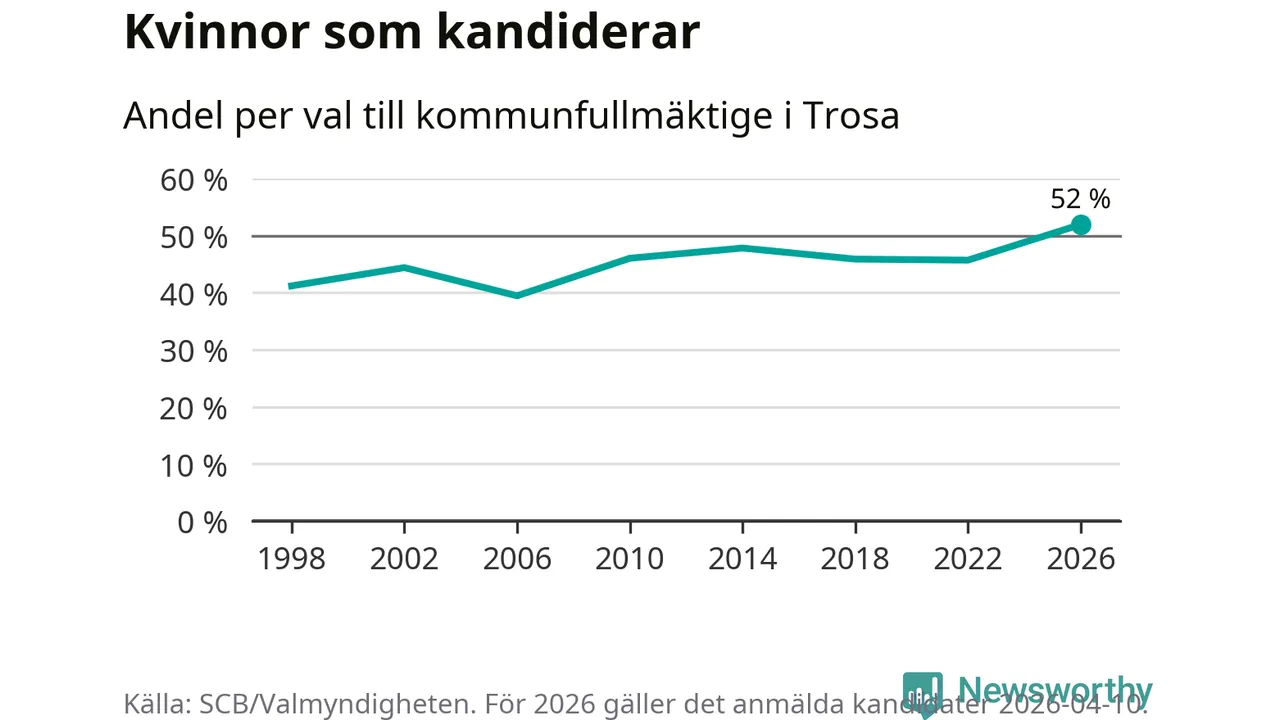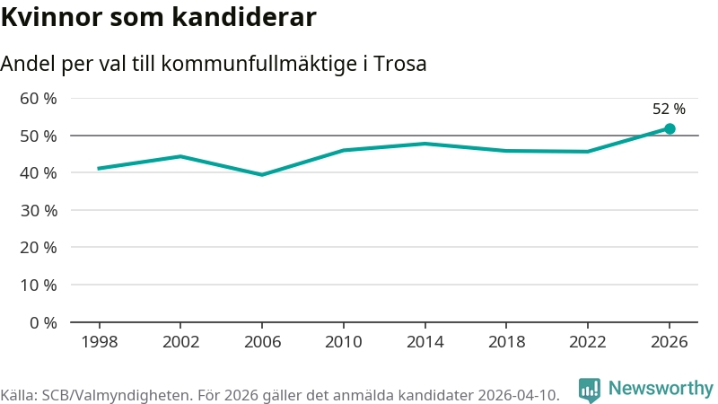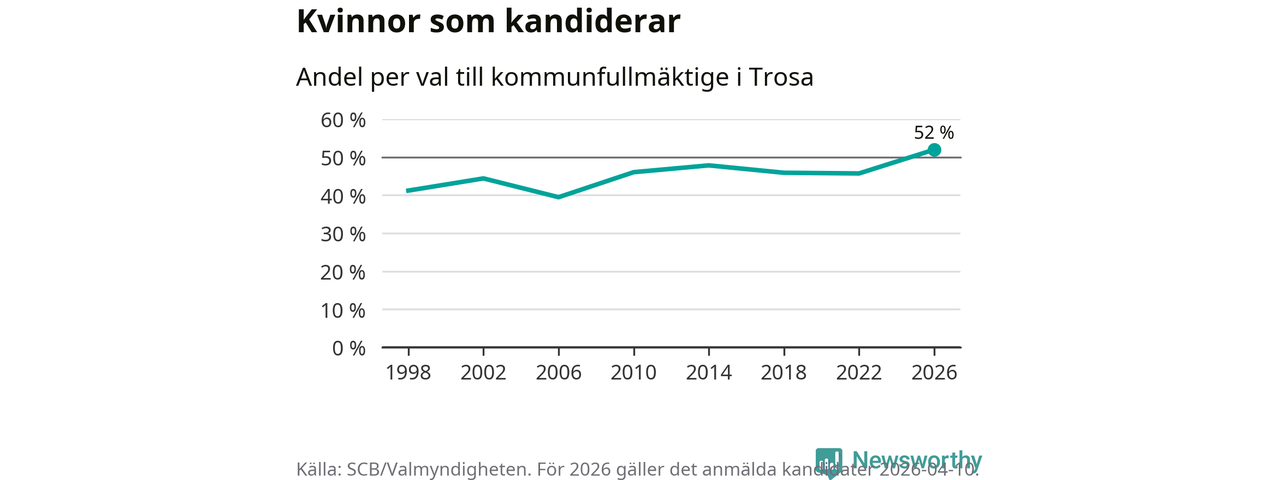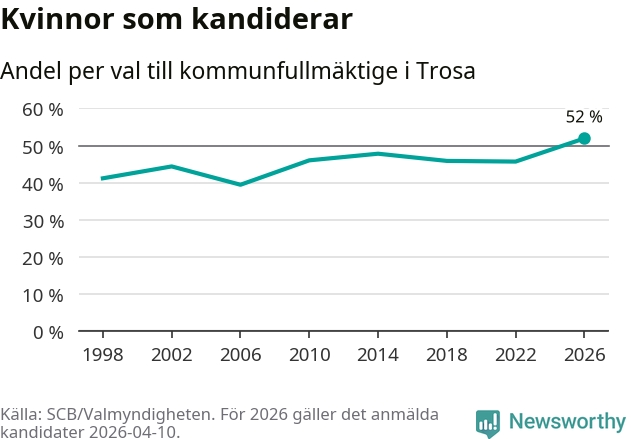 Kvinnorna utgör 52 procent av de hittills anmälda kandidaterna, vilket är den högsta andelen på listorna till kommunfullmäktige i Trosa sedan åtminstone valet 1998. Trosa är en av 26 kommuner i landet där kvinnorna utgör hälften eller mer av kandidaterna på listorna.