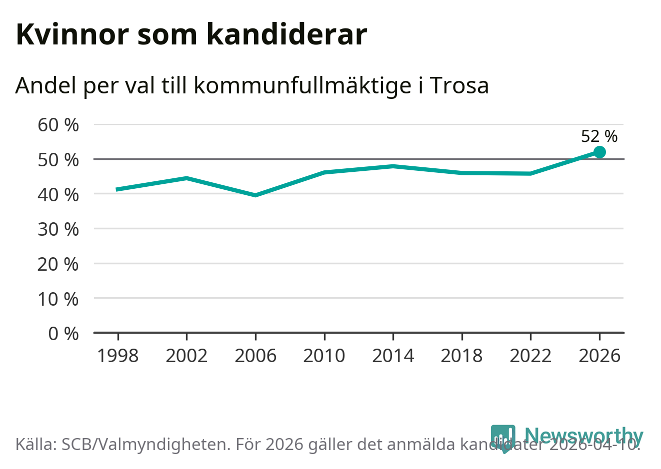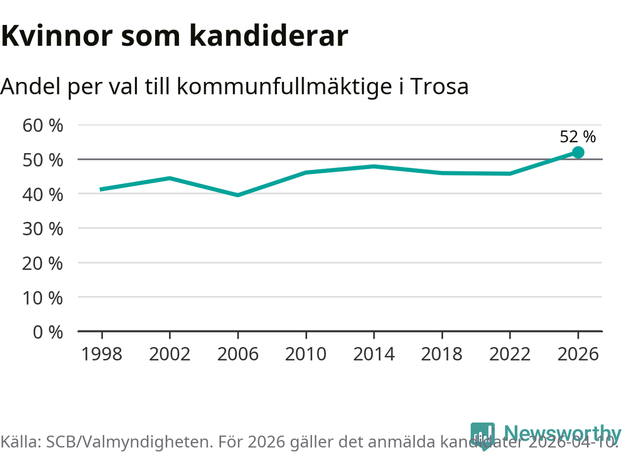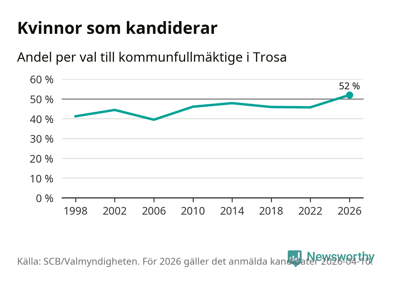 Kvinnorna utgör 52 procent av de hittills anmälda kandidaterna, vilket är den högsta andelen på listorna till kommunfullmäktige i Trosa sedan åtminstone valet 1998. Trosa är en av 26 kommuner i landet där kvinnorna utgör hälften eller mer av kandidaterna på listorna.