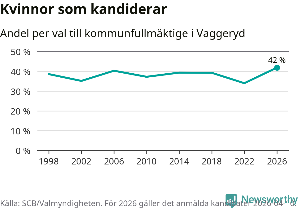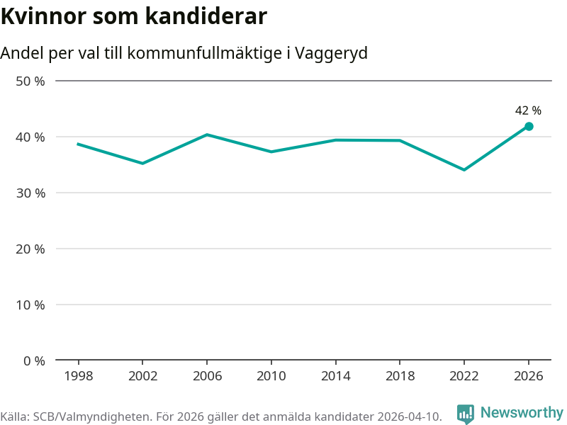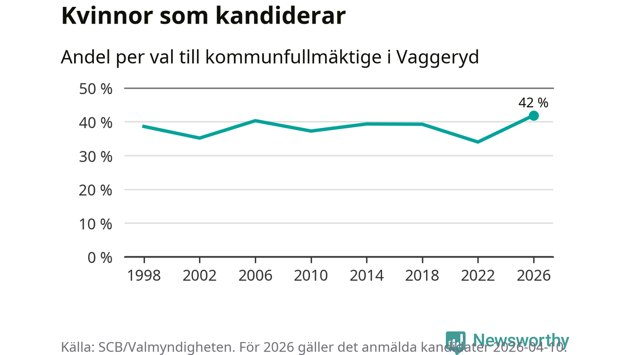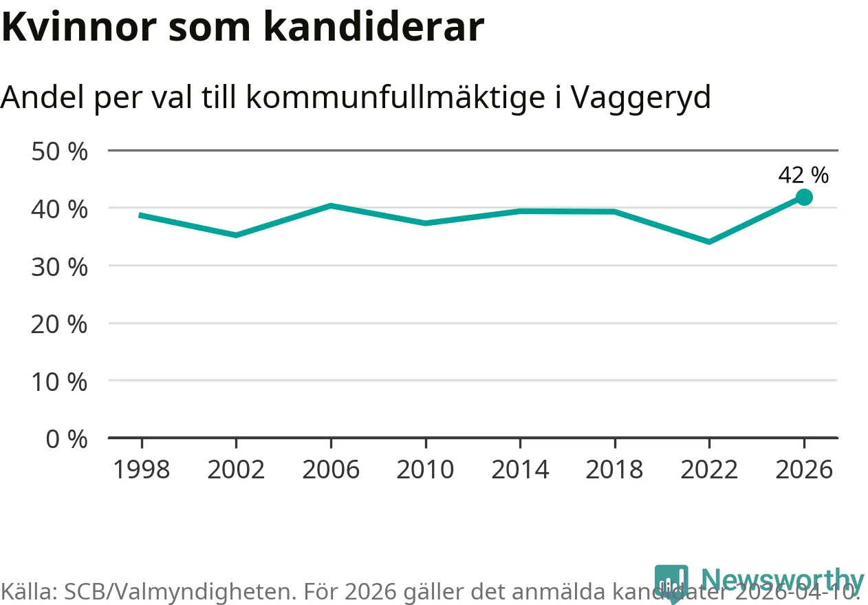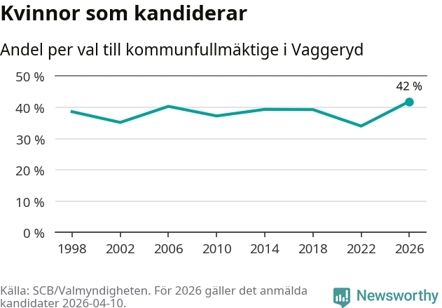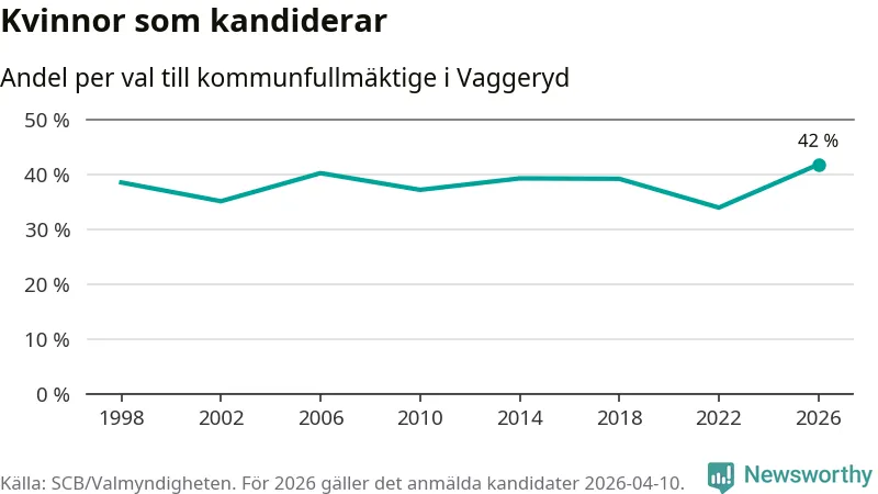 Kvinnorna utgör 42 procent av de hittills anmälda kandidaterna, vilket är den högsta andelen på listorna till kommunfullmäktige i Vaggeryd sedan åtminstone valet 1998. Vaggeryd är en av 264 kommuner i landet där männen utgör en majoritet av kandidaterna på listorna.