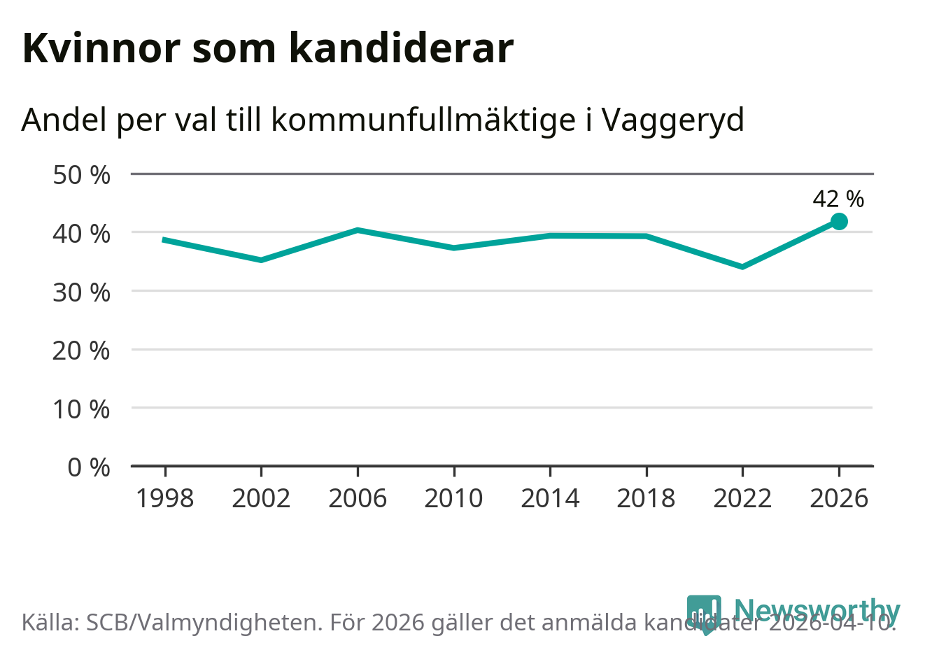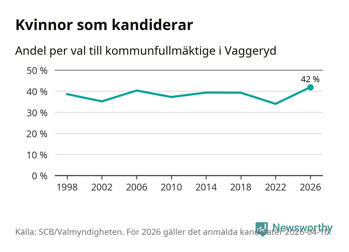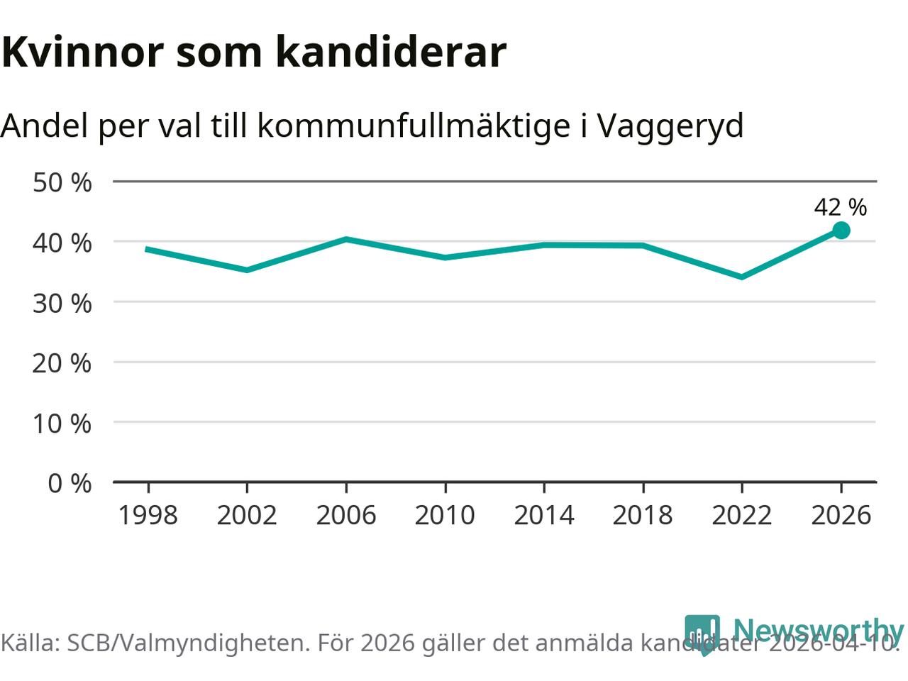 Kvinnorna utgör 42 procent av de hittills anmälda kandidaterna, vilket är den högsta andelen på listorna till kommunfullmäktige i Vaggeryd sedan åtminstone valet 1998. Vaggeryd är en av 264 kommuner i landet där männen utgör en majoritet av kandidaterna på listorna.