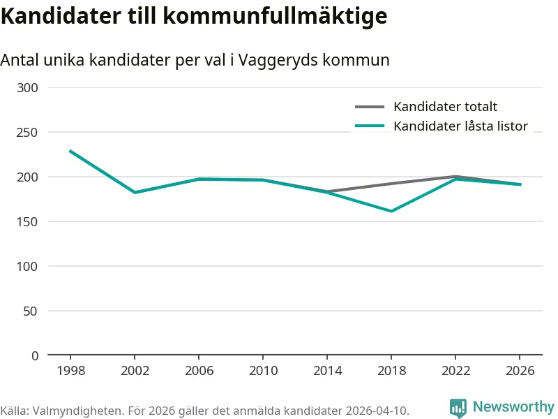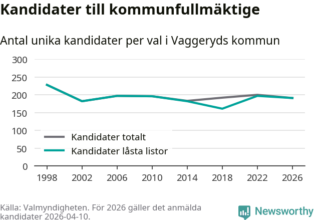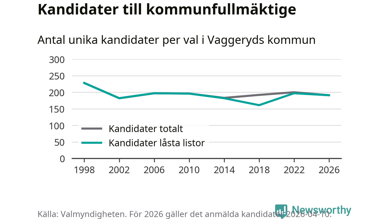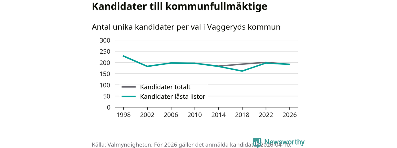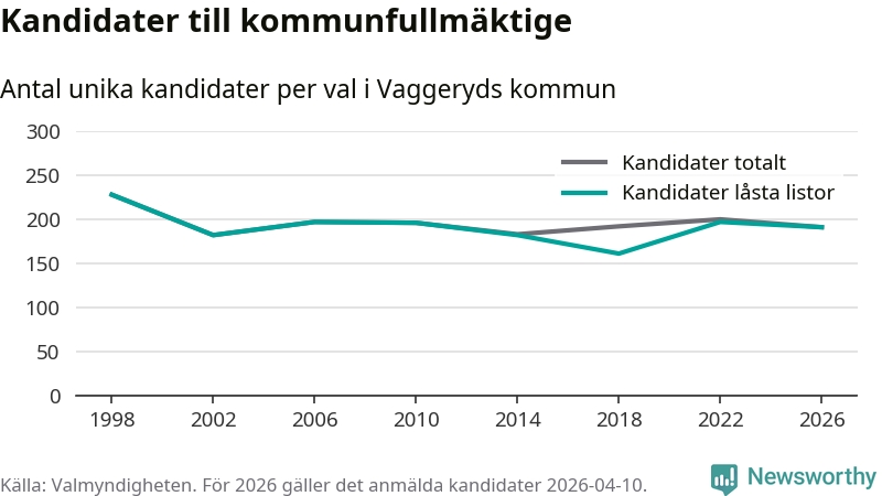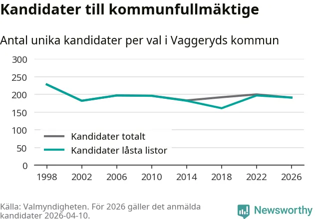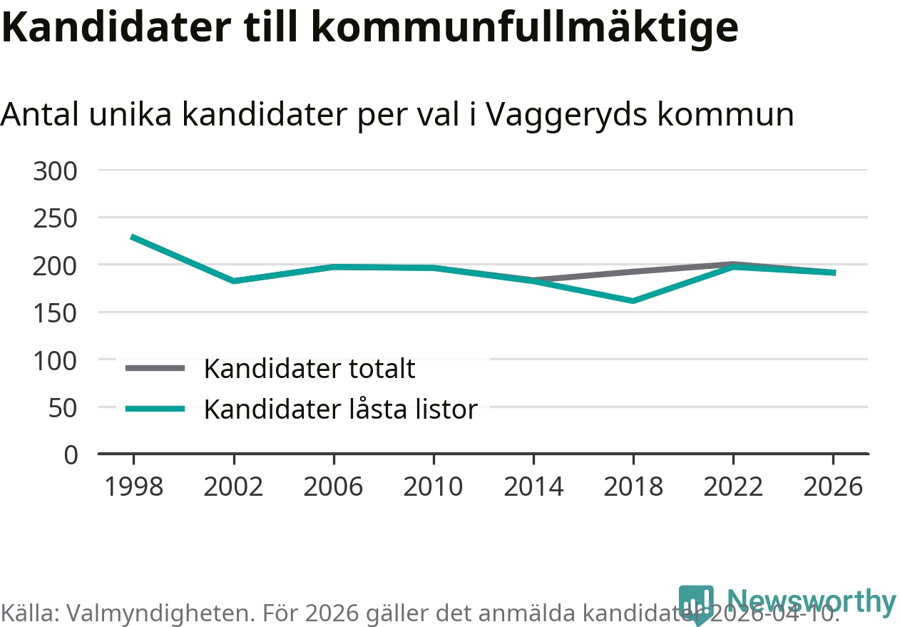 På torsdagen var det deadline för partier med låsta listor att registrera sina kandidater inför höstens val. Till valet till kommunfullmäktige i Vaggeryd är 191 kandidater anmälda på sådana listor, vilket är sex färre än i valet 2022.