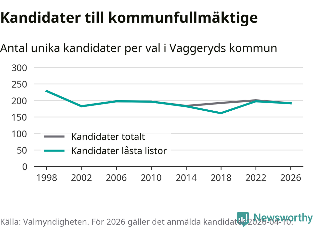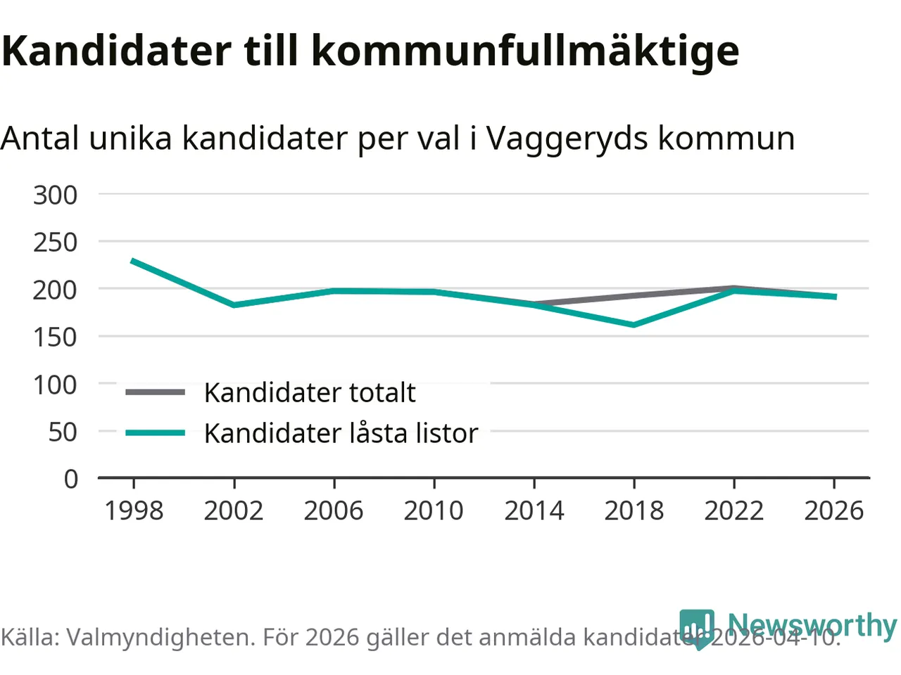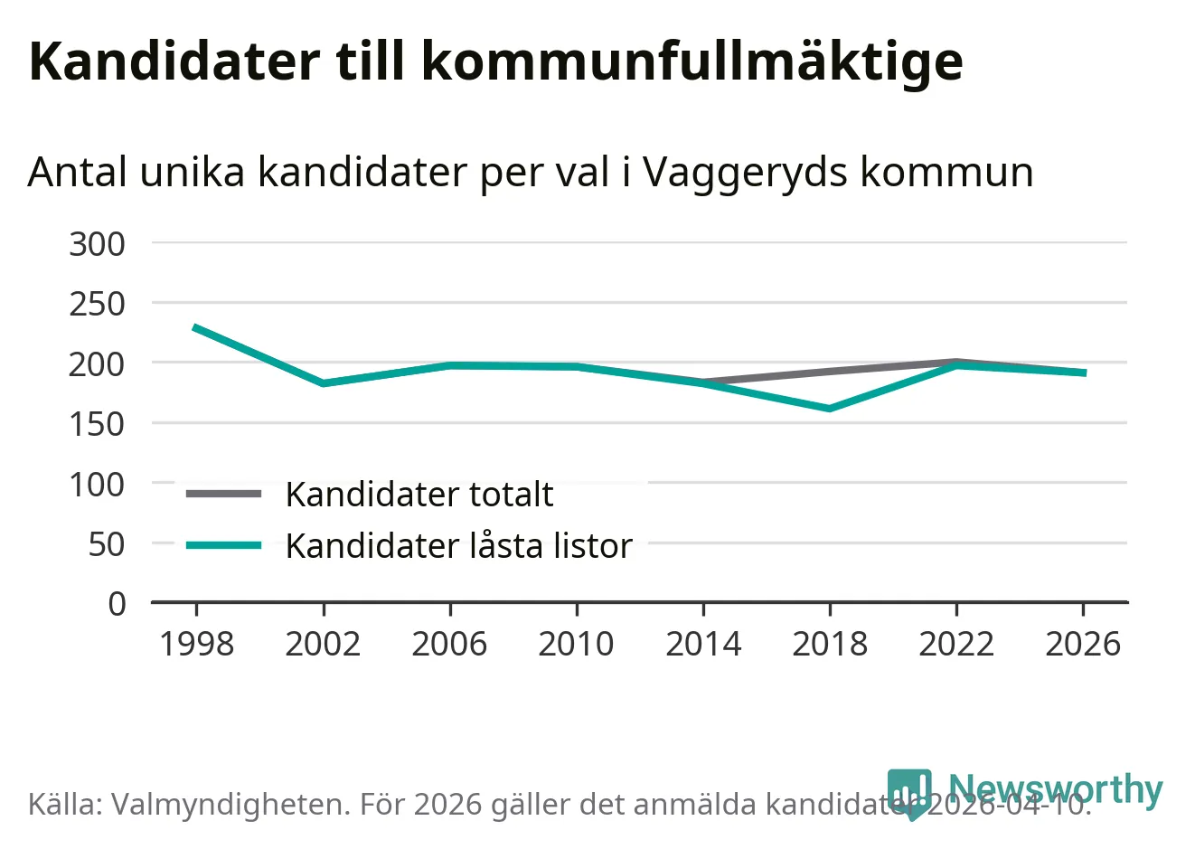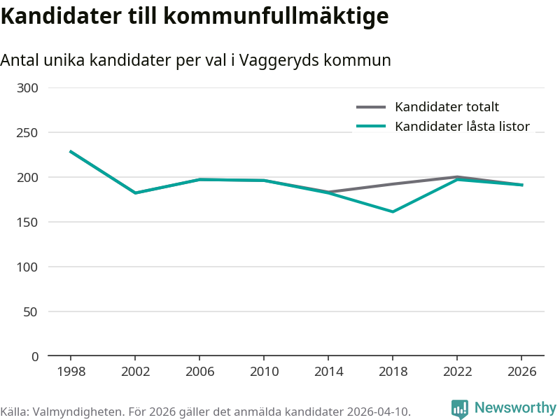 På torsdagen var det deadline för partier med låsta listor att registrera sina kandidater inför höstens val. Till valet till kommunfullmäktige i Vaggeryd är 191 kandidater anmälda på sådana listor, vilket är sex färre än i valet 2022.