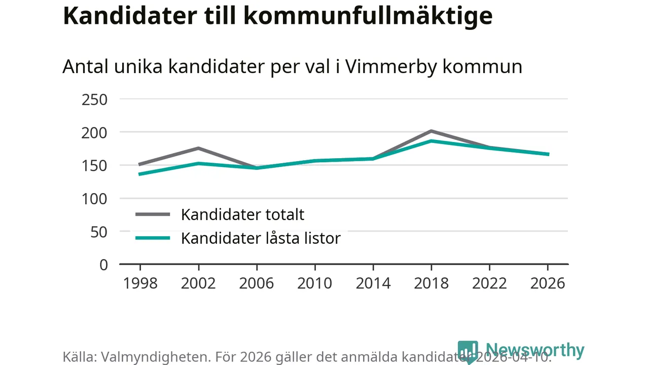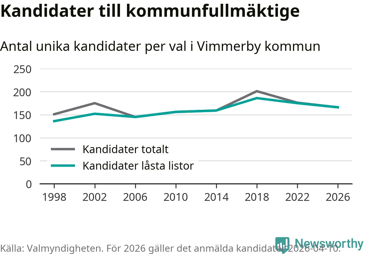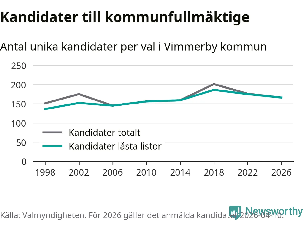 På torsdagen var det deadline för partier med låsta listor att registrera sina kandidater inför höstens val. Till valet till kommunfullmäktige i Vimmerby är 166 kandidater anmälda på sådana listor, vilket är nio färre än i valet 2022.