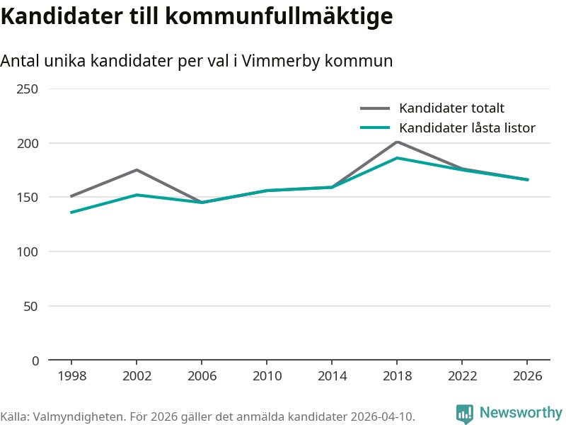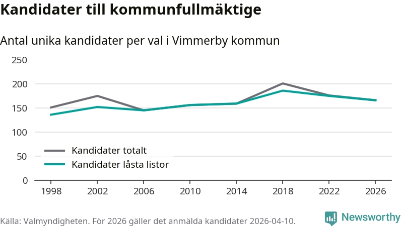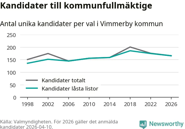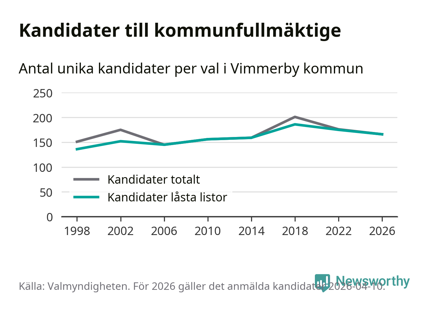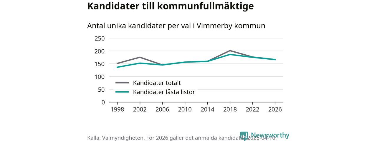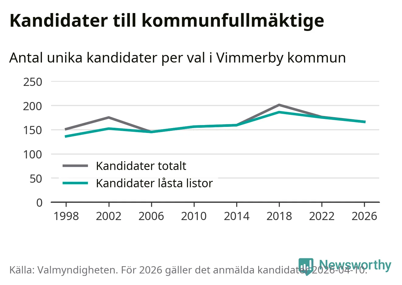 På torsdagen var det deadline för partier med låsta listor att registrera sina kandidater inför höstens val. Till valet till kommunfullmäktige i Vimmerby är 166 kandidater anmälda på sådana listor, vilket är nio färre än i valet 2022.
