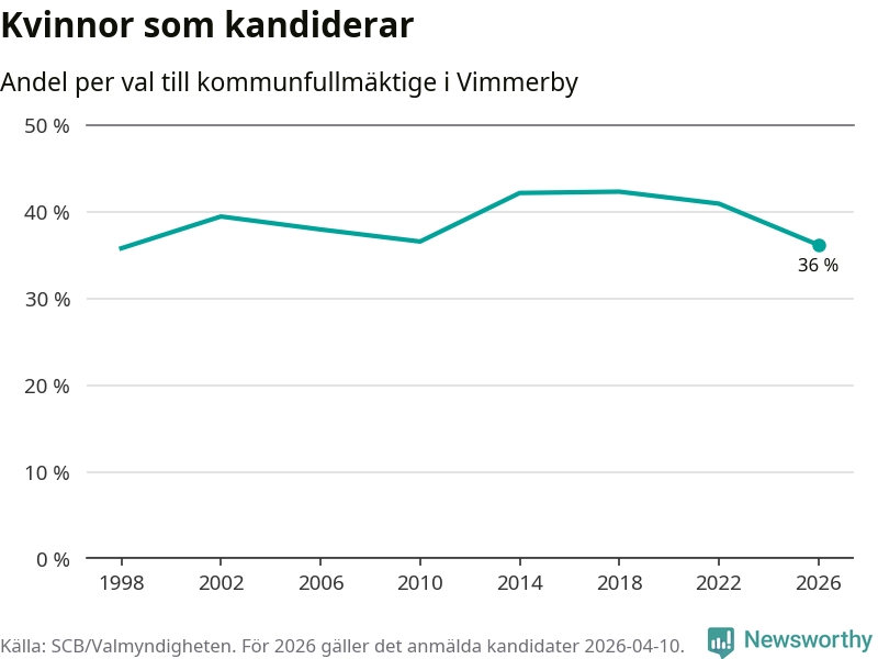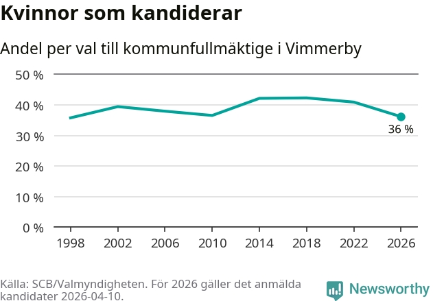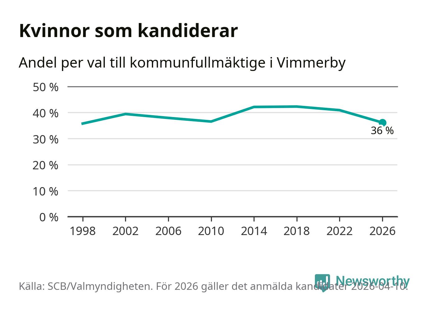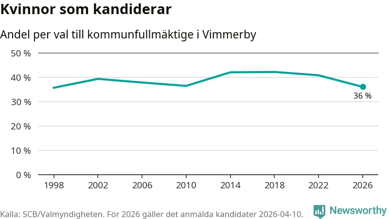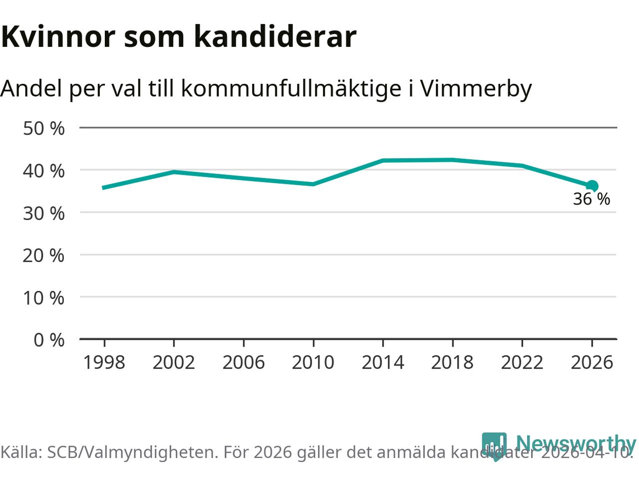 Kvinnorna utgör 36 procent av de hittills anmälda kandidaterna, vilket är den lägsta andelen på listorna till kommunfullmäktige i Vimmerby sedan valet 1998. Vid valet 2018 var 42 procent kvinnor, valet 1998 var motsvarande siffra 36 procent. Vimmerby är en av 264 kommuner i landet där männen utgör en majoritet av kandidaterna på listorna.