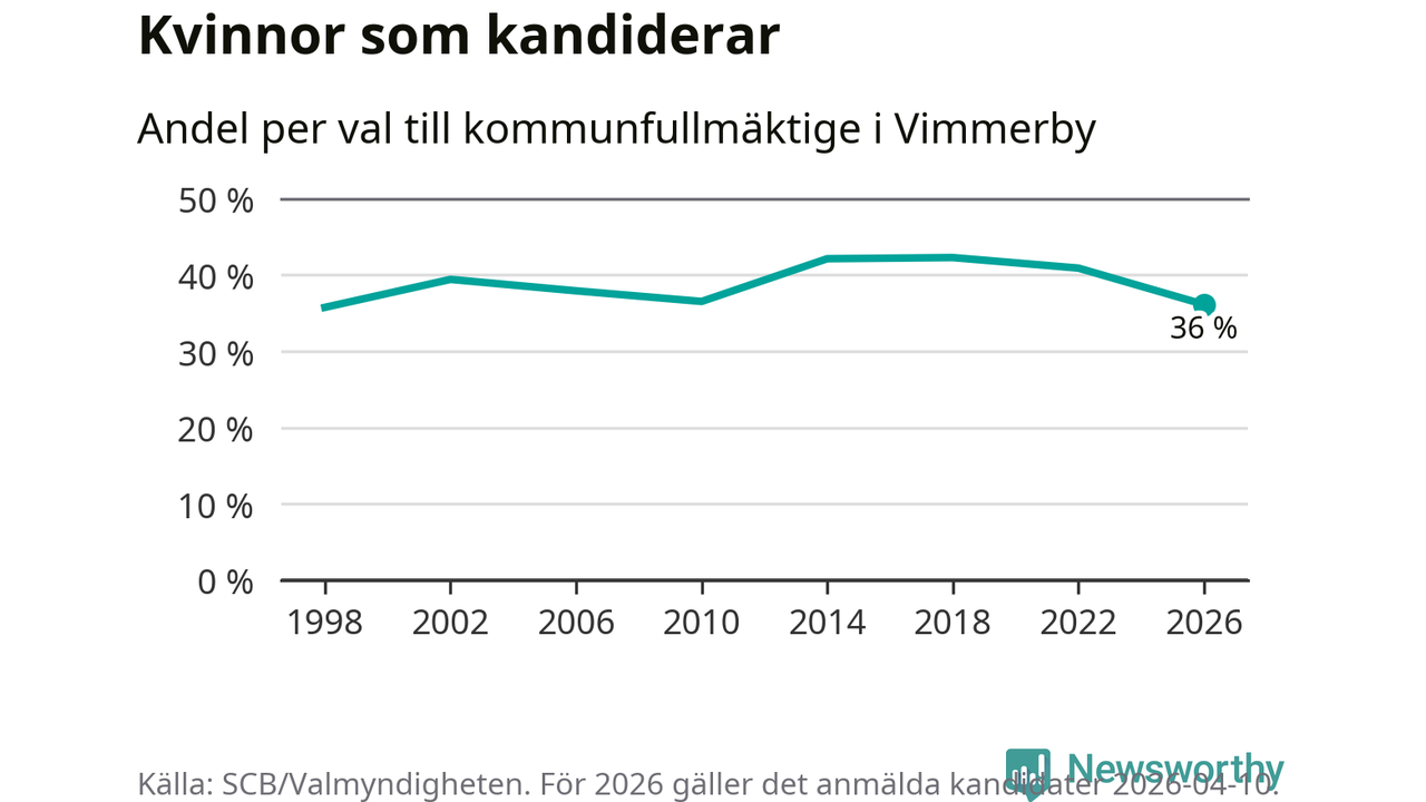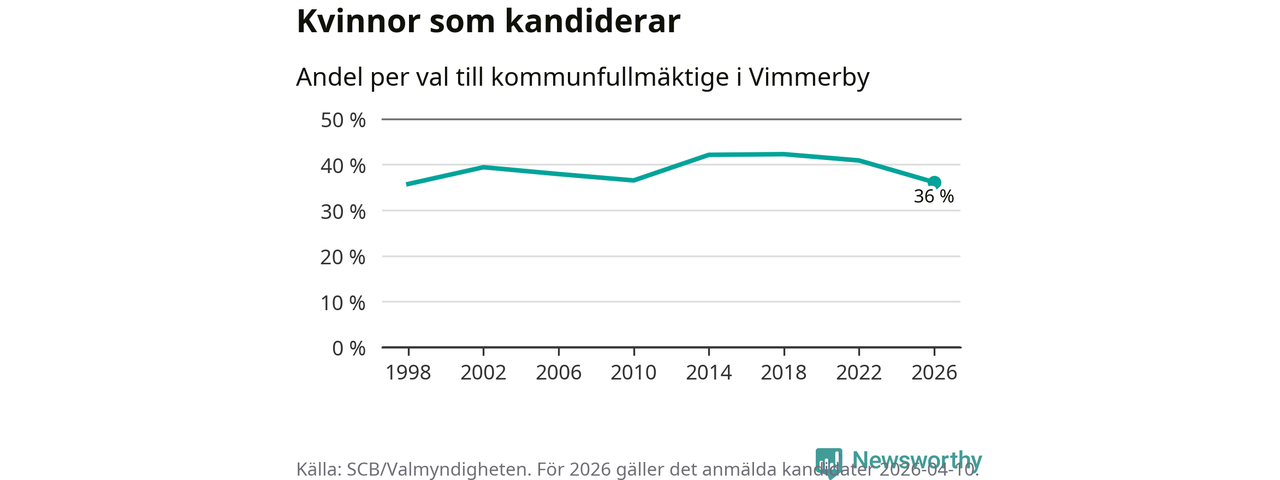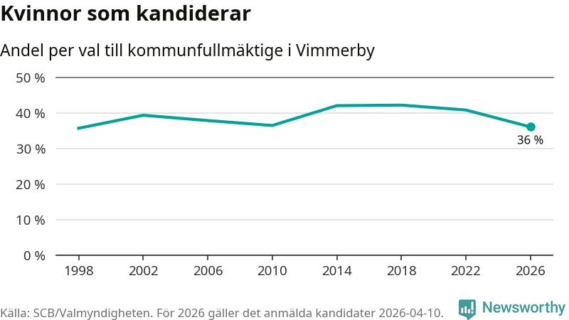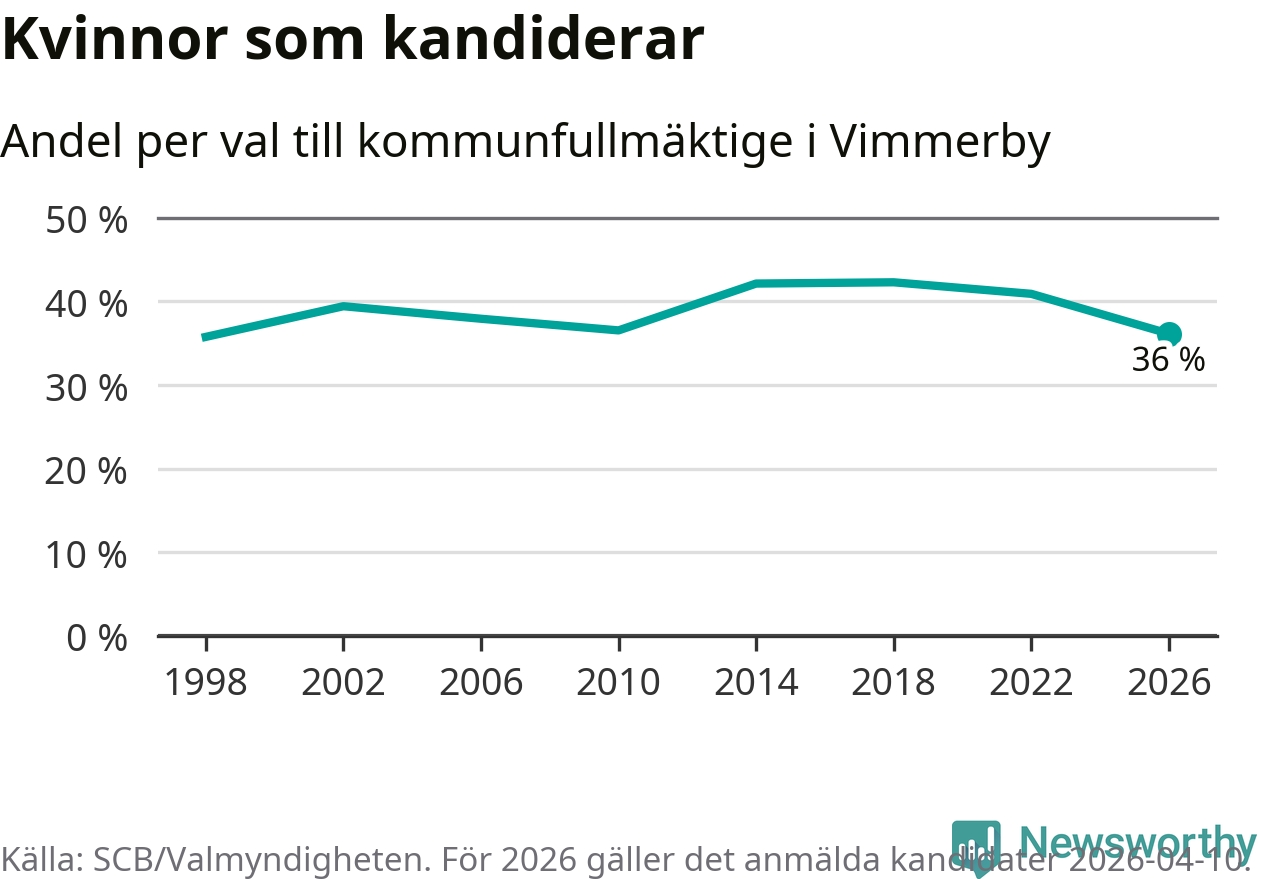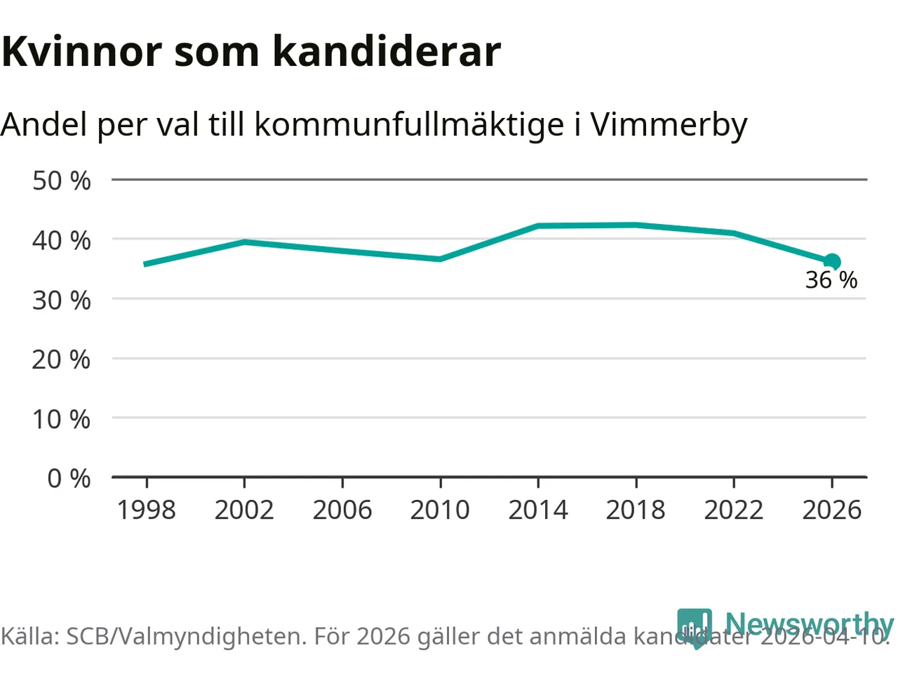 Kvinnorna utgör 36 procent av de hittills anmälda kandidaterna, vilket är den lägsta andelen på listorna till kommunfullmäktige i Vimmerby sedan valet 1998. Vid valet 2018 var 42 procent kvinnor, valet 1998 var motsvarande siffra 36 procent. Vimmerby är en av 264 kommuner i landet där männen utgör en majoritet av kandidaterna på listorna.
