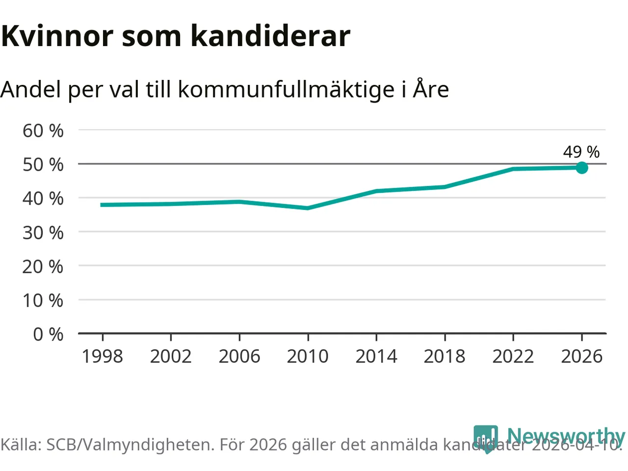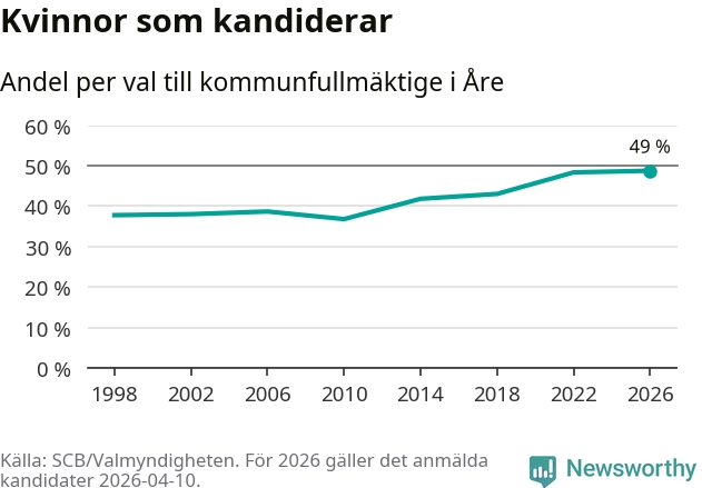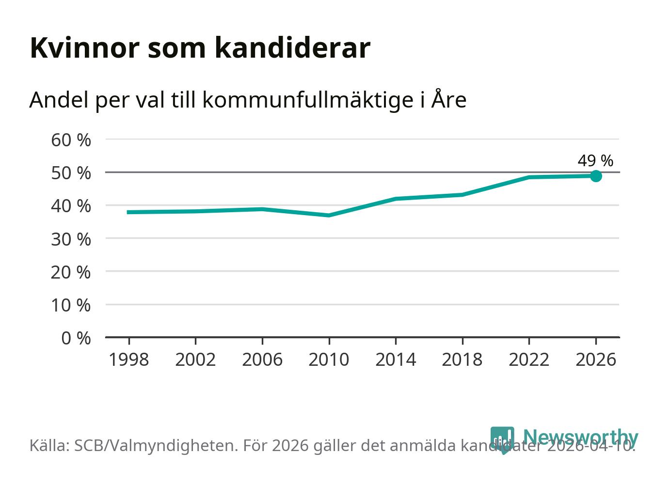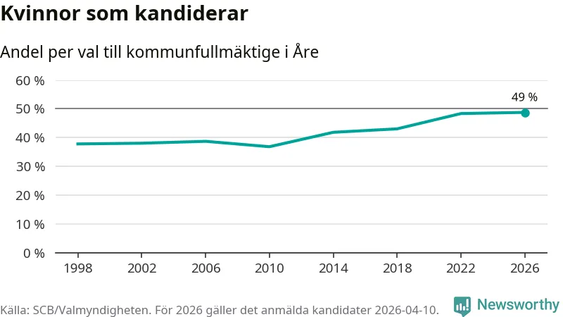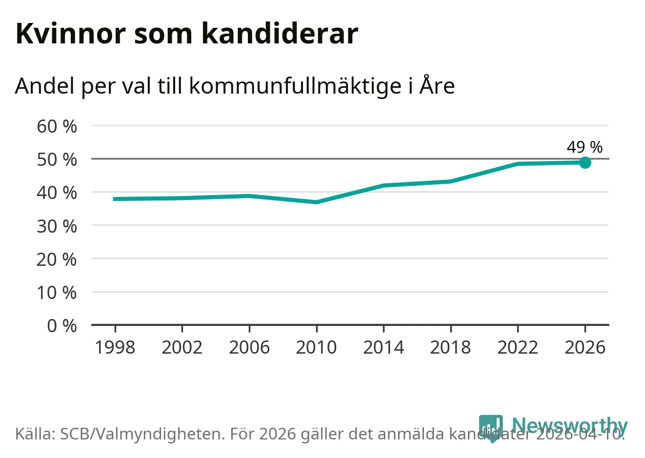 Kvinnorna utgör 49 procent av de hittills anmälda kandidaterna, vilket är den högsta andelen på listorna till kommunfullmäktige i Åre sedan åtminstone valet 1998. Andelen kvinnor har ökat i Åre under de senaste tre valen och ökningen ser alltså ut att fortsätta i år. Åre är en av 264 kommuner i landet där männen utgör en majoritet av kandidaterna på listorna.