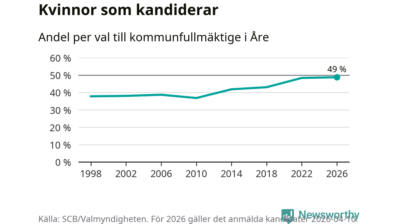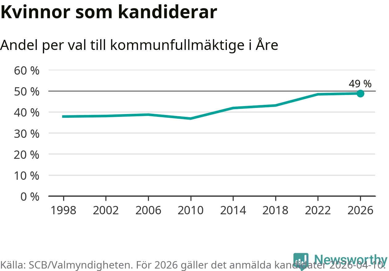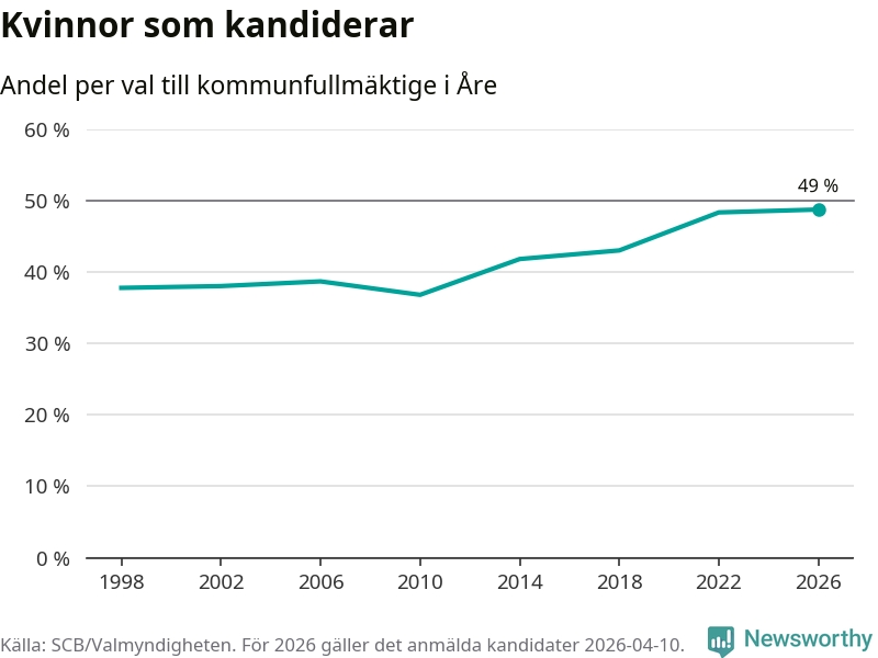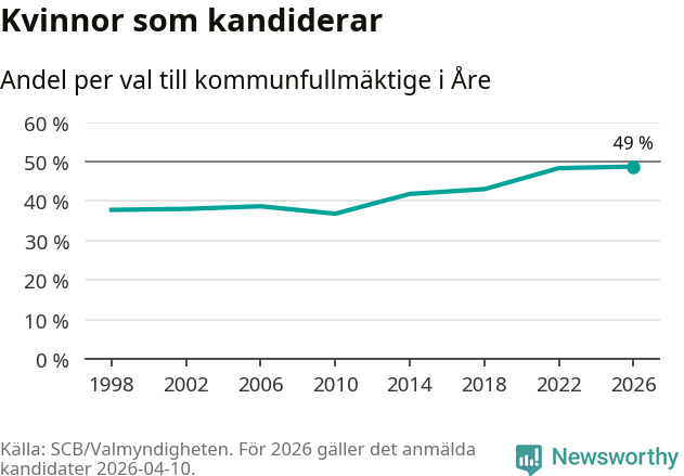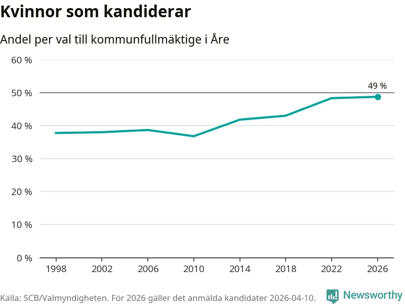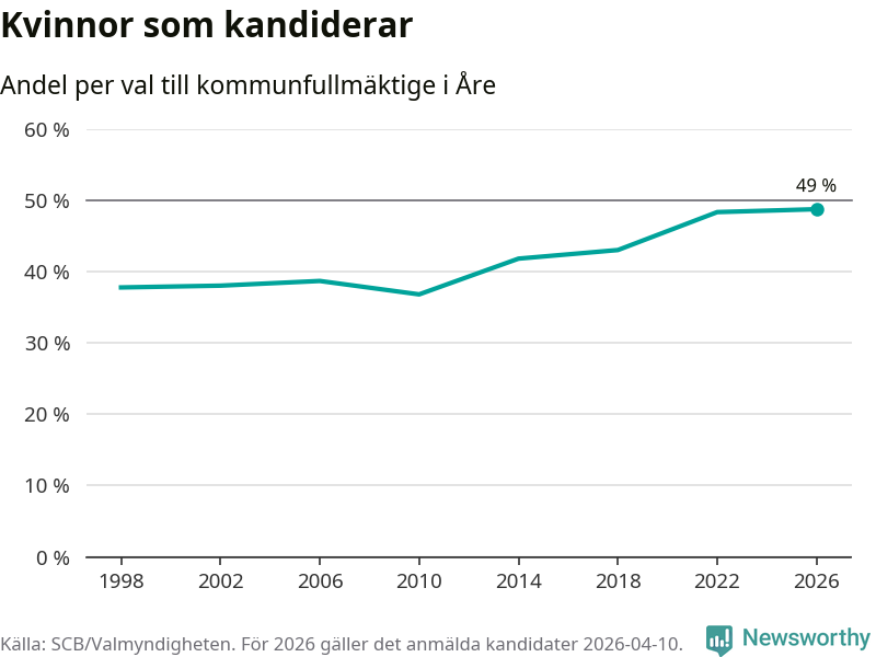Kvinnorna utgör 49 procent av de hittills anmälda kandidaterna, vilket är den högsta andelen på listorna till kommunfullmäktige i Åre sedan åtminstone valet 1998. Andelen kvinnor har ökat i Åre under de senaste tre valen och ökningen ser alltså ut att fortsätta i år. Åre är en av 264 kommuner i landet där männen utgör en majoritet av kandidaterna på listorna.