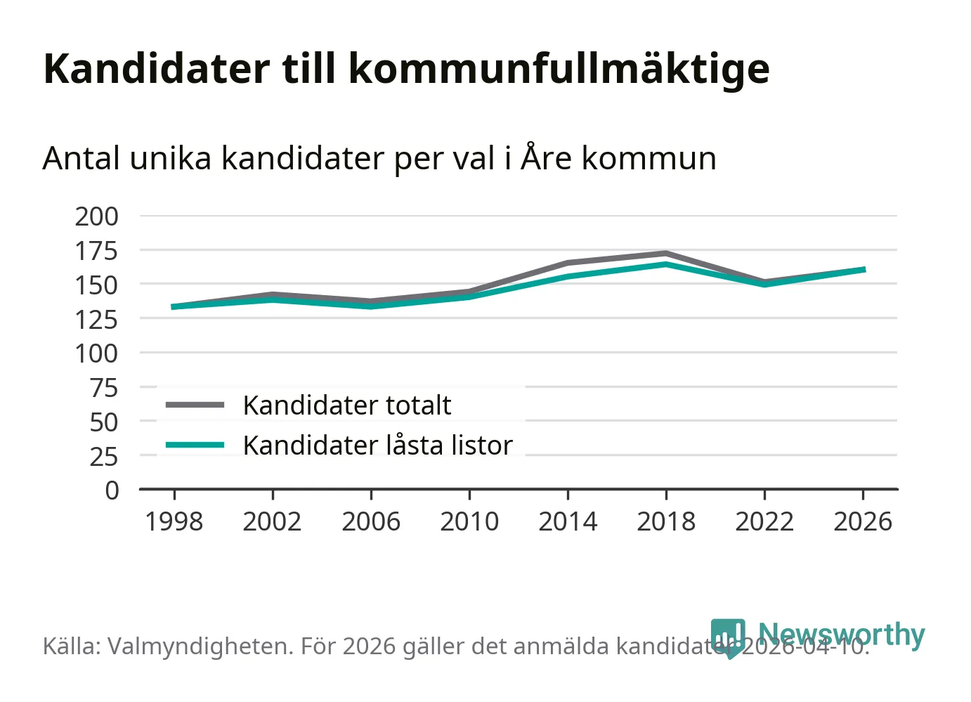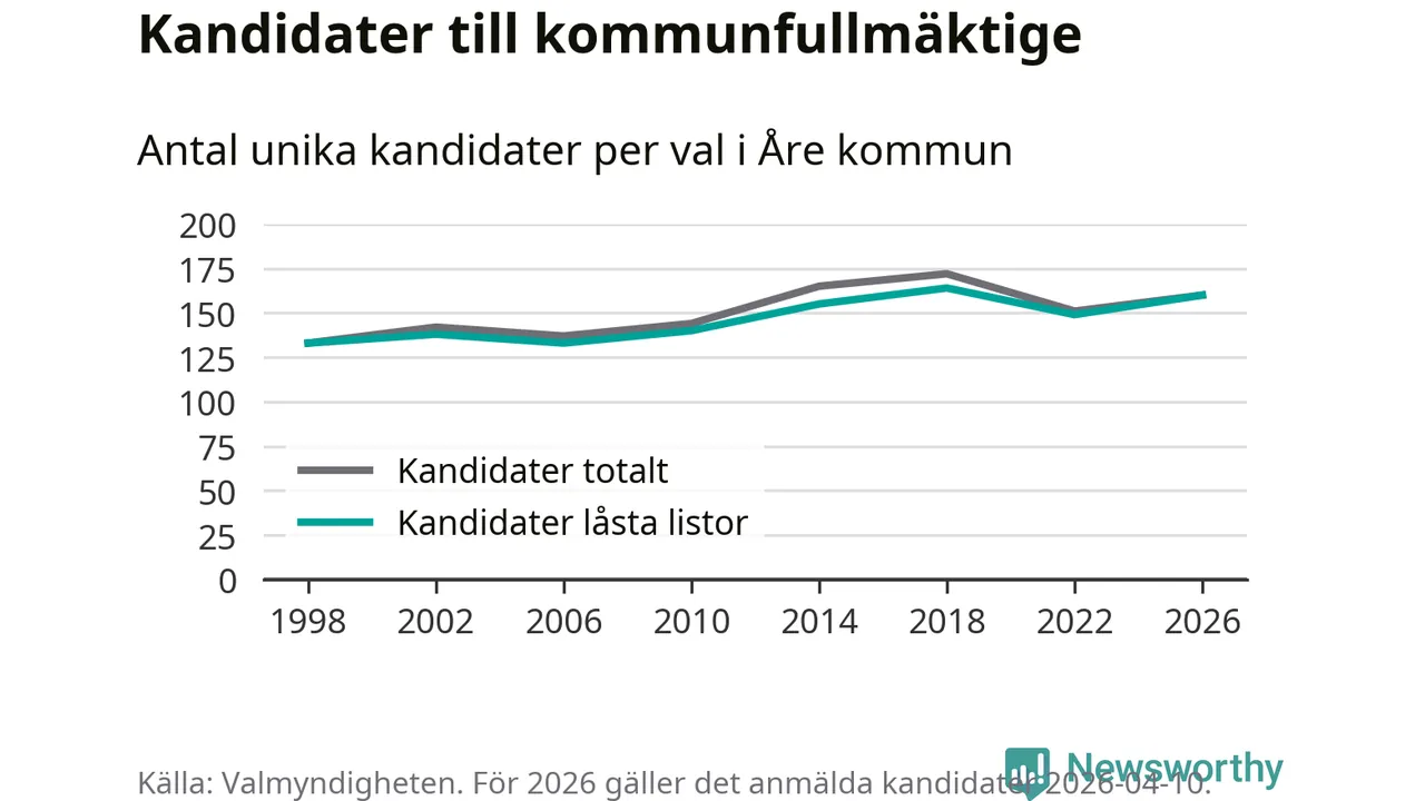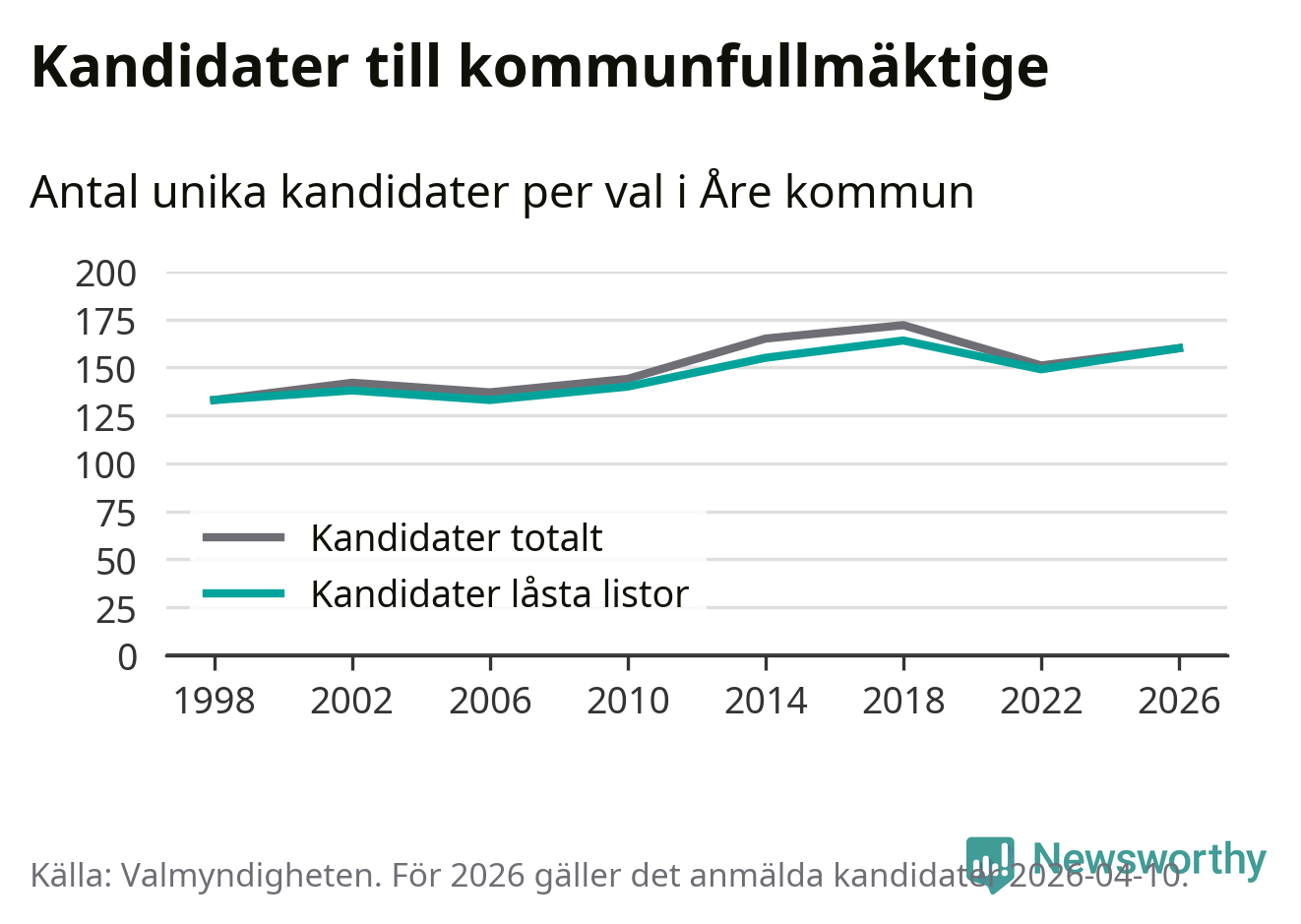 På torsdagen var det deadline för partier med låsta listor att registrera sina kandidater inför höstens val. Till valet till kommunfullmäktige i Åre är 160 kandidater anmälda på sådana listor, vilket är elva fler än i valet 2022.