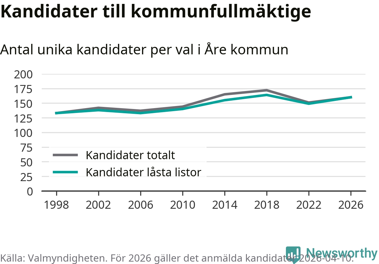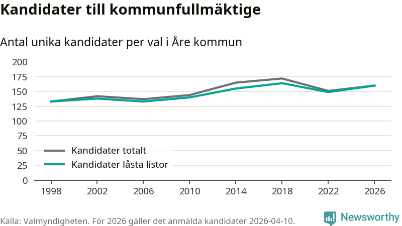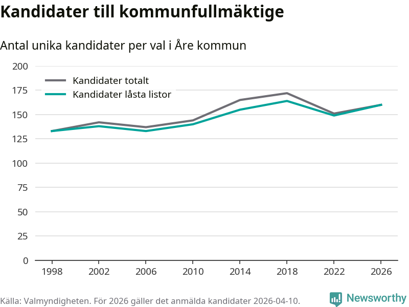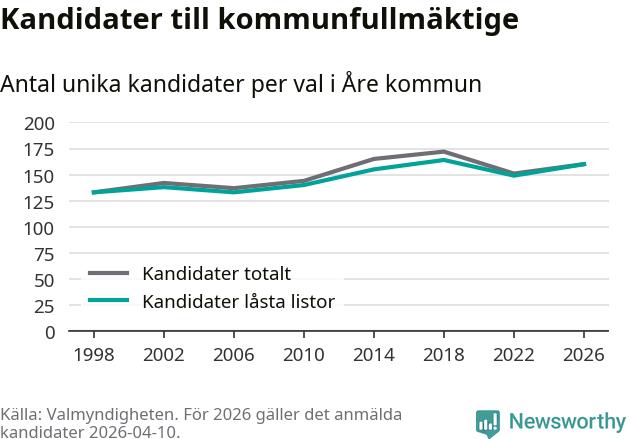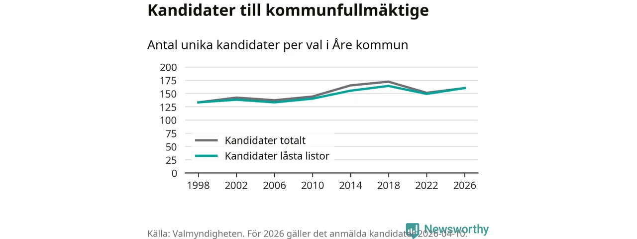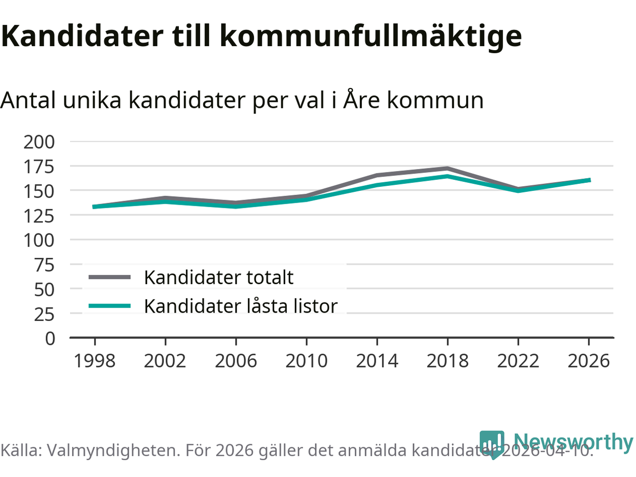 På torsdagen var det deadline för partier med låsta listor att registrera sina kandidater inför höstens val. Till valet till kommunfullmäktige i Åre är 160 kandidater anmälda på sådana listor, vilket är elva fler än i valet 2022.