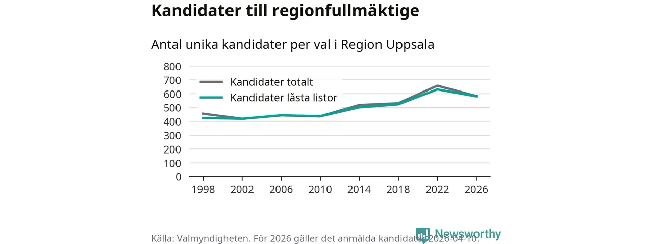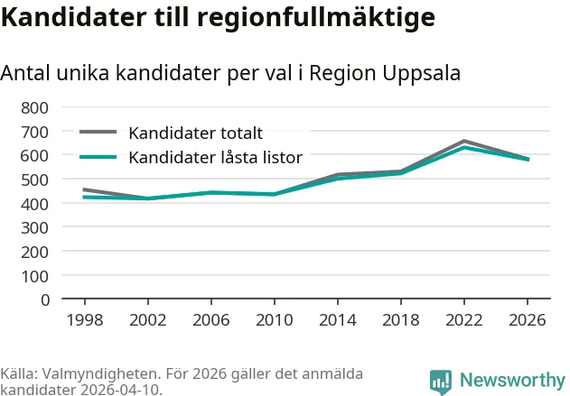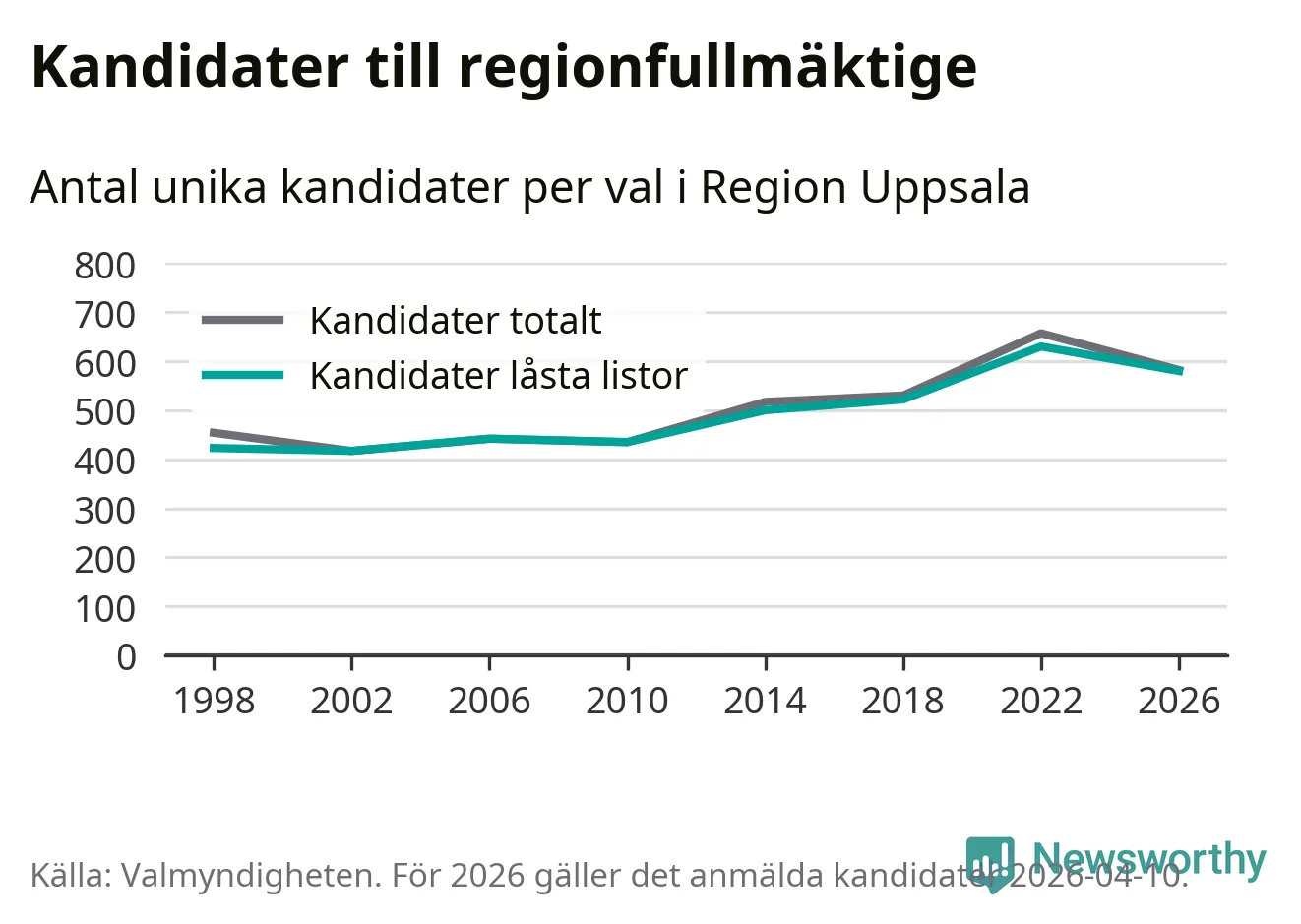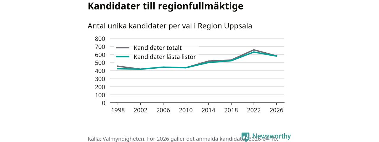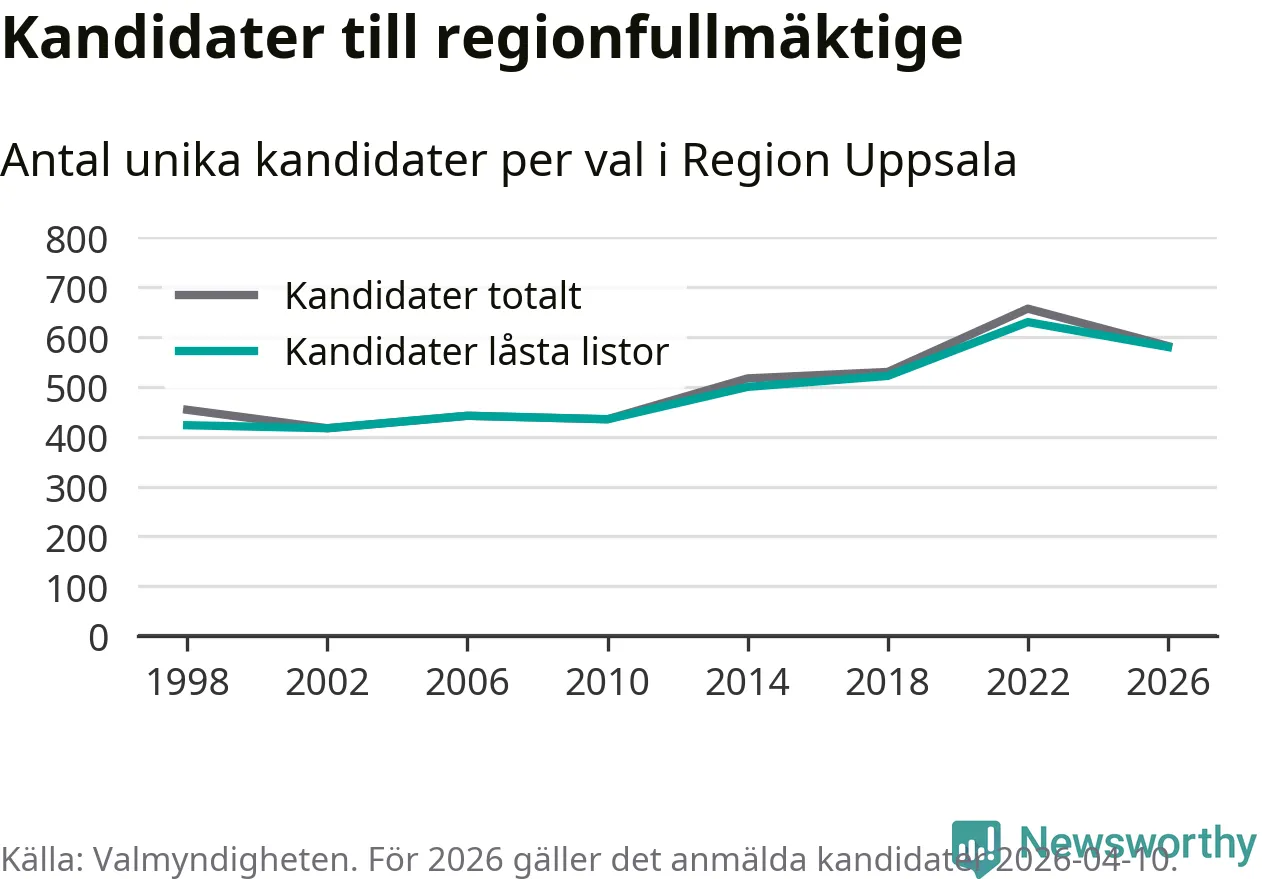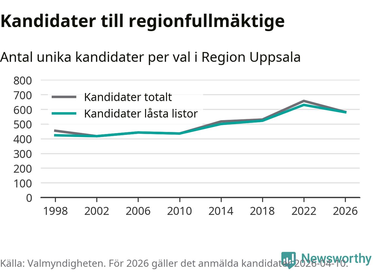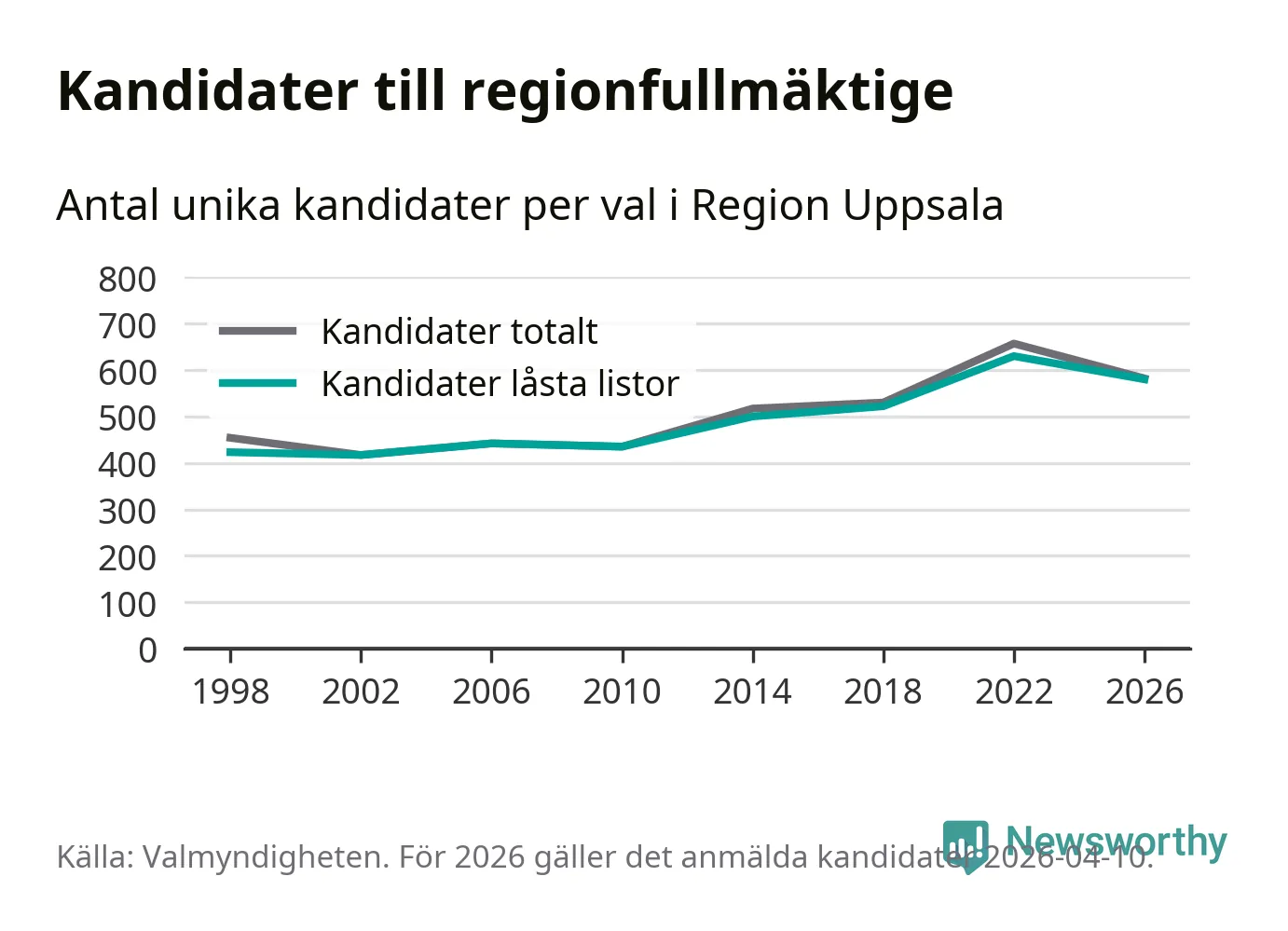 På torsdagen var det deadline för partier med låsta listor att registrera sina kandidater inför höstens val. Till valet till regionfullmäktige i Region Uppsala är 580 kandidater anmälda på sådana listor, vilket är 50 färre än i valet 2022.